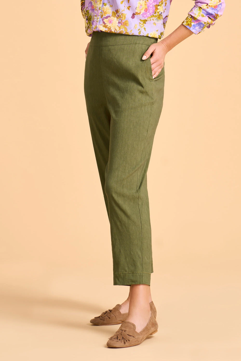 This tapered pant in Olive comes in an ever-flattering straight silhouette with a chic 7/8 length. With an easy pull-on style and elasticated waistband, you’ll find the perfect combination of ease, elegance and comfort.