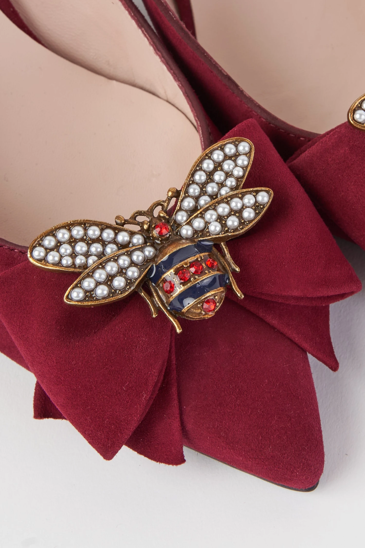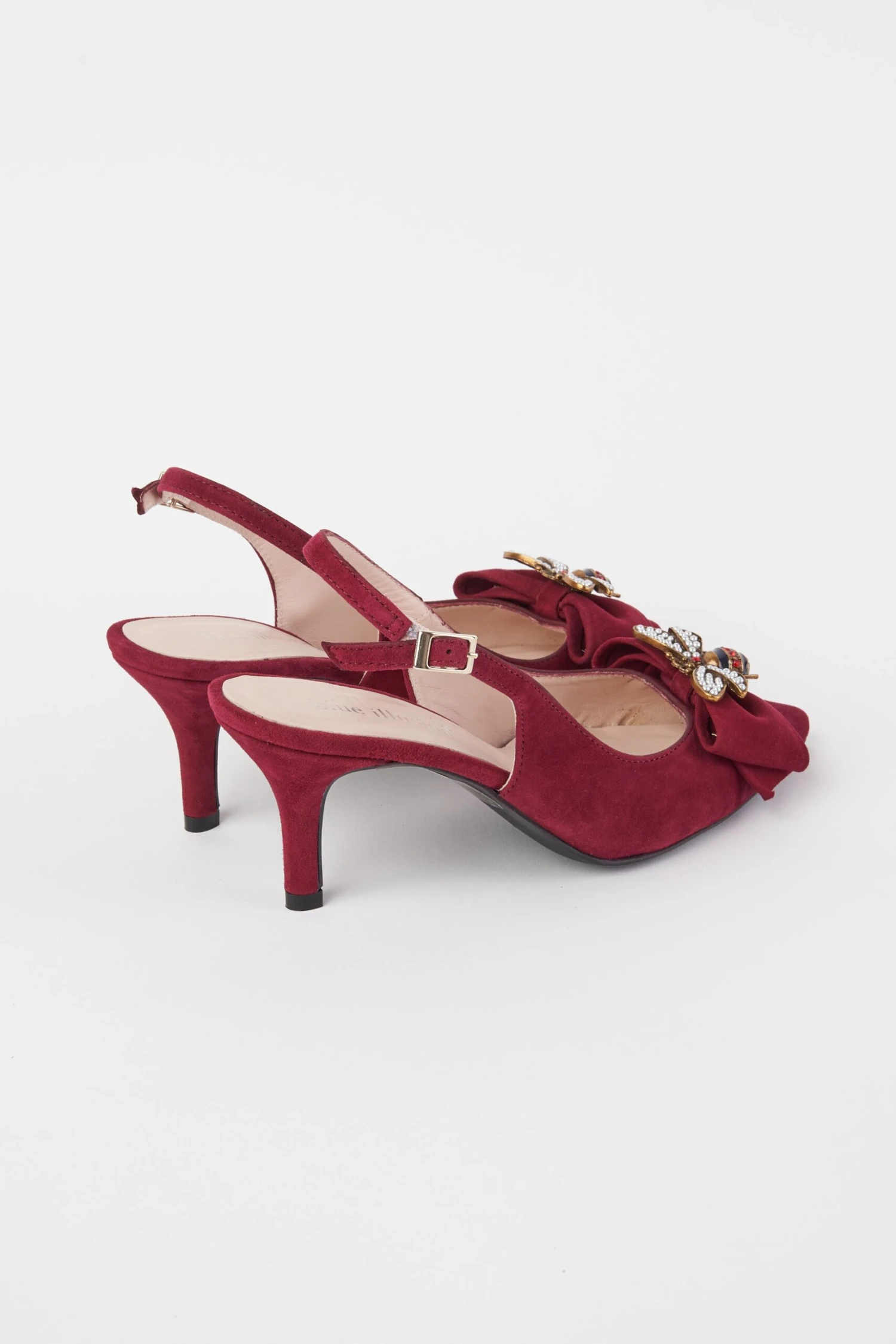 Glamour re-emerges with a colourful update to our popular Abbey Slingback. Now in Burgundy, this shoe features a jewelled bee and suede bow detail. Crafted in Spain with a comfortable cushioned sole and easy-to-adjust buckle, elevate your special occasion outfit now.