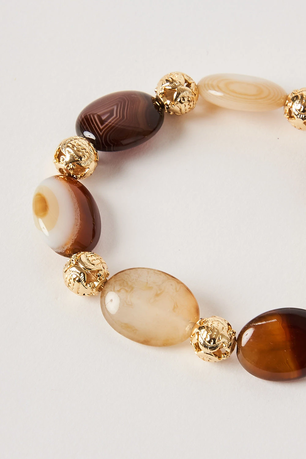 With its stretch elastic base, the Agate Gemstone Bracelet is easy to slip on and go. Perfect for pairing with a neutral-coloured outfit, you’ll love the hammered gold beads and statement agate stones.