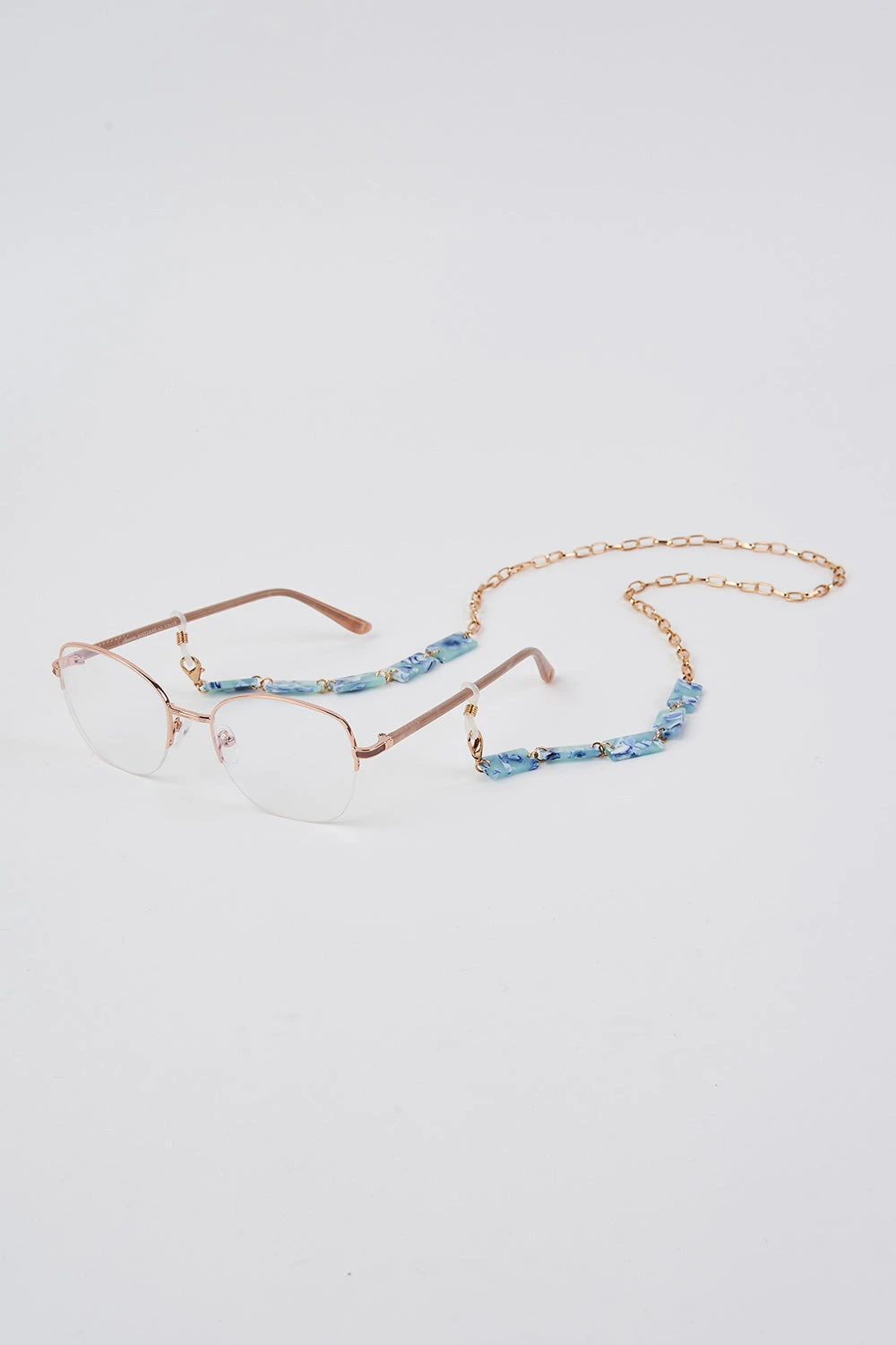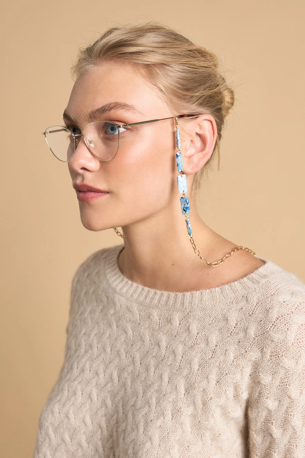 An instant, decorative update to your glasses or sunglasses est ici with our fun Aqua Resin Glasses Chain. Lightweight and featuring a combination of rectangular, aqua-toned beads paired with a gold link chain, easily adjust the rubber attachments of this accessory to suit your frames and never misplace your glasses again!