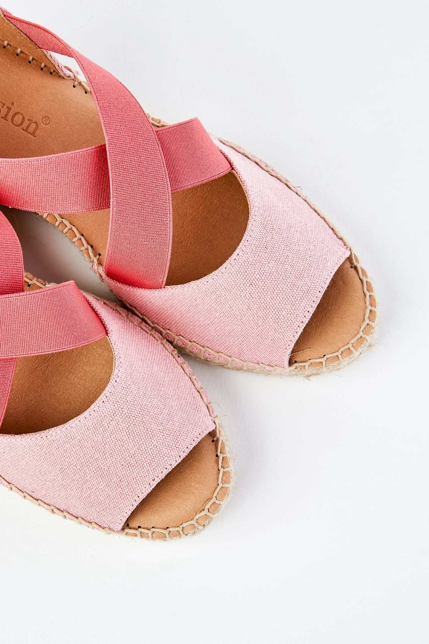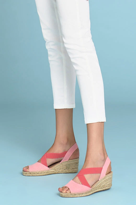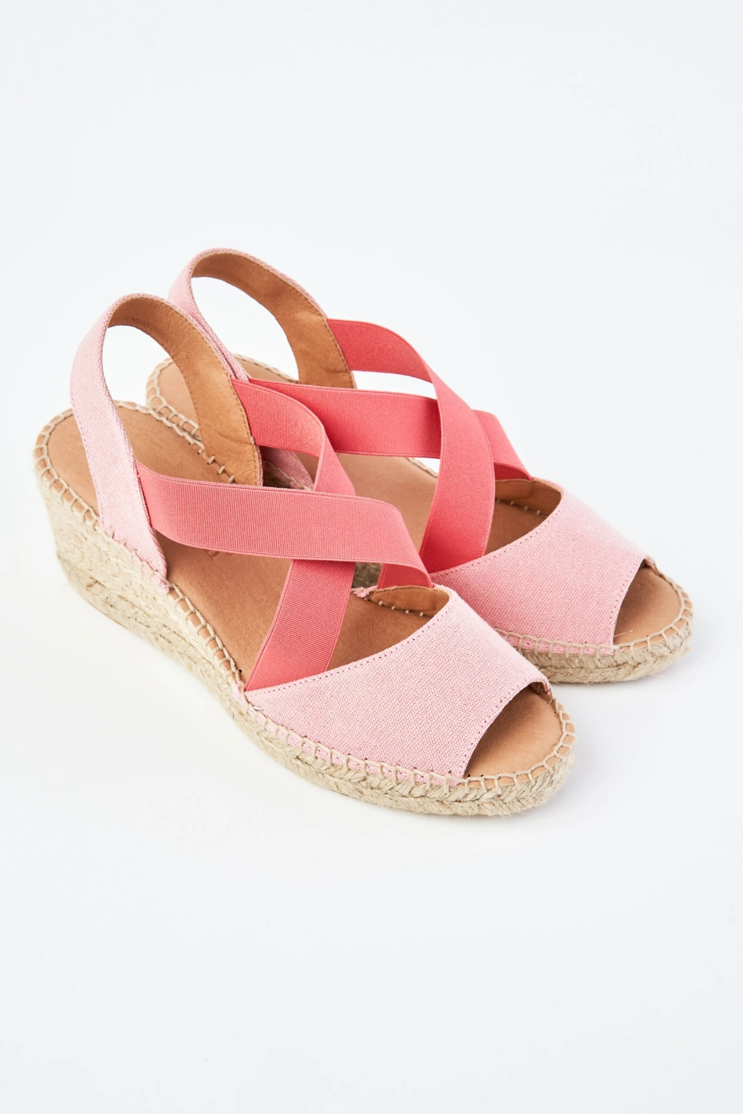 Made in Spain, this charmant espadrille showcases the Icy Pink and Coral colours of our Grasse collection. Featuring a fashionable cross strap, comfortable cushioned sole and sling back style, this espadrille will soon become an everyday favori.