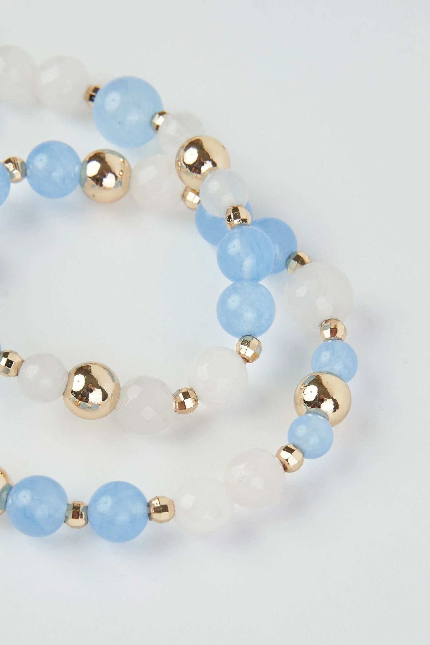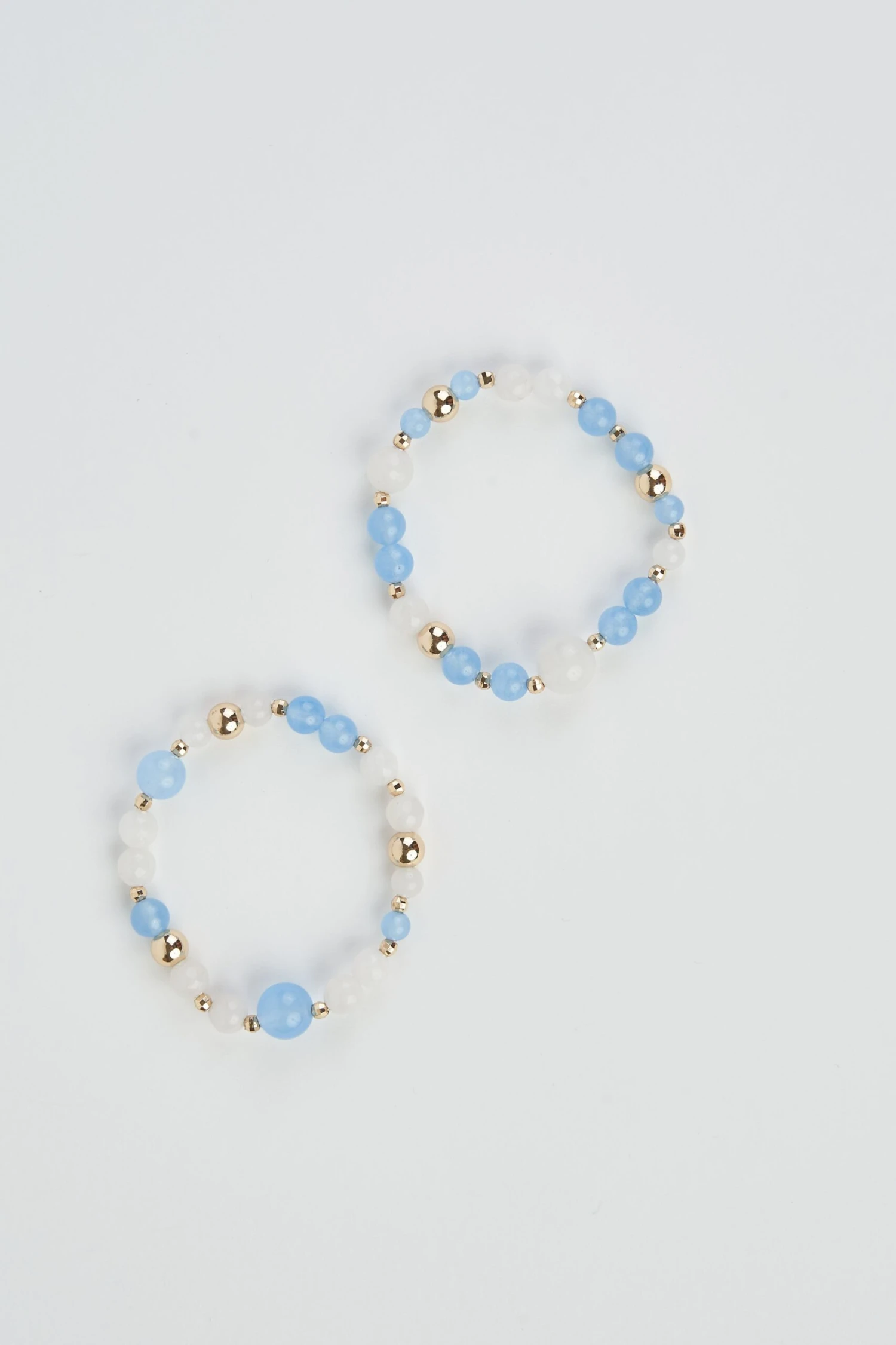 Our Bauble Bracelet Set features the Blue and White colours of our Rue des Barres collection. With translucent stones on a comfortable stretch elastic base, stack these beautiful bracelets with other styles to add instant lift to your outfit.