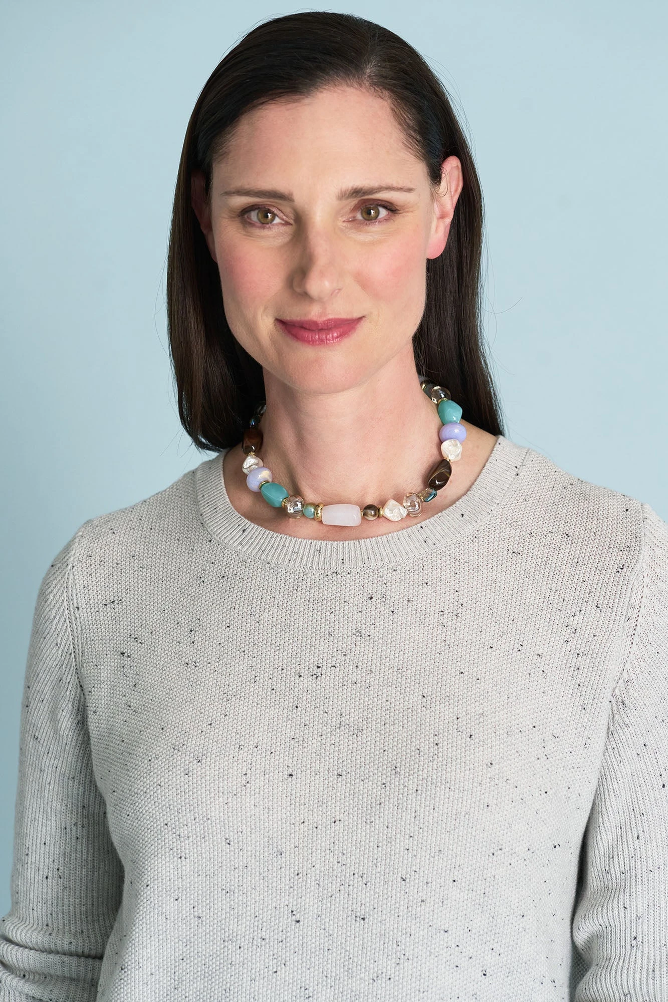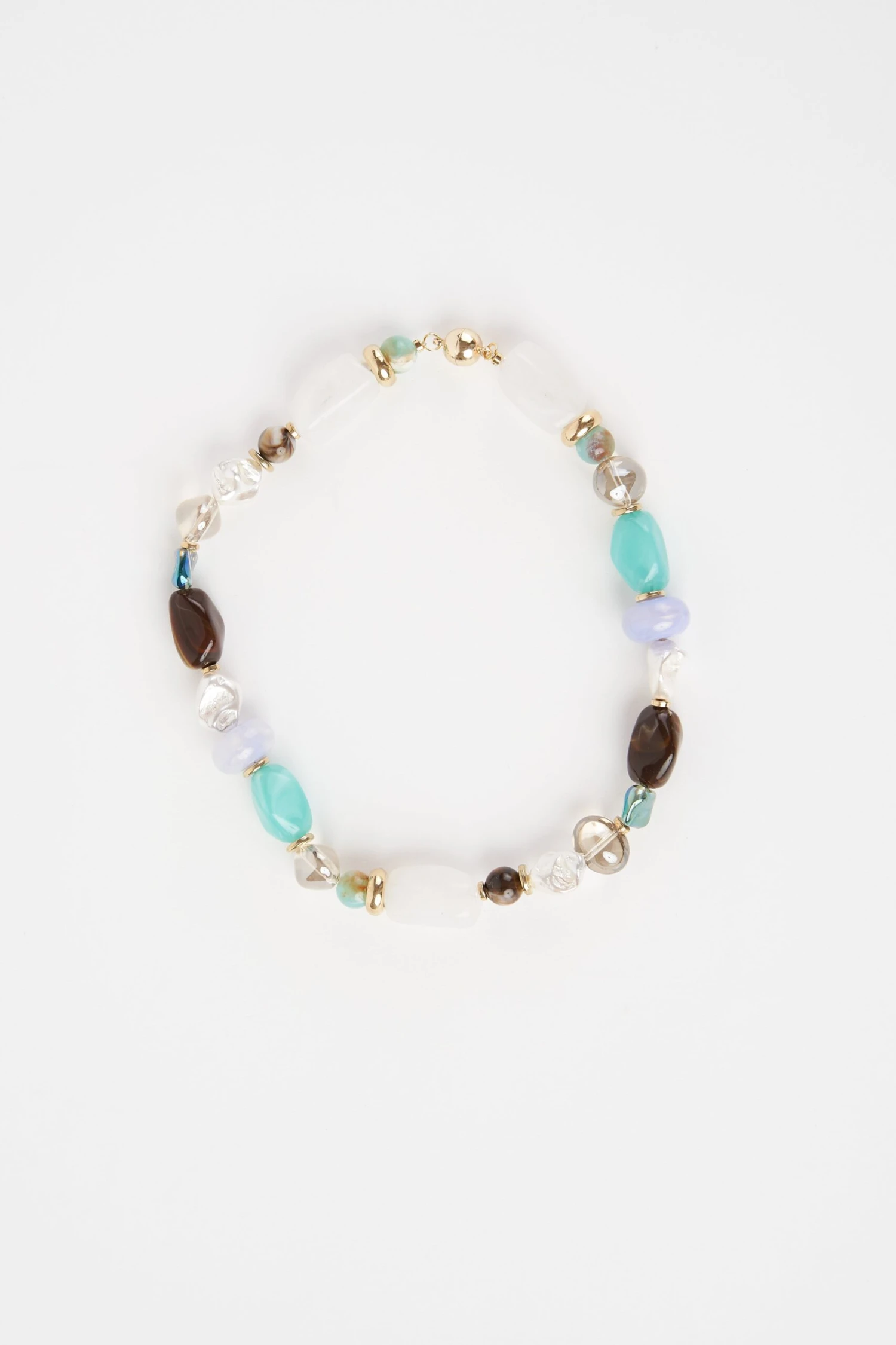Give your outfit that extra lift with our Beaded Collar Necklace. Featuring abstract coated pearls and statement glass beads, this short, chunky necklace is perfect for making a neutral outfit shine. Match this bracelet with our Multi Bead Bracelet to complete the set.
