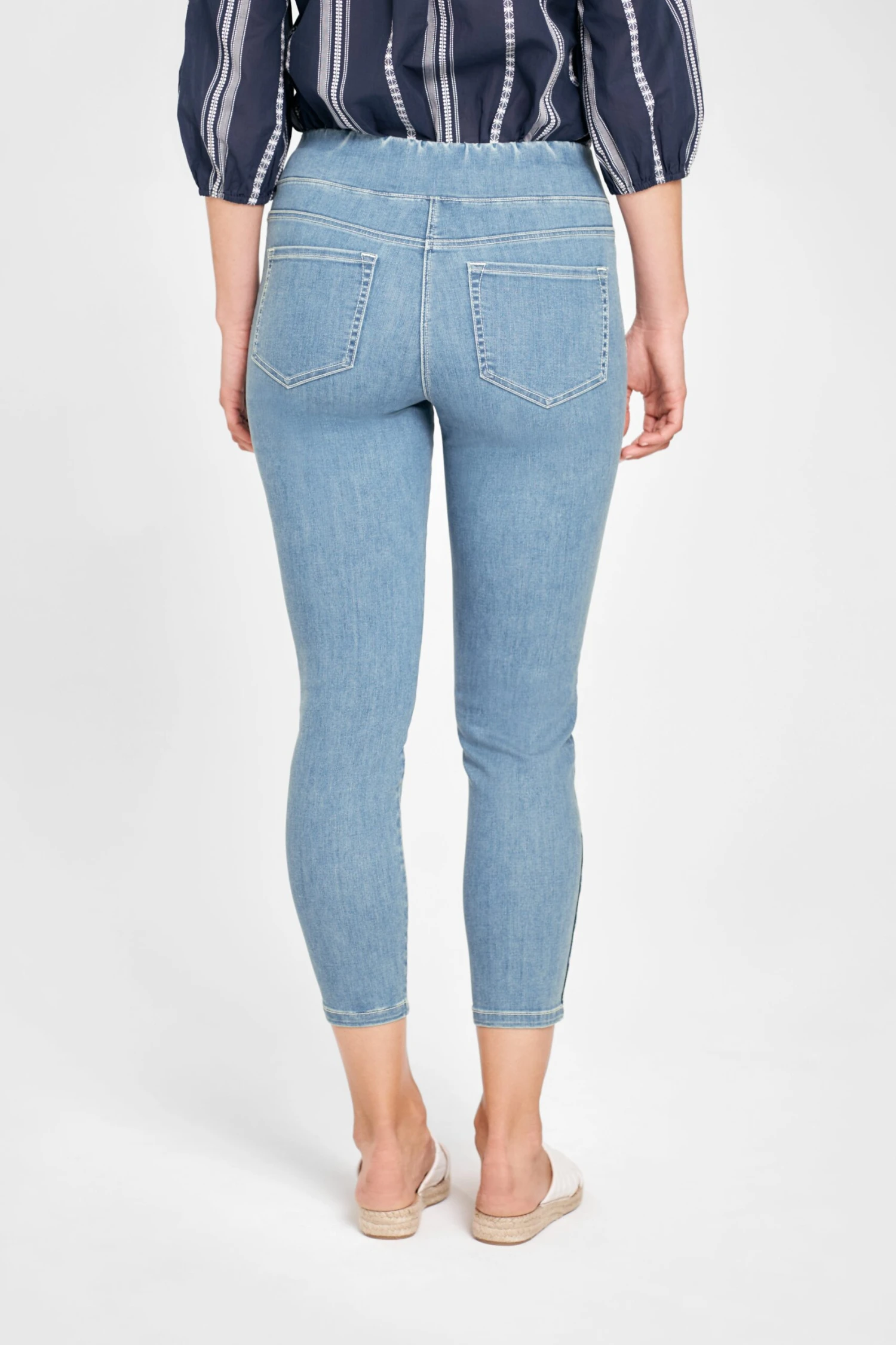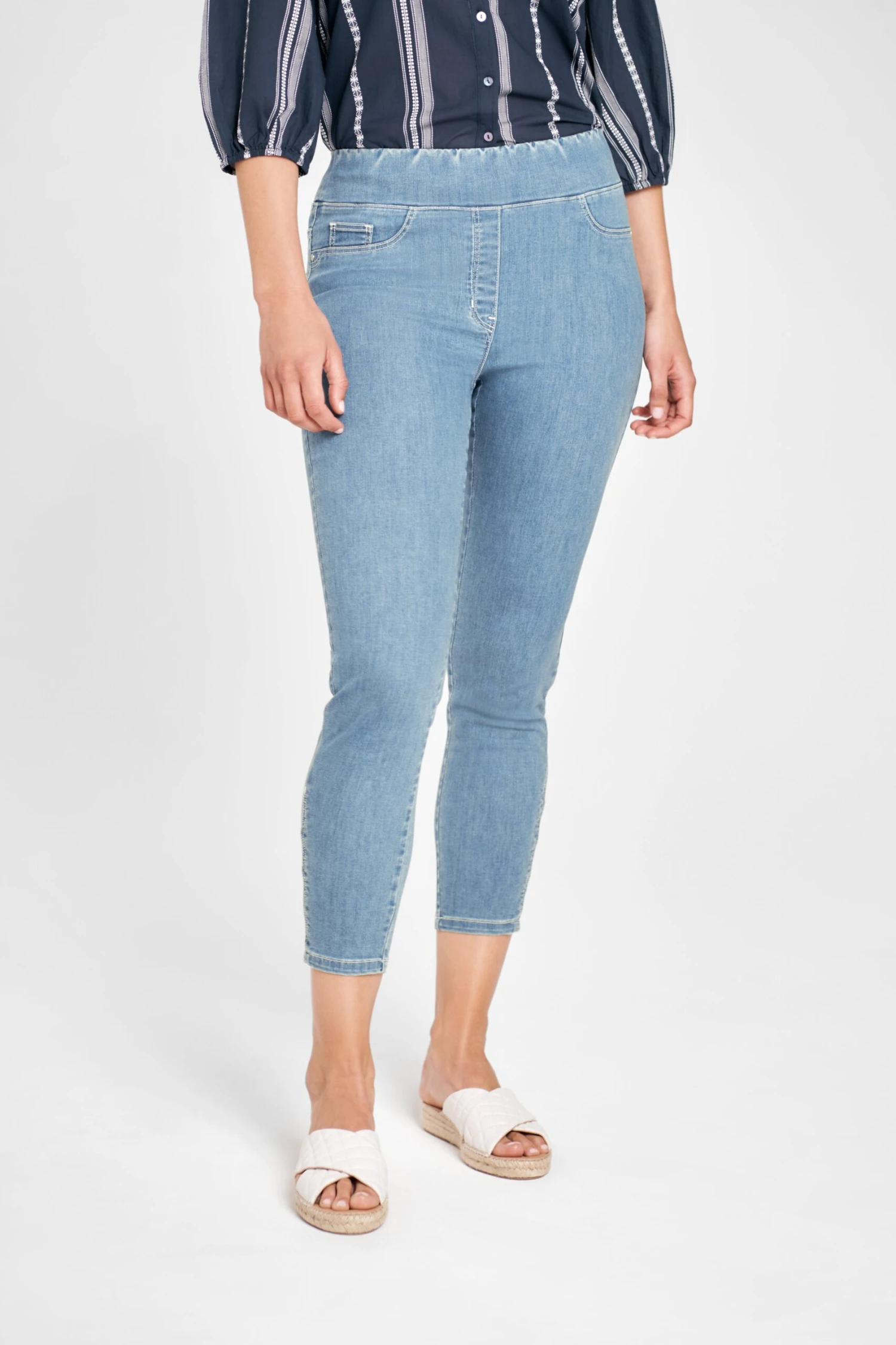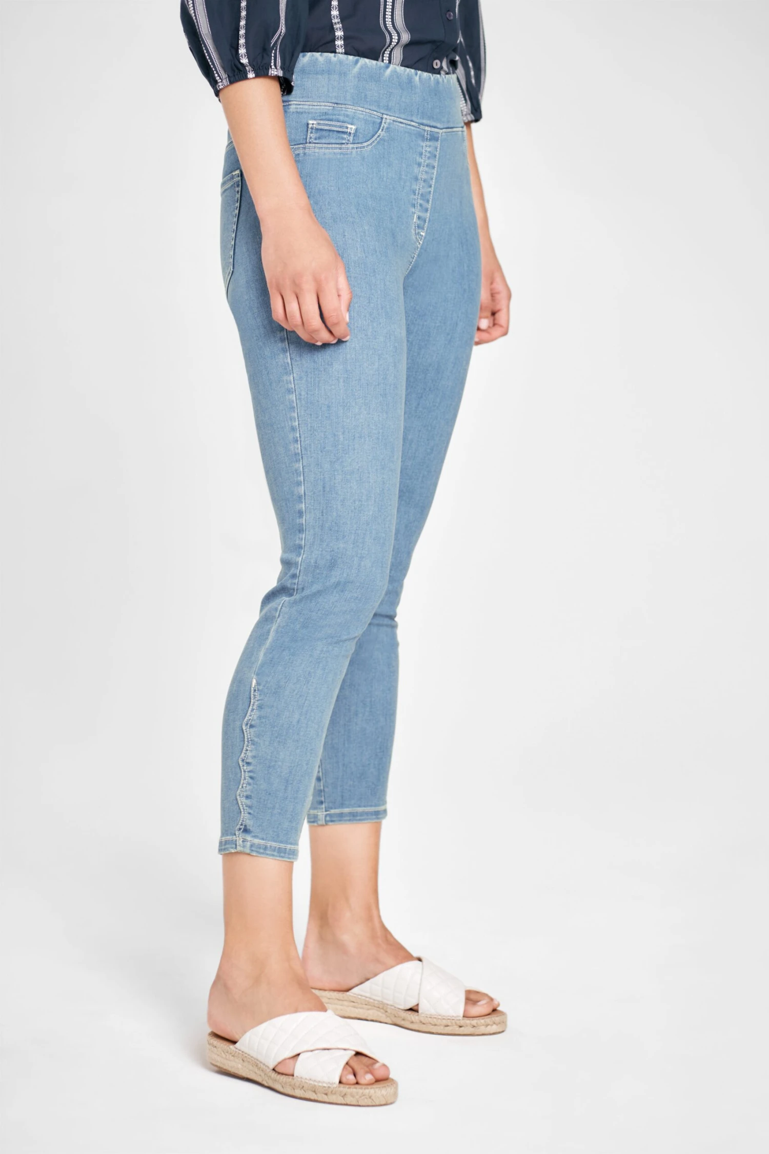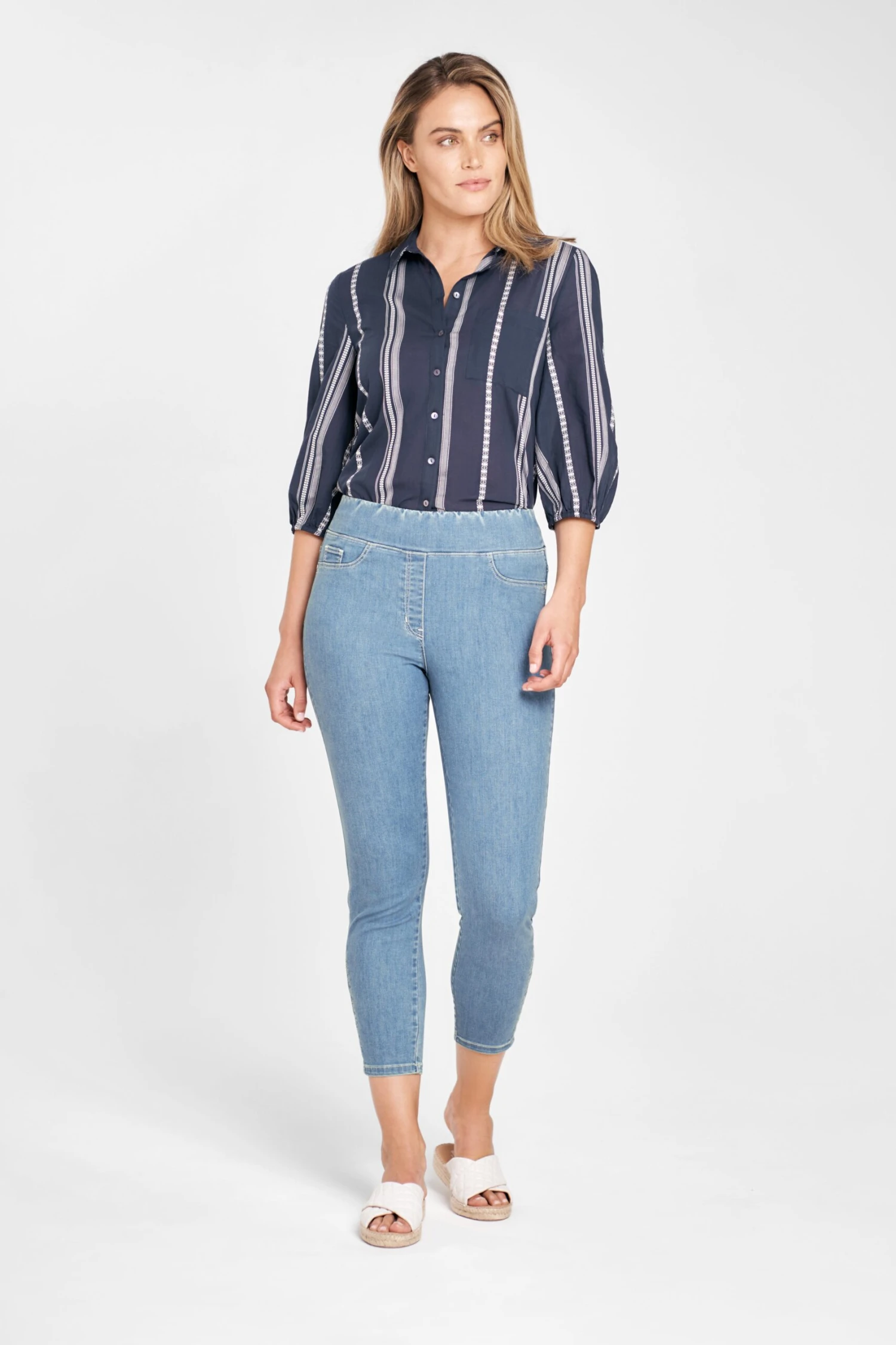 In a medium stone wash, our newest Bengajean is the parfait complementary pant for our Vie A La Plage collection. Featuring all that you love about our ultra-comfortable Bengajean, including a fold-over elasticated waistband, mock front fly and pockets and functional pockets at the back, with a chic scallop side seam detail.
