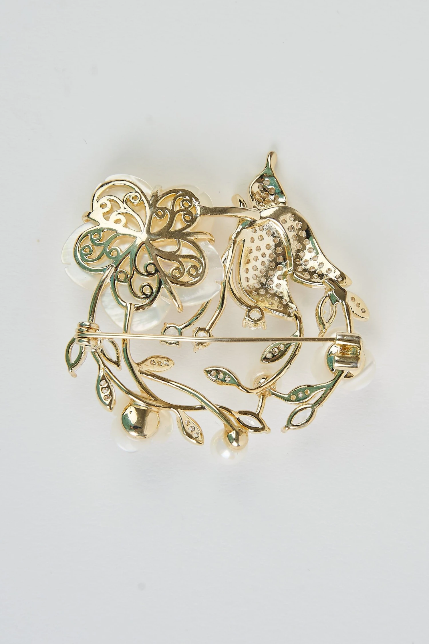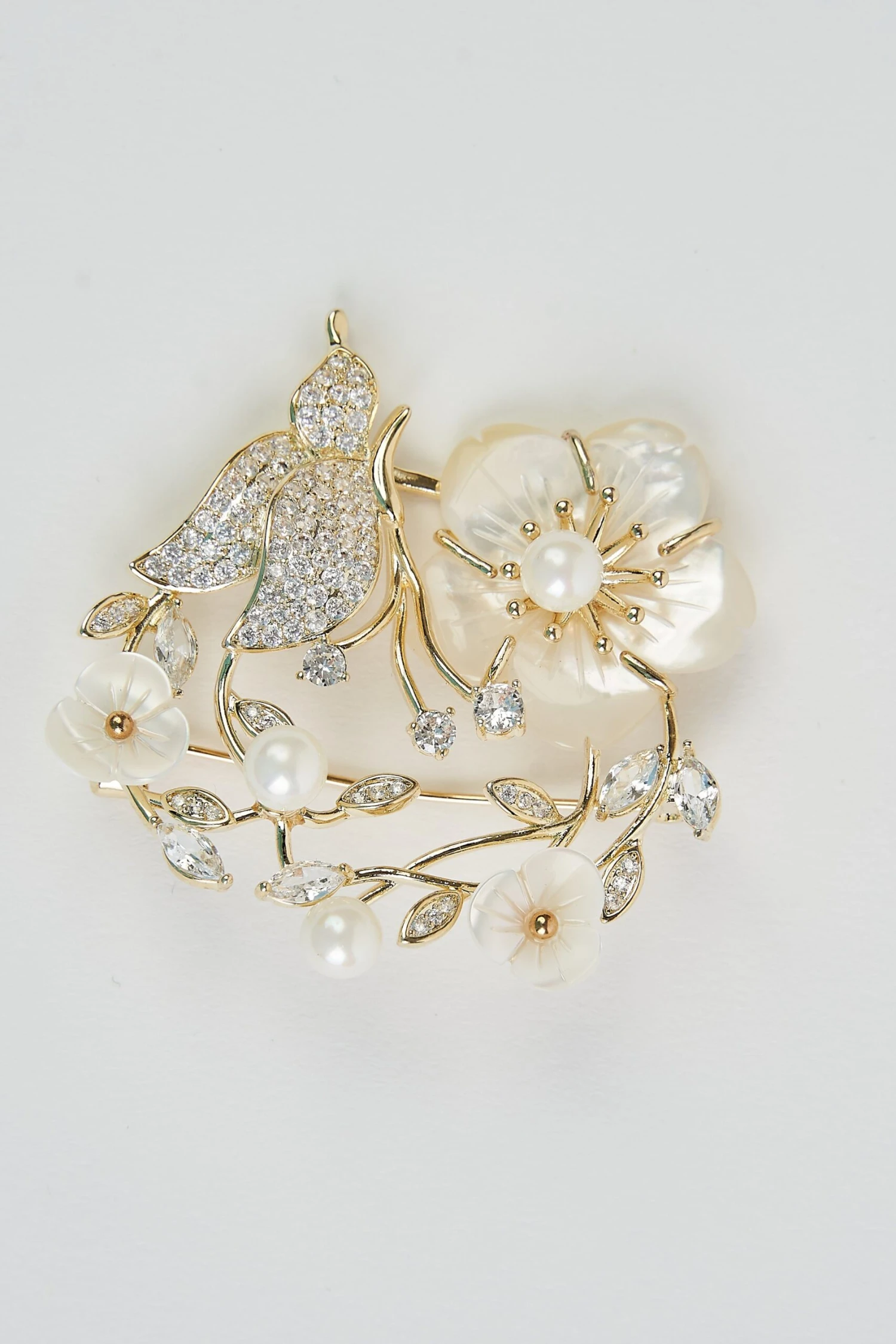 An elegant piece that will add sparkle and glamour to your outfit. Introducing our Blossom Bird Brooch. It showcases a delicate bird and flower wreath style design crafted from shell, cubic zirconia and brass metal. Fasten this lightweight brooch to your favourite shirt, blouse or jacket et voilà.