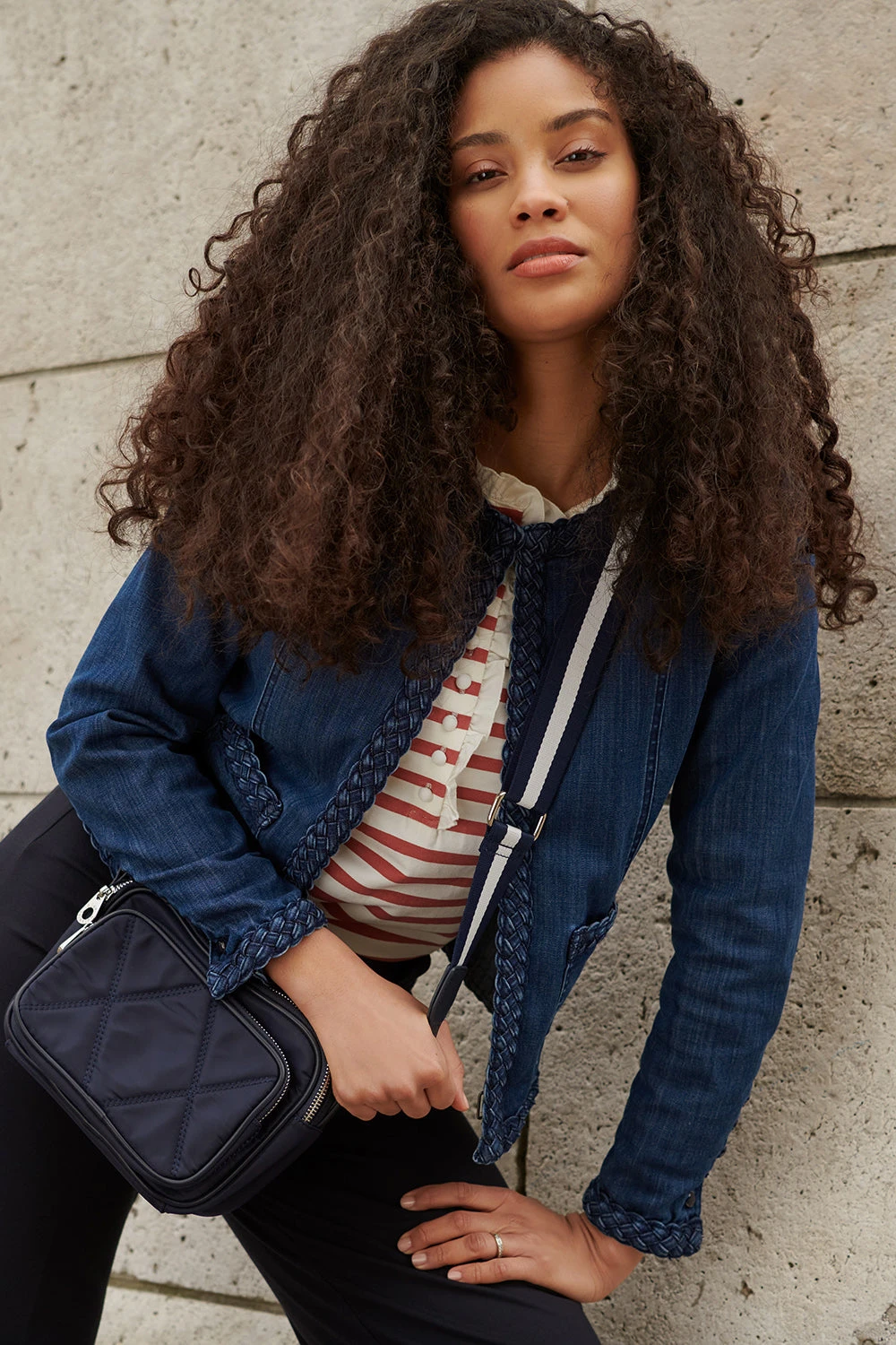 The classic denim jacket takes on a modern twist for our signature Bastille Day collection. A timeless piece that looks particularly Parisienne chic with a striped piece like our Ruffle Trim Henley T-Shirt, this denim jacket has an elevated feel with its generous braid trim detailing and is designed to sit comfortably above the hip.