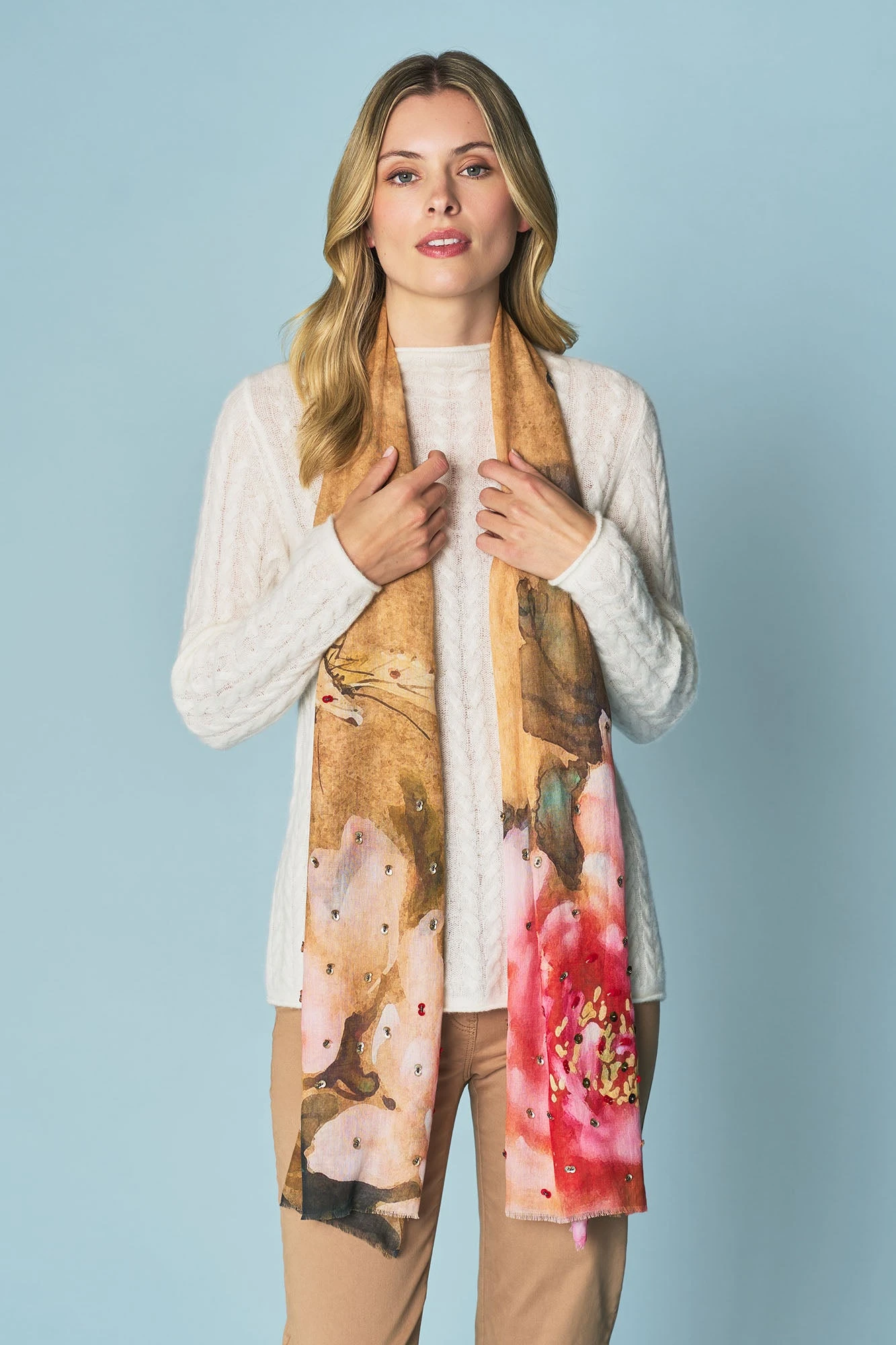 This playful butterfly scarf features a combination of subtle tones and is complete with lovely sequin and seed bead embroidery. Crafted from a combination of cotton and modal, this scarf is lightweight, comfortable and féminin.