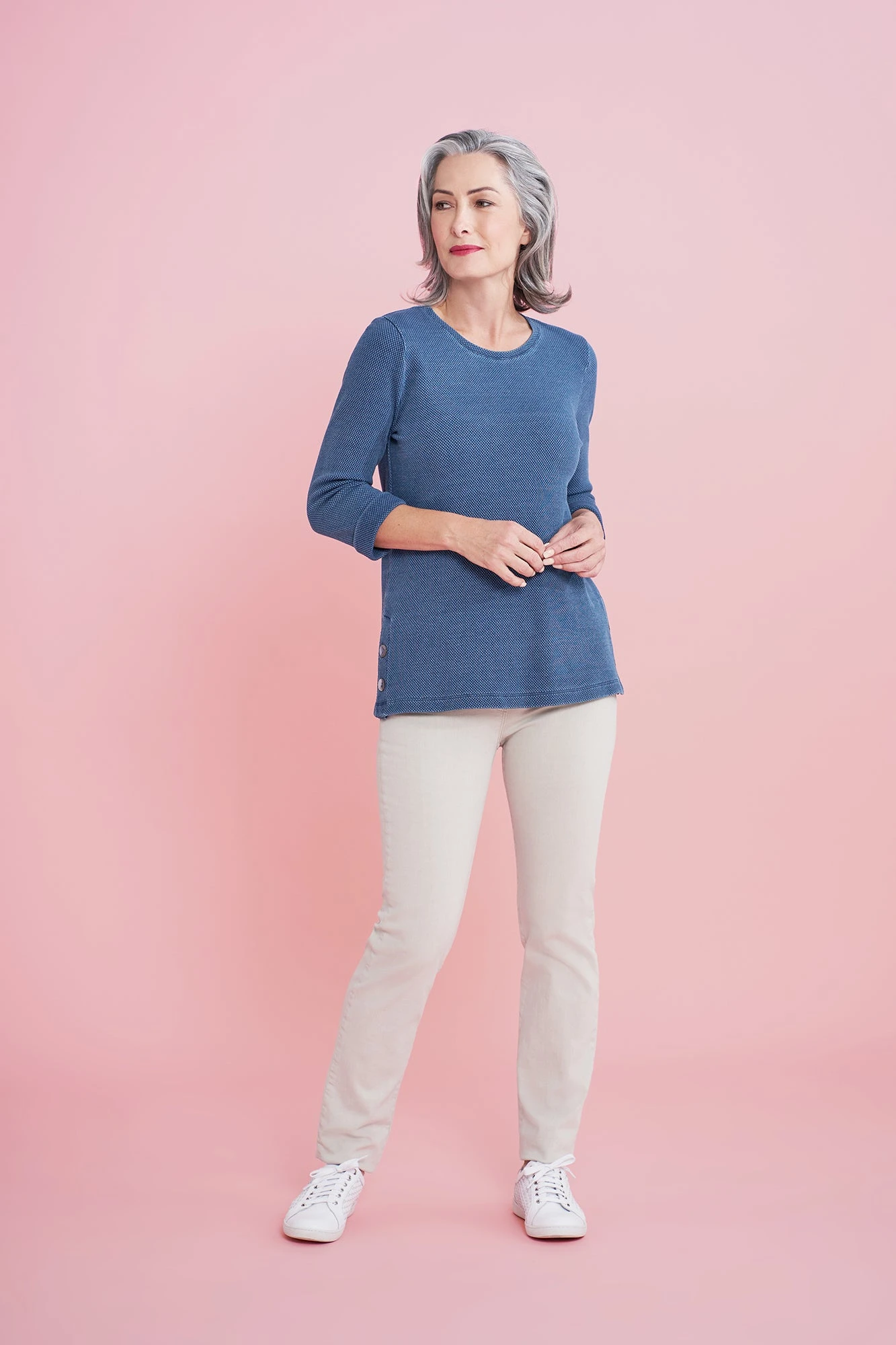 This Button Detail Cotton T-Shirt in denim wash jersey jacquard is a chic addition to any wardrobe. It features a ¾ rolled sleeve and chic smoke grey akoya shell button detailing at the side. Wear it with our Bengajean® Straight Leg for an elevated everyday look.