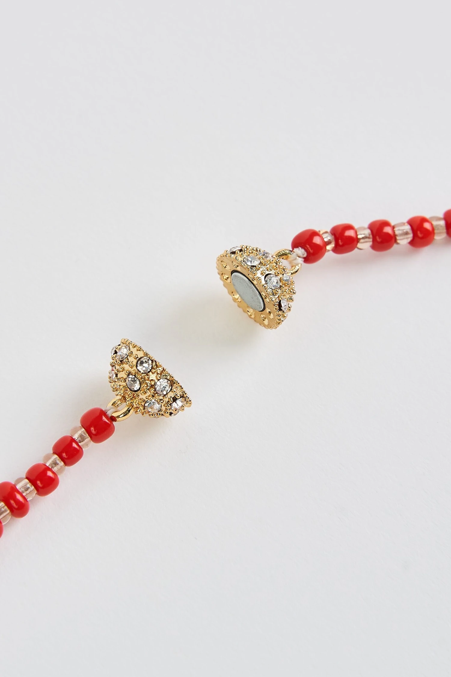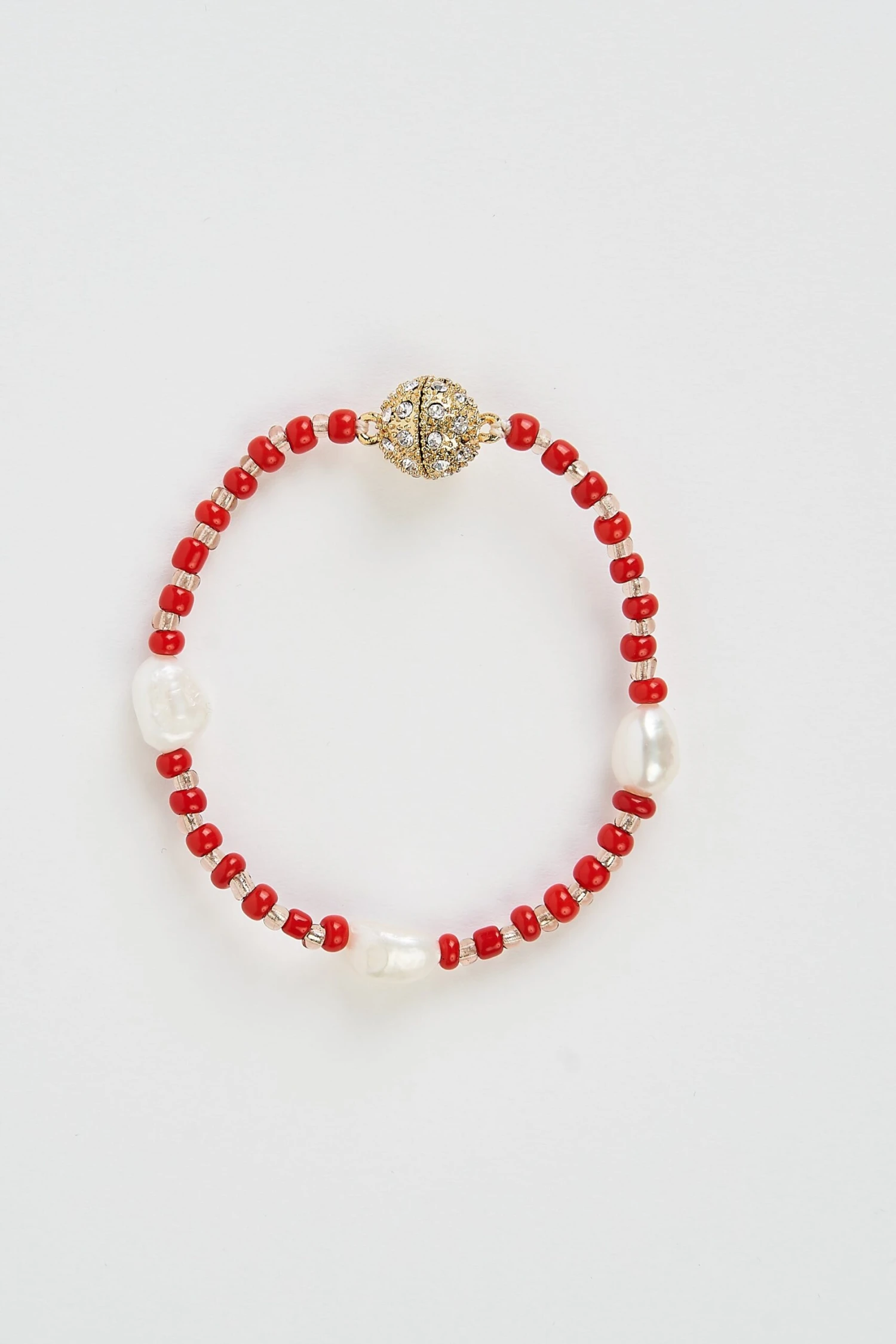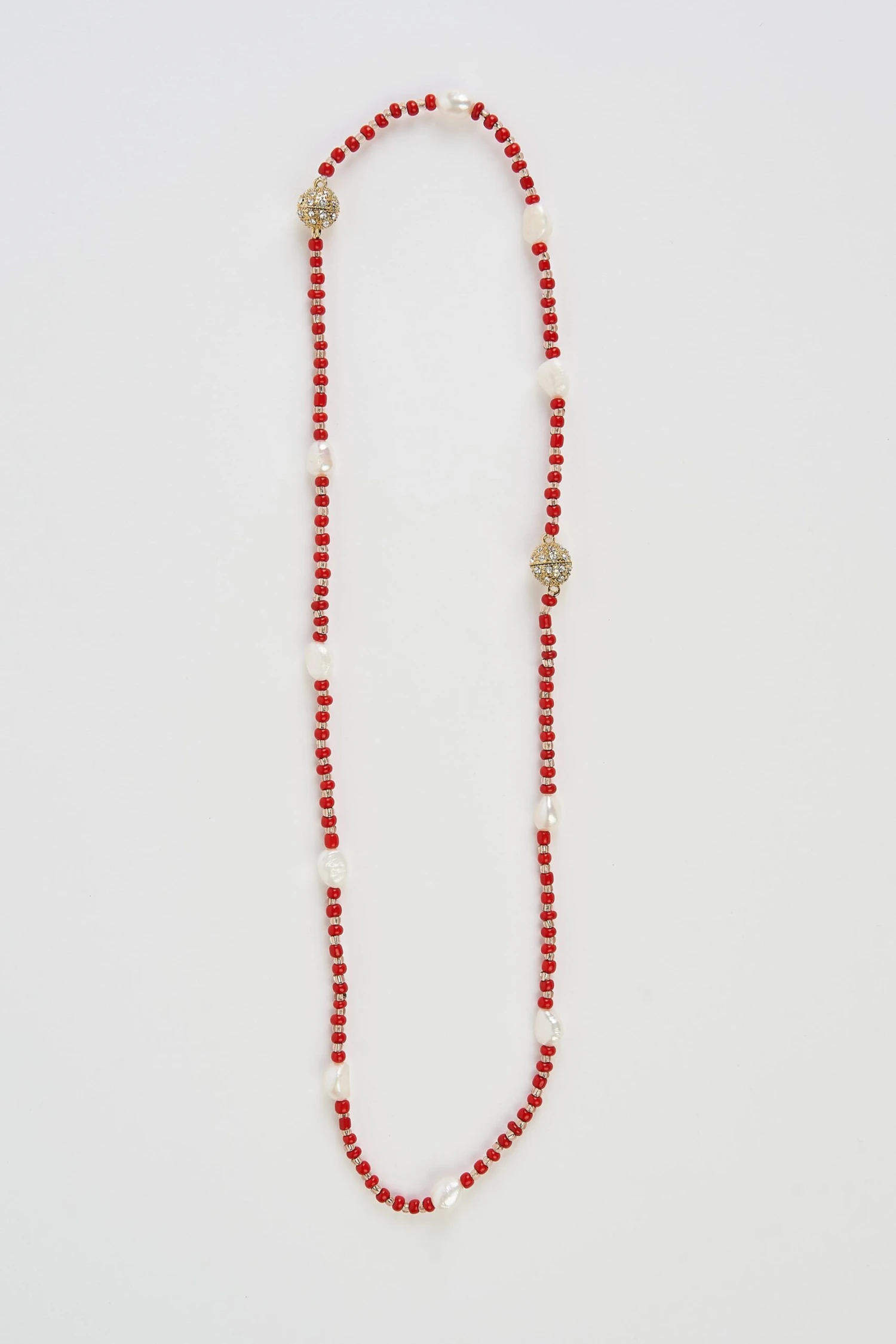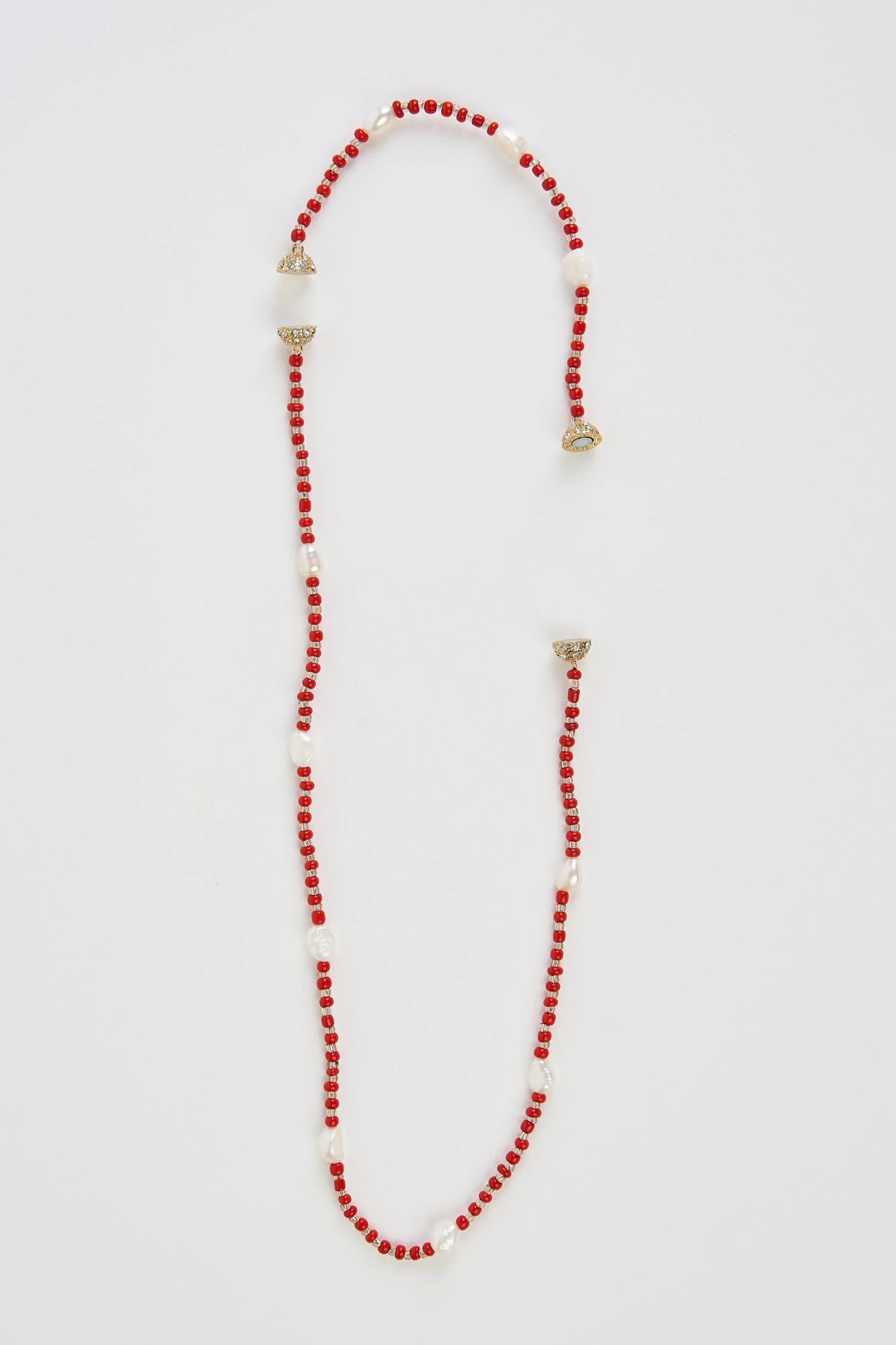 Create a matching necklace and bracelet set with our Cherie 2 in 1 Necklace. Featuring freshwater pearls in abstract shapes as well as a strand of fun red and translucent and beads, this is a set with Rue de Trésor flair. Wear it your way and attach the bracelet to the necklace to create a longer line necklace.