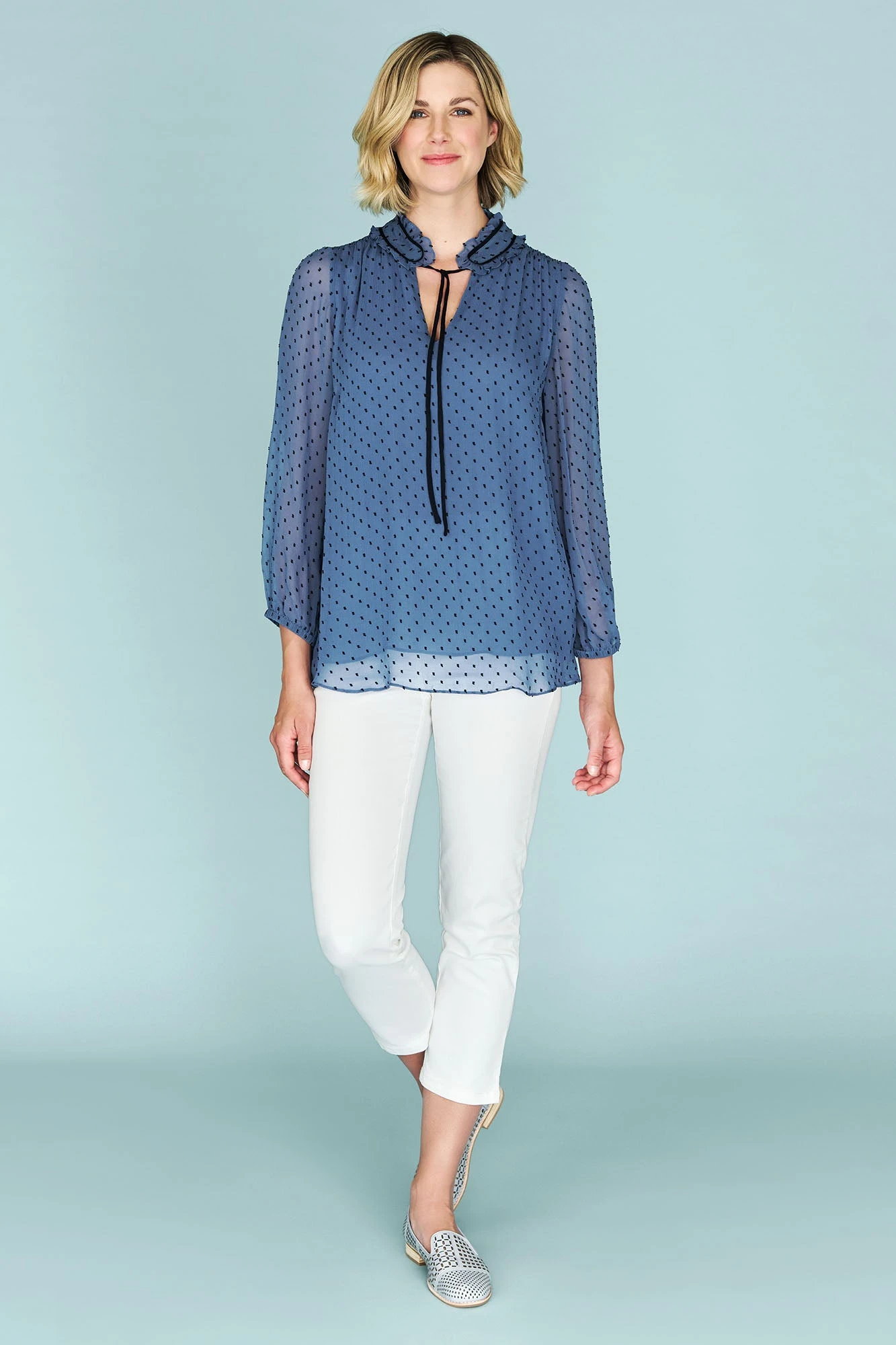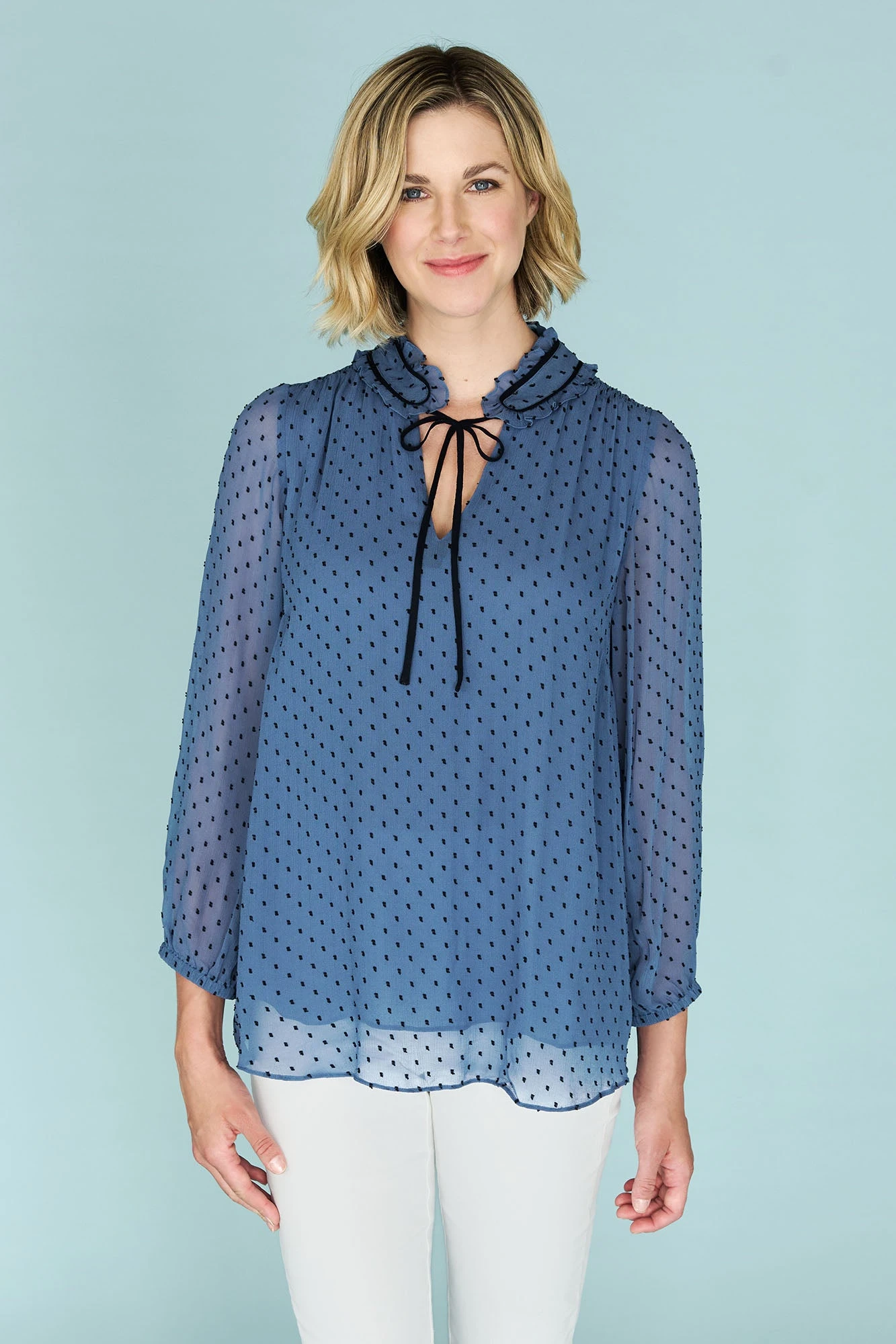 Oh la la! This versatile and feminine blouse will soon be on high rotation in your wardrobe. Featuring a high neck collar with tie and frill detailing as well as a sheer full-length sleeve, team this blouse with your favourite Bengajean®. C’est parfait for day or nightwear!