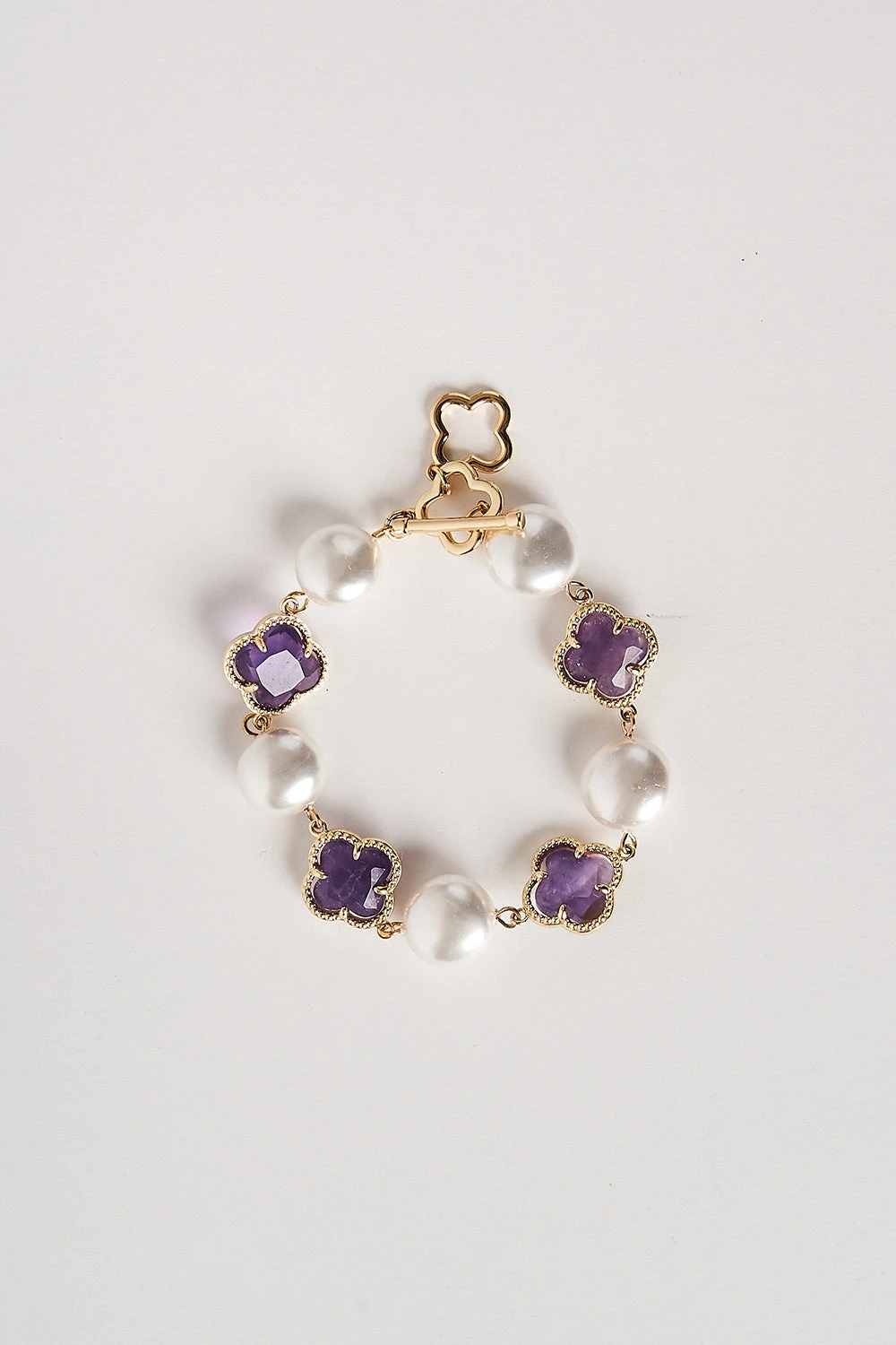 Bring a little good luck into your life with our Clover Pearl Bracelet. Featuring stunning amethyst stones in a 4-leaf clover design coupled with lustrous coated pearls, this is an elegant piece perfect for special occasions.