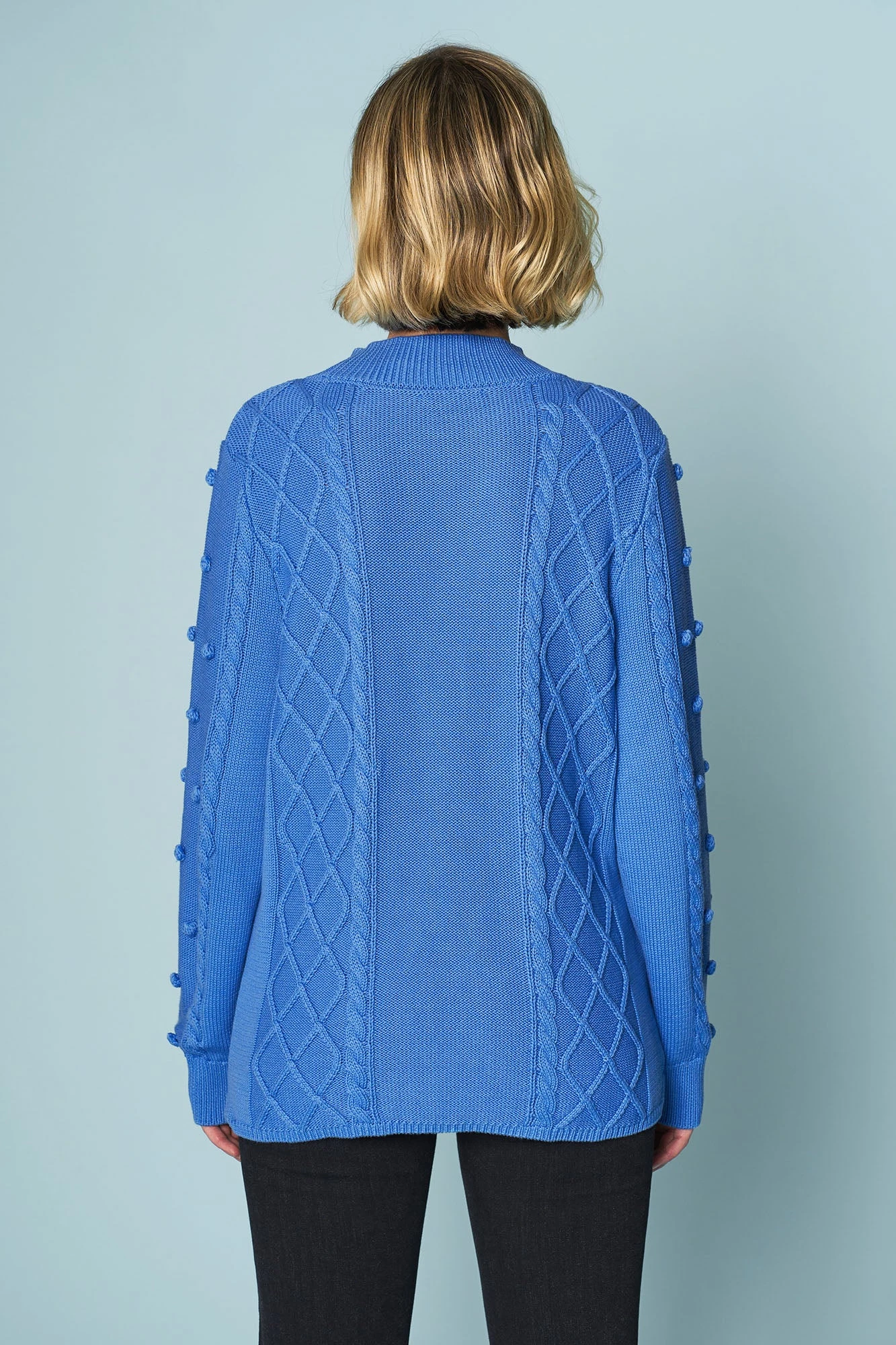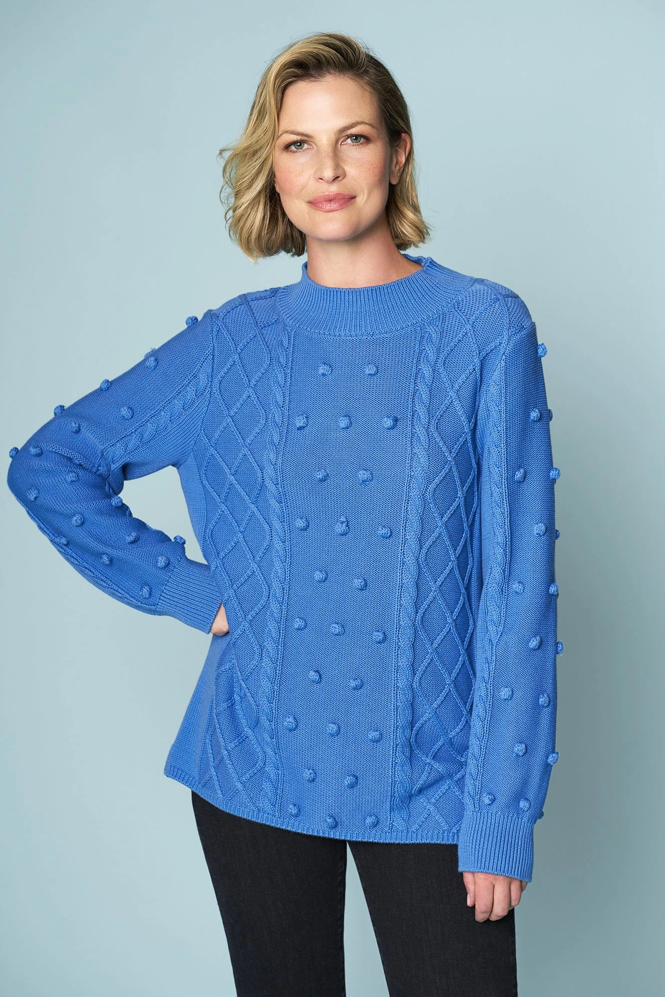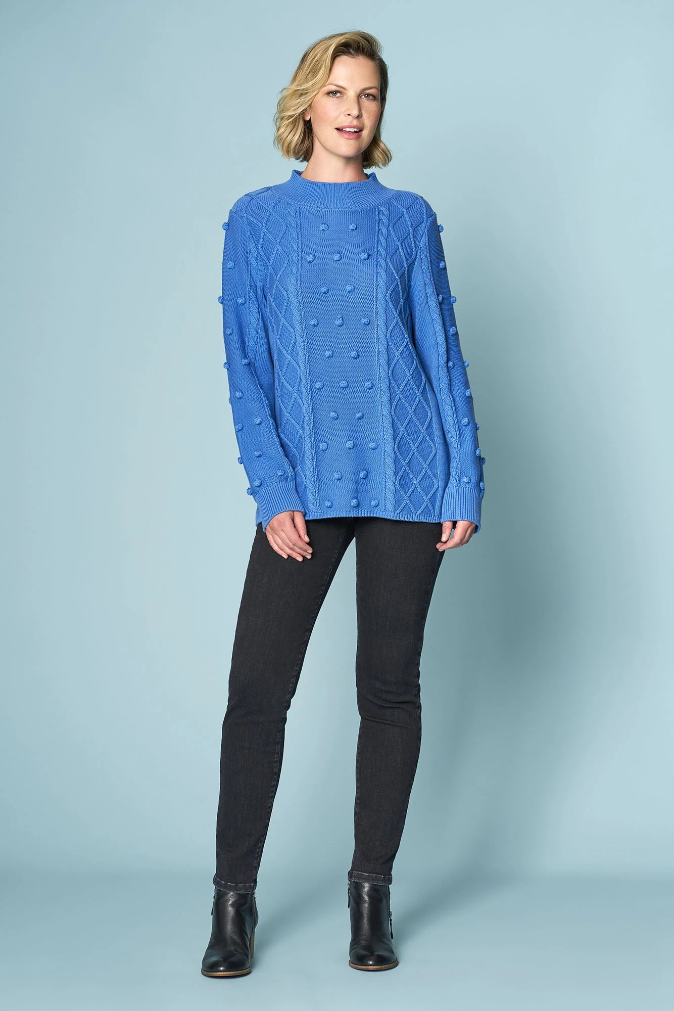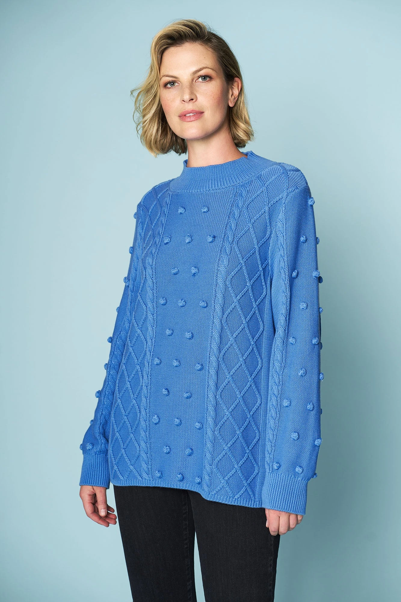 Our Cotton Bobble Knit in Cornflower Blue is a playful piece. Crafted from 100% cotton, this jumper features a new oversized bobble design with a lattice cable and rib high neck. Pair it with your favourite Bengajean® et voilà.