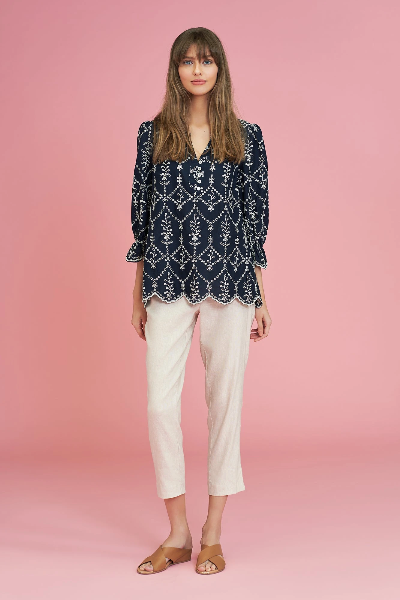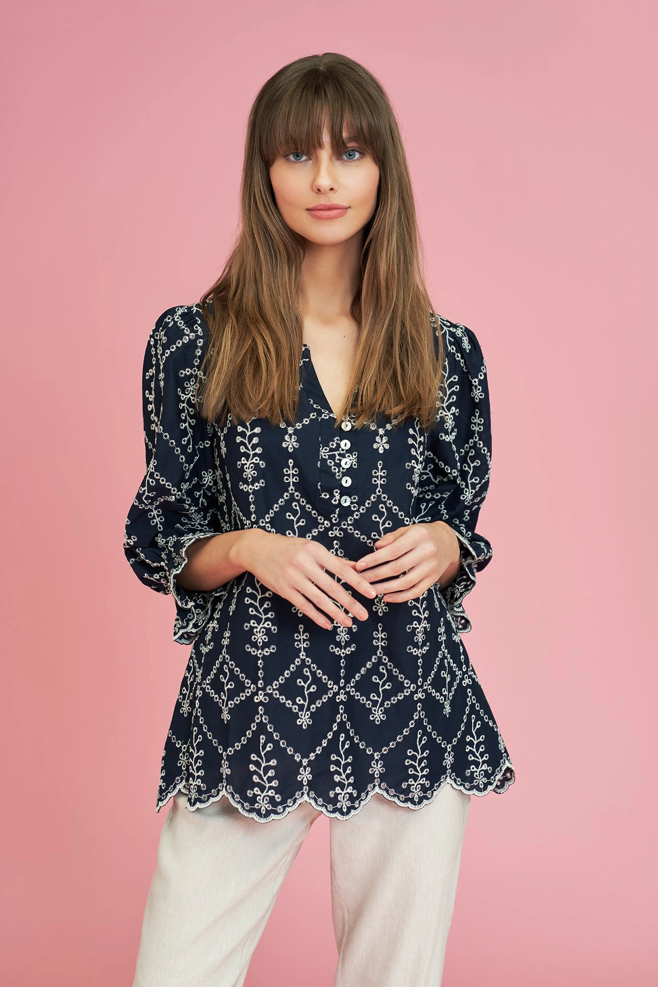 Add this eye-catching navy kaftan to your wardrobe and delight in the delicate cream-coloured floral embroidery. Crafted from 100% cotton, this kaftan features a ¾ length puff sleeve with feminine ruffle cuff and a scalloped hem. Pair it with our signature Bengajean® and a plimsol for an elegant casual look.