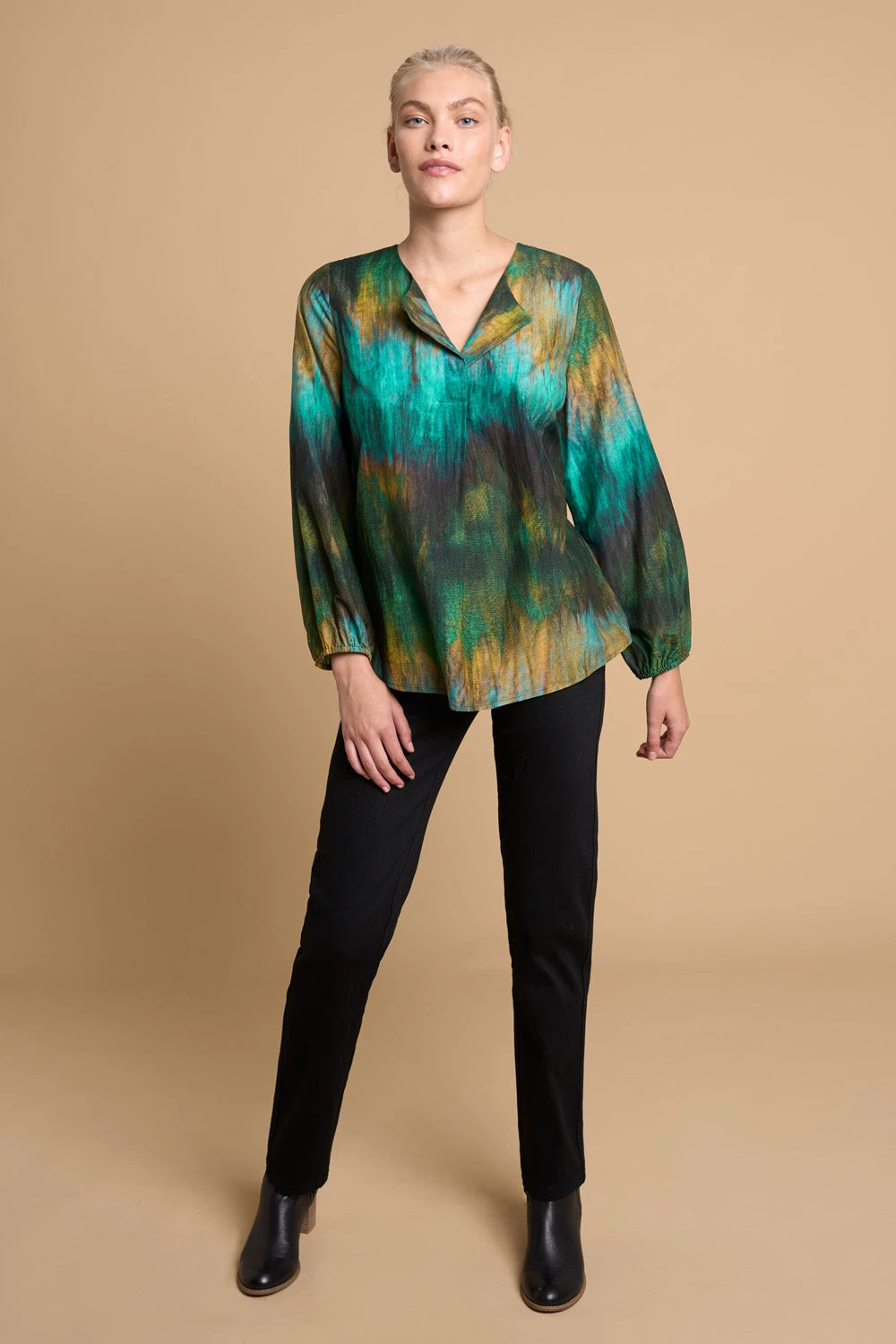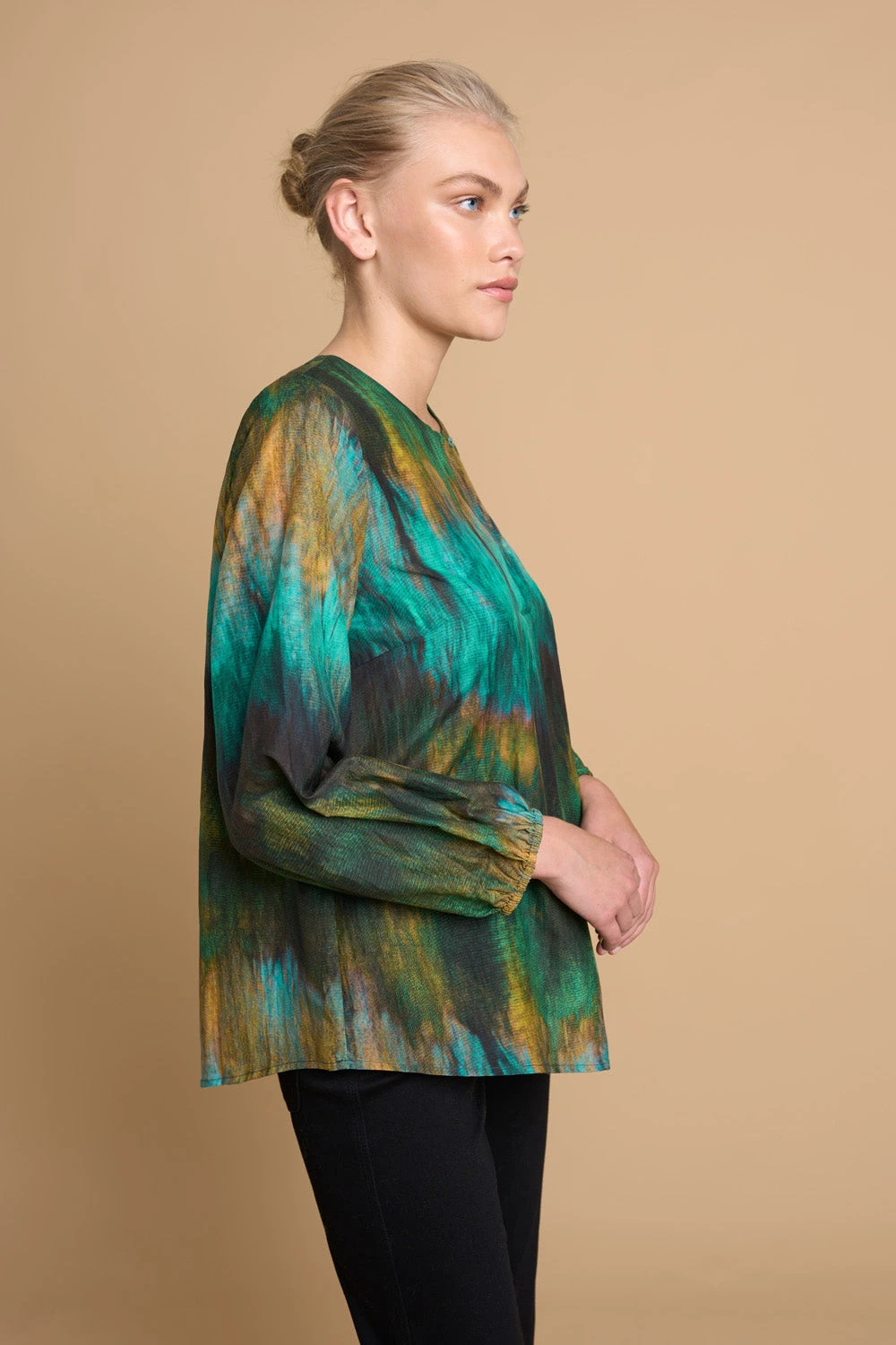 Reminiscent of the Northern Lights, our Cotton Silk Blouson Blouse features the stunning Bretagne print of our Rue de Bretagne collection. With a wash of green, yellow and blue tones, this relaxed fit blouse has an arty, bohemian feel. Button fastening at the neck allows for optional open styling.