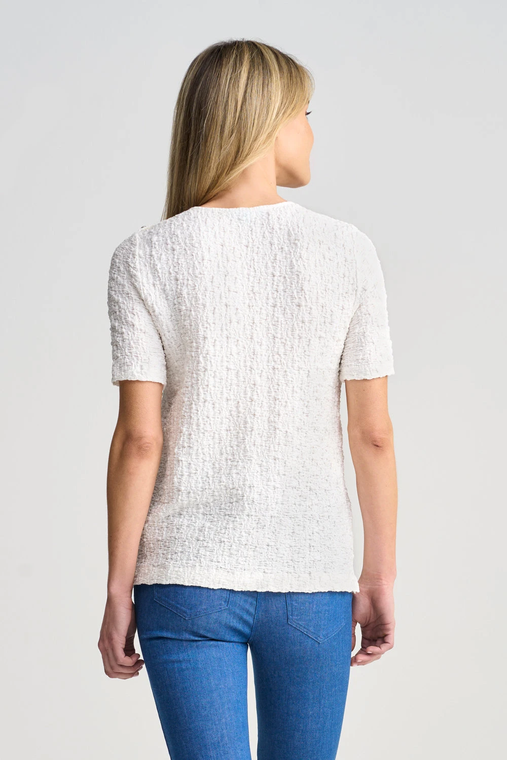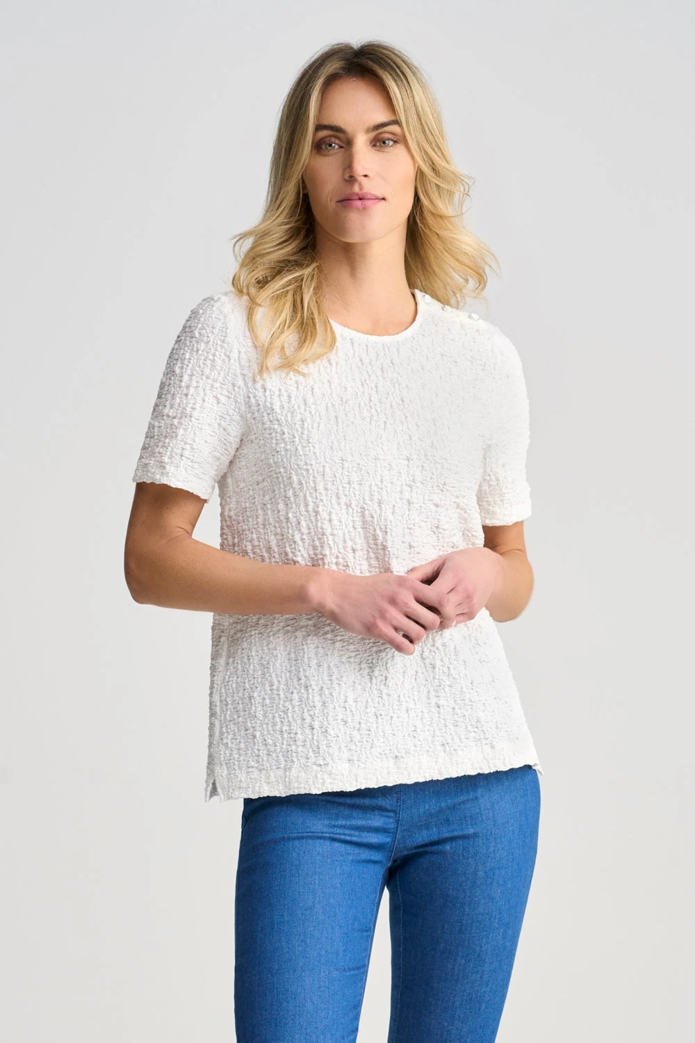 We love the crinkle effect of this fresh White t-shirt. Drawing on the French marinière style, this t-shirt features button detailing along the wearer’s left as well as a smart crew neck. This is an all-season versatile top that will bring freshness to any ensemble, like our Bengajean® 7/8th Button Detail and Harli Cross Strap.