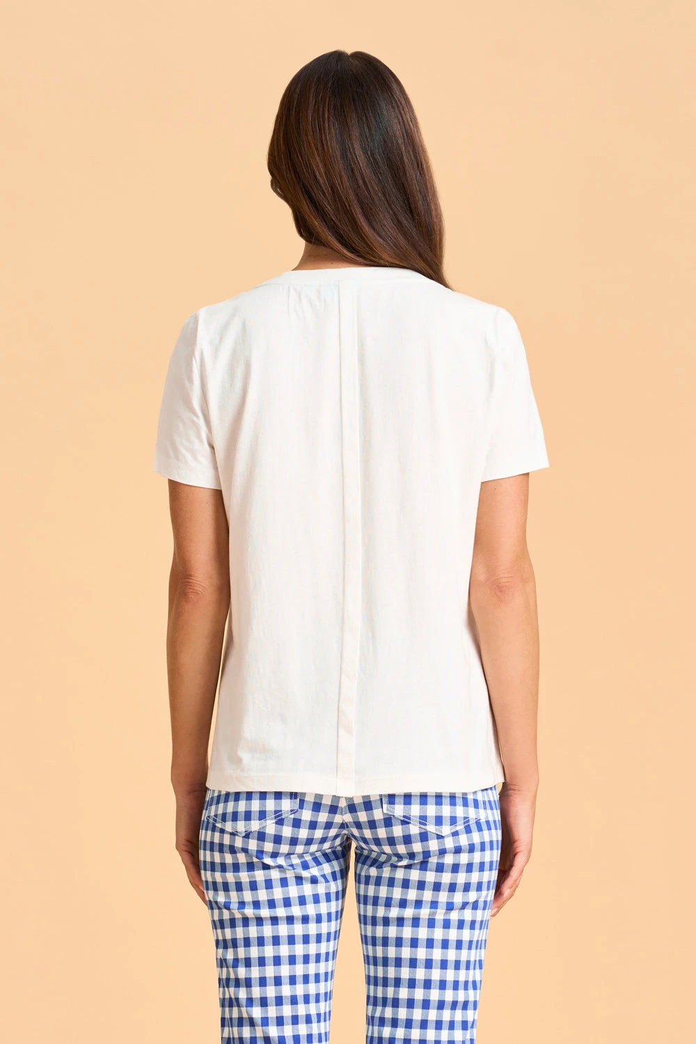 Looking for a sharp white t-shirt with a little pizzazz? Our Embellished Cotton T-Shirt is the answer. Crafted from 100% cotton, this comfortable t-shirt features beautiful hand-embellishments of seed beads and diamantes that come together to form a subtle floral motif. Style this sparkling beauty with our Azure Gingham Bengajean® and Navy Suede Loafer.