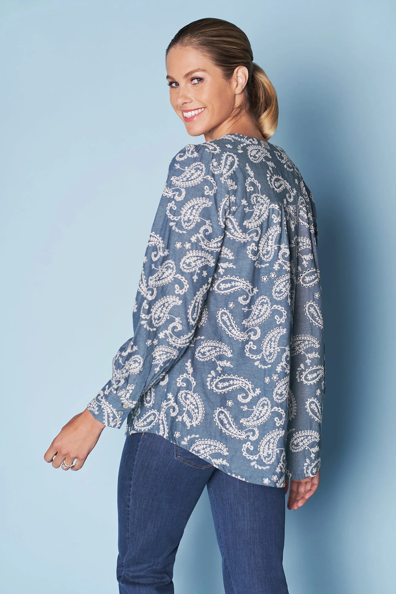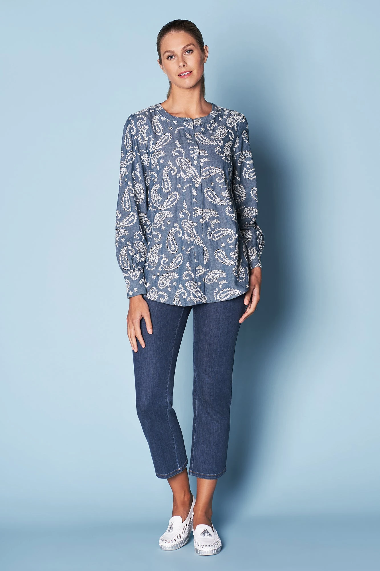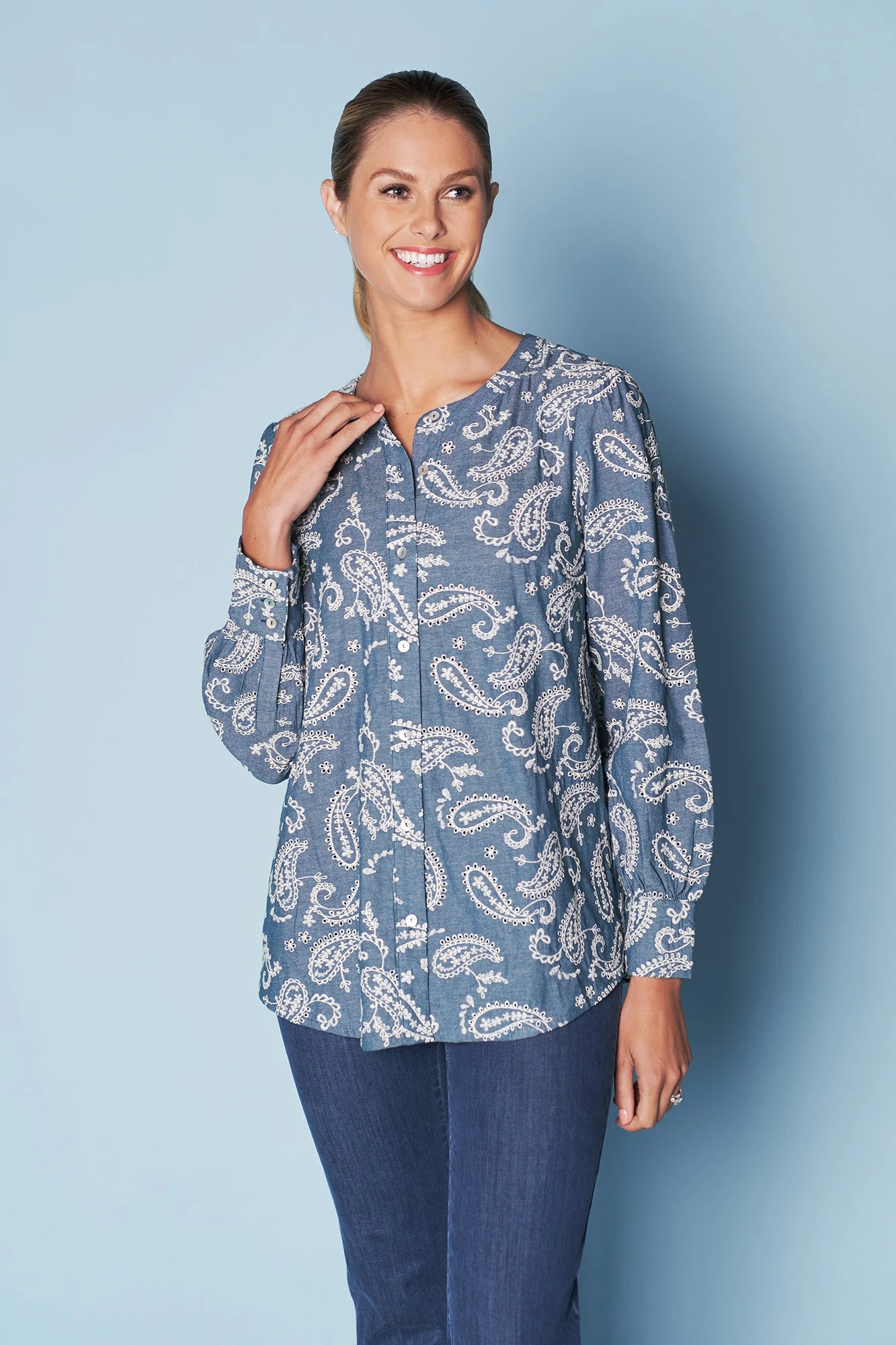 Featuring the paisley motif of our new Èze collection comes this statement Embroidered Cotton Shirt. Crafted from 100% cotton, this shirt features a bold paisley embroidered pattern, round neckline and shell button detailing at the cuff. With a relaxed fit you’ll feel comfortable and ‘at ease’.