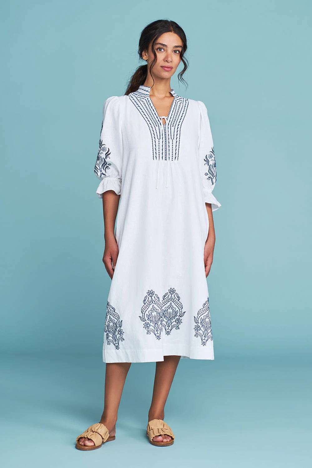A showstopping piece of our L’été en Provence collection comes our Embroidered Linen Cotton Dress. In a new style for Blue Illusion this maxi-length dress showcases intricate embroidery, a stylish puff sleeve with ruffle edging, bib design with self-fabricated ties, and a chic matching embroidered belt. Look no further for your summer special occasion event dress.