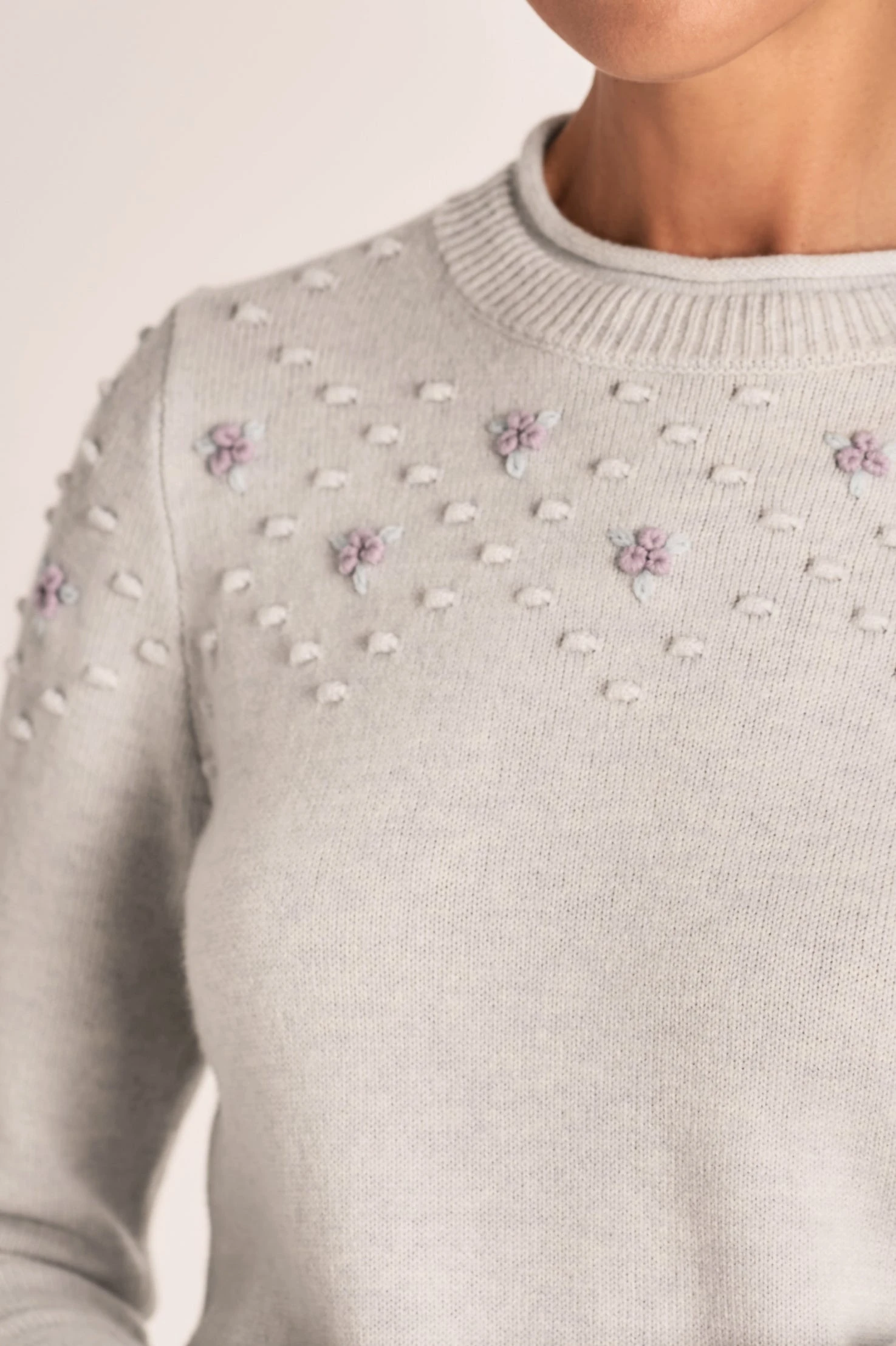 Gloriously soft, this chic jumper has been crafted from 100% Merino wool. Available in light grey Marle, this jumper features a popcorn stitch and feminine floral hand embroidery. Wear it with our Bengajean® Full Length Skinny Leg for style that is both charming and cosy.