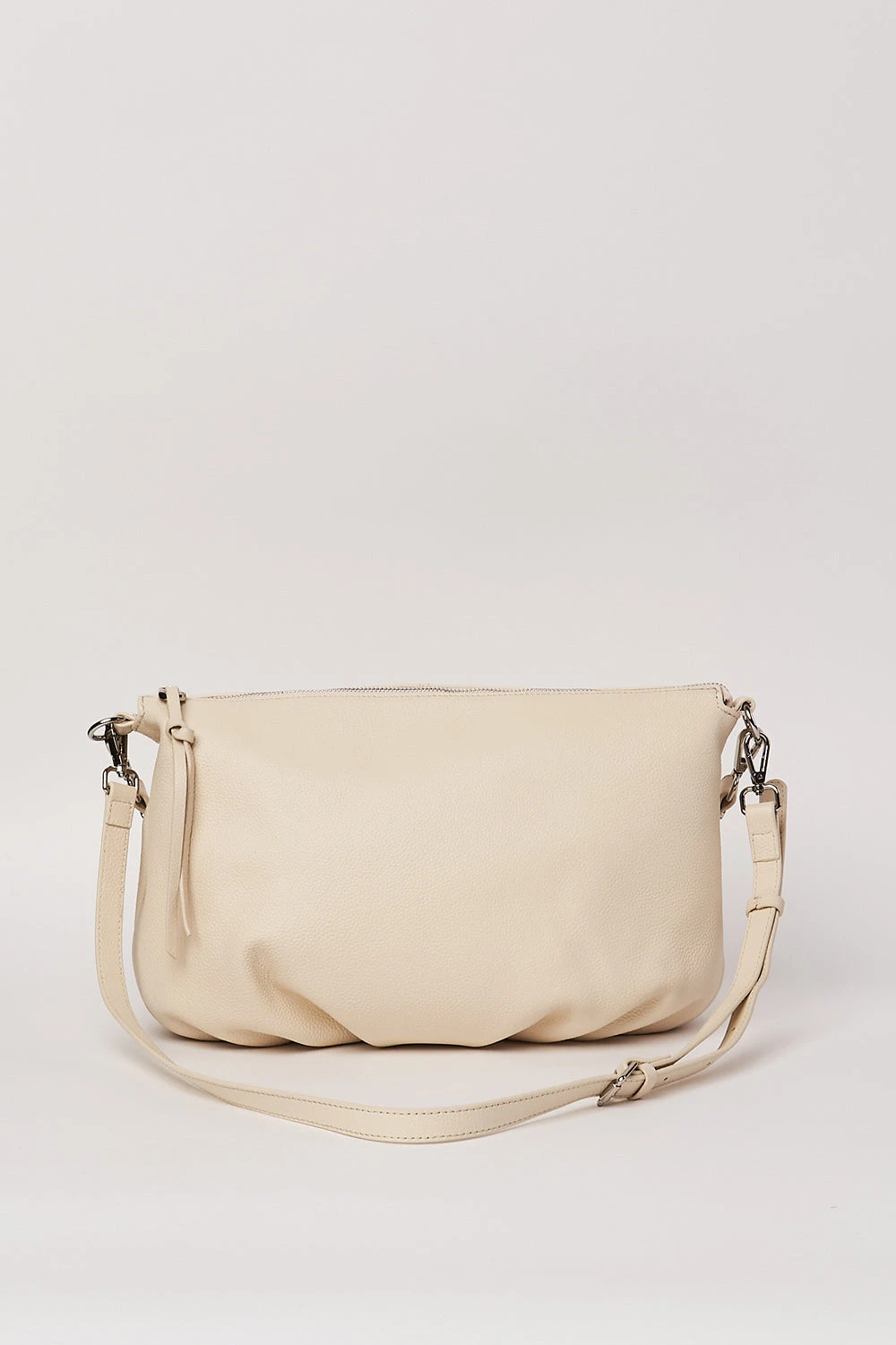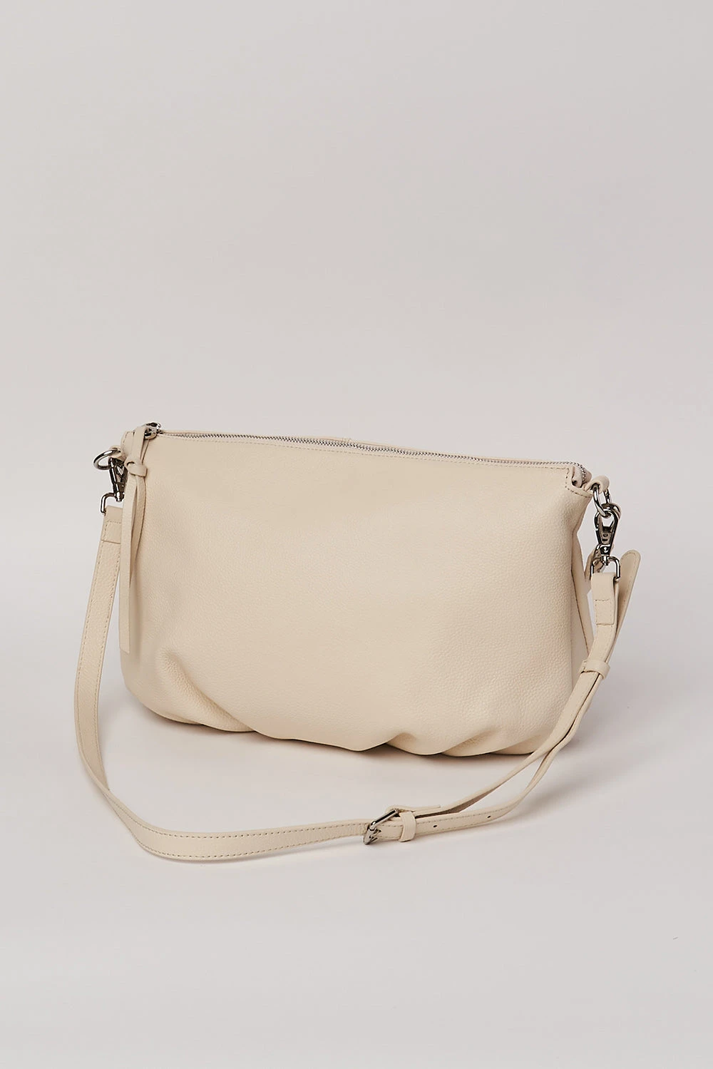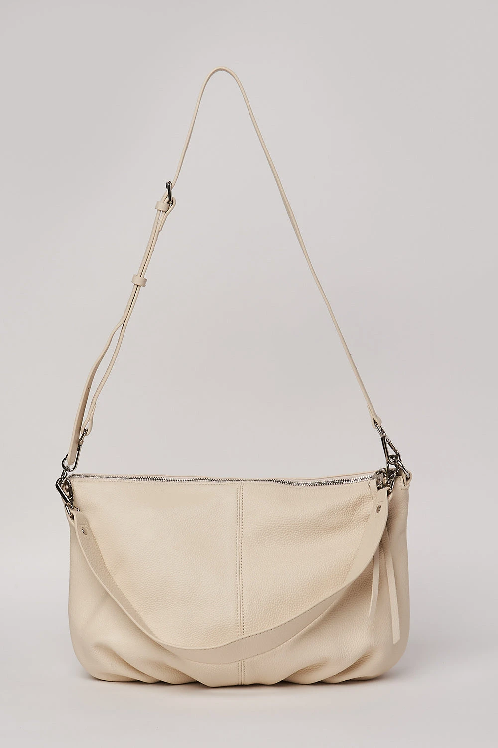 With a classic slouch effect and pleated detailing, our Evelyn Leather Handbag will soon become an everyday accomplice. Crafted from a neutral Ivory-coloured leather with a soft pebbled look, this bag is durable and can be worn as either a shoulder bag or crossbody bag with the detachable and adjustable strap.