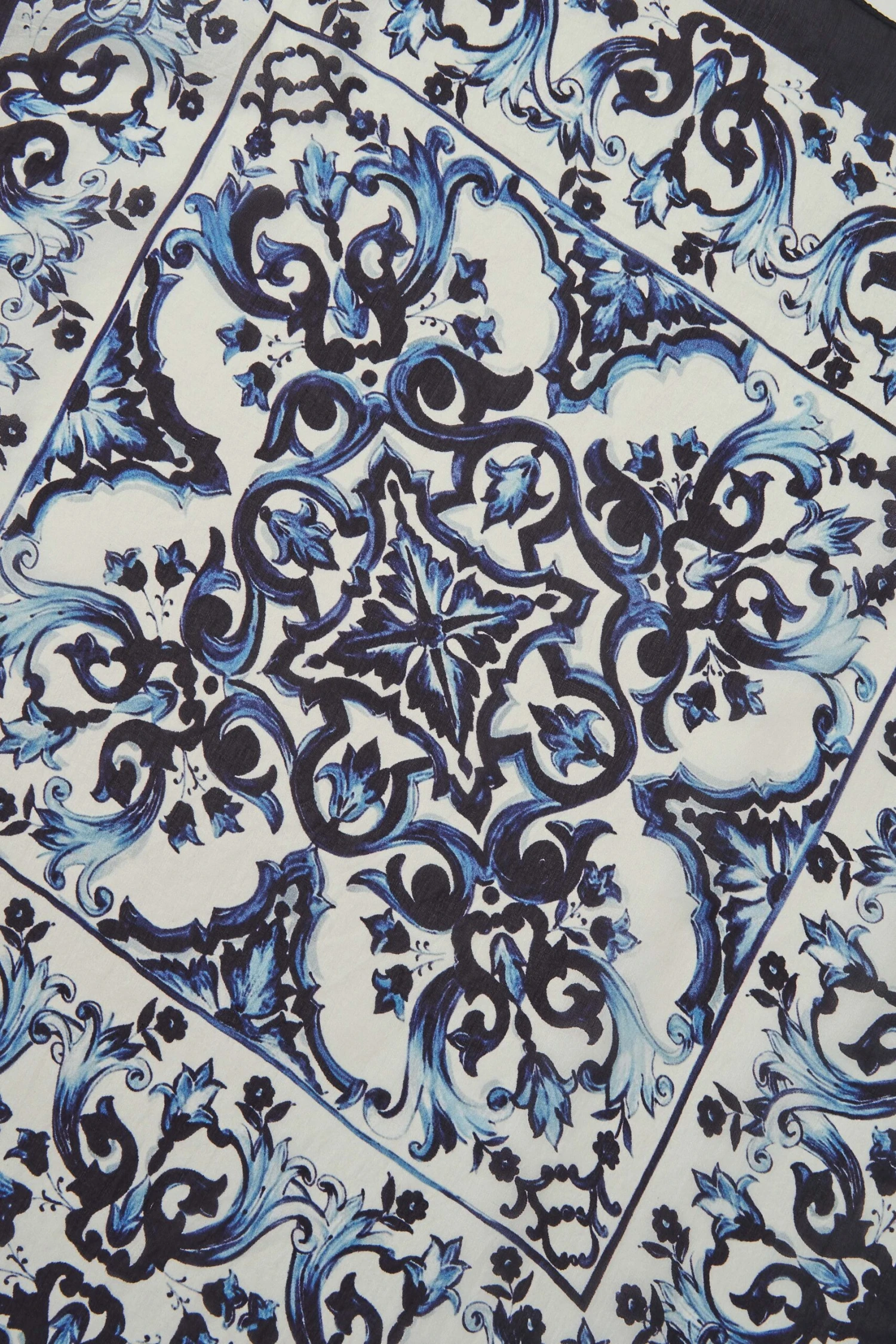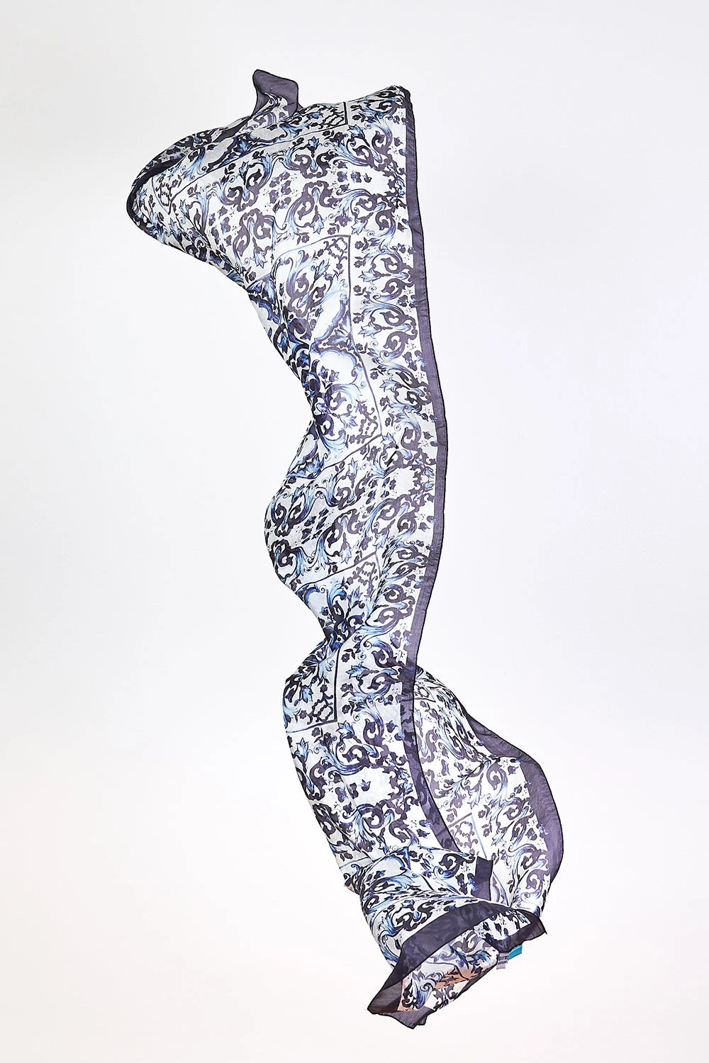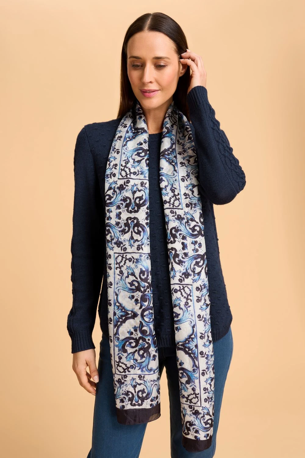 Our striking, two-tone Fleur de Lis Silk Scarf has a heavenly soft-hand feel. Crafted from 100% silk with a tile-inspired fleur de lis design and a Navy border, this scarf will add a little joie de vivre to your accessory collection.