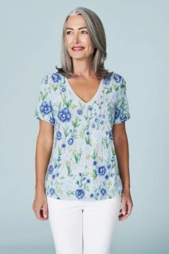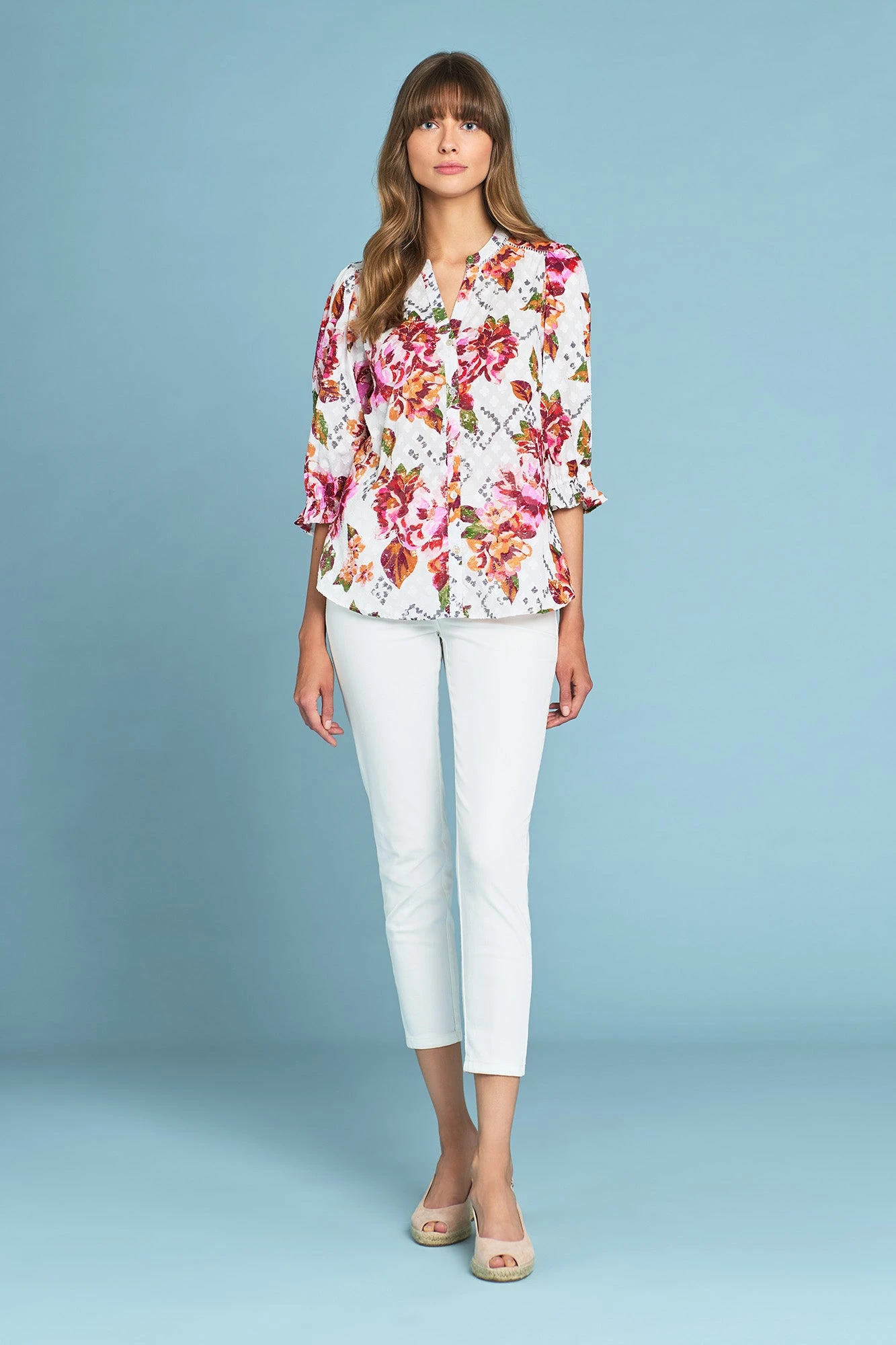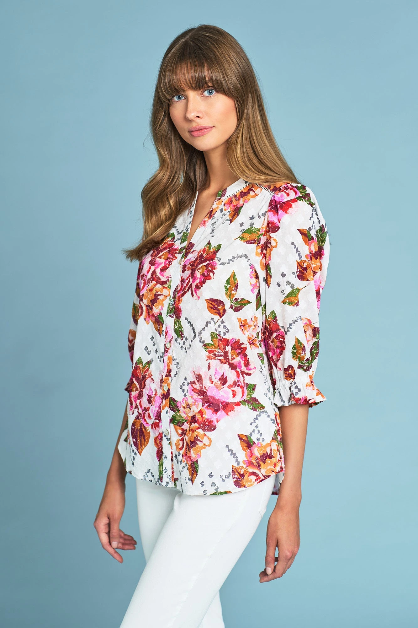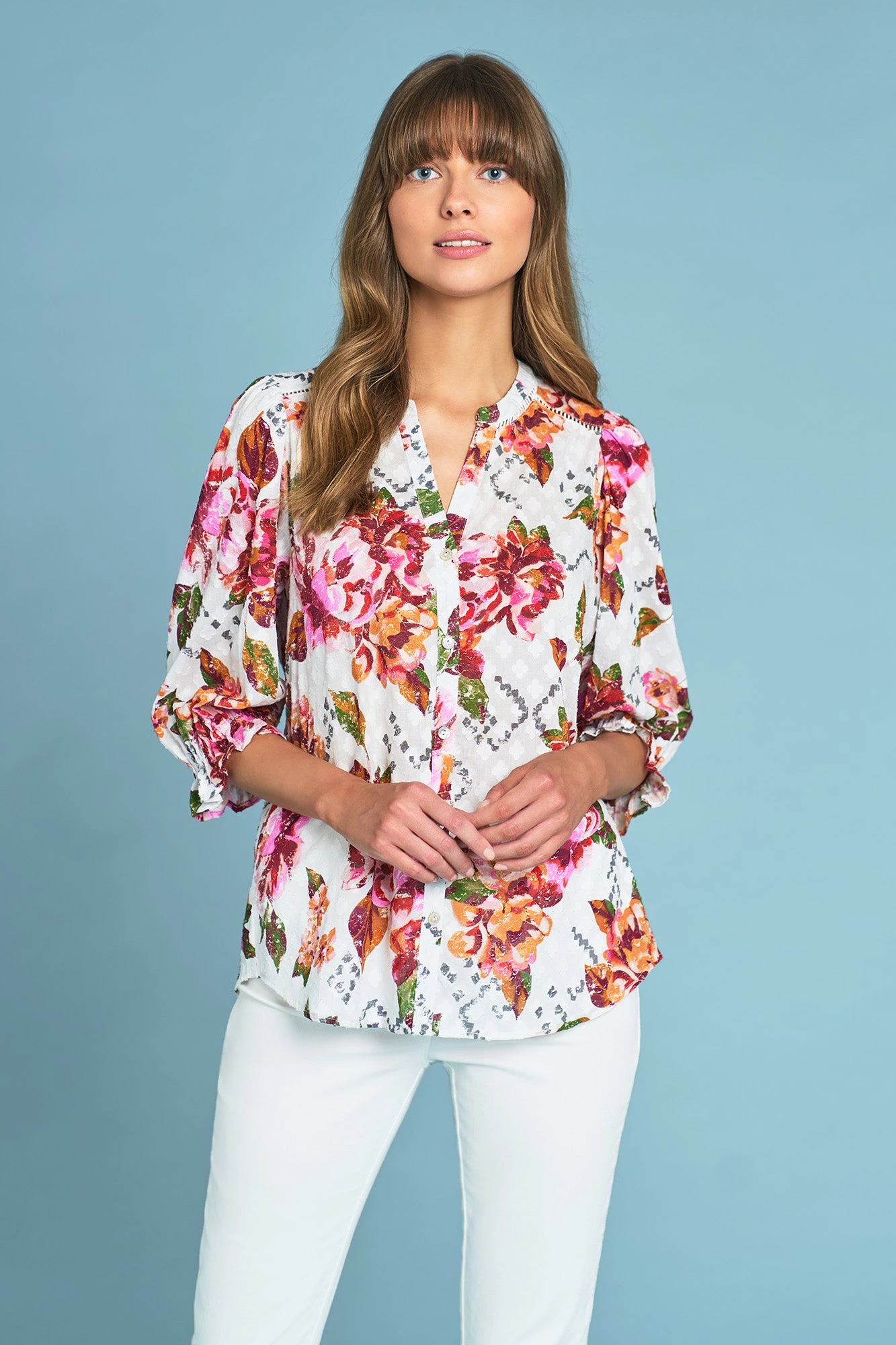 Crafted from lightweight and breathable cotton voile, our Floral Cotton Jacquard Shirt is a versatile summer shirt. Showcasing the Rue de Trésor Faded Floral print and a clip dobby design, this shirt has a lovely textured finish. With a cutaway neckline and ¾ puff sleeve this floral shirt is flattering and elegant.