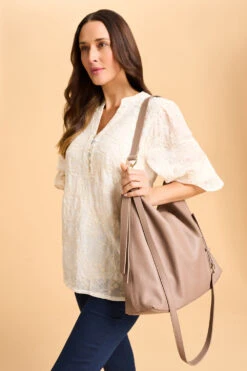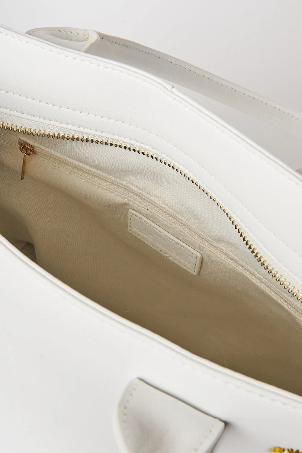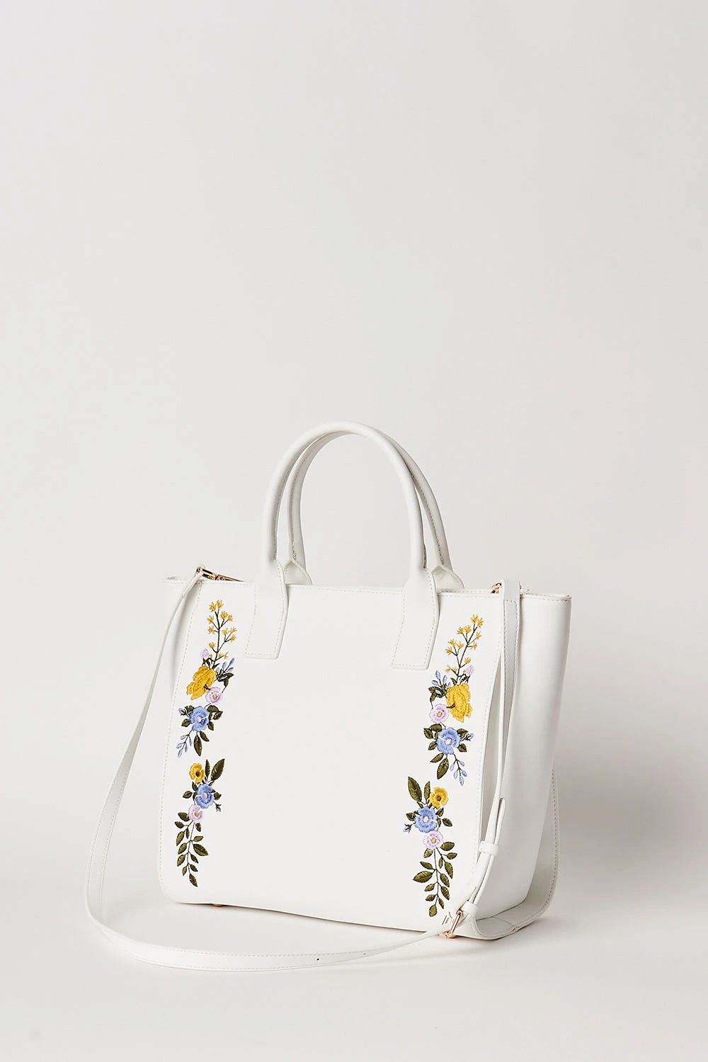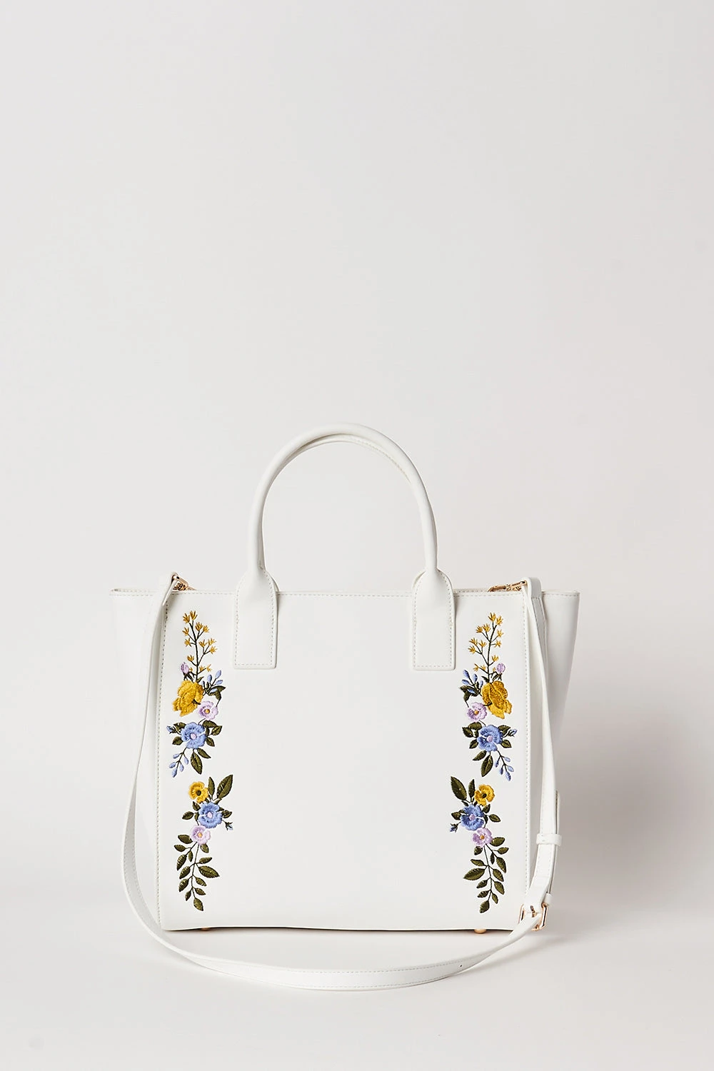 This feminine tote exudes spring styling with its placement floral embroidery in hues of lavender and chartreuse. Crafted from ultra-soft white textured leather, this tote will sit back with any dazzling yellow or bright bluebell based looks.