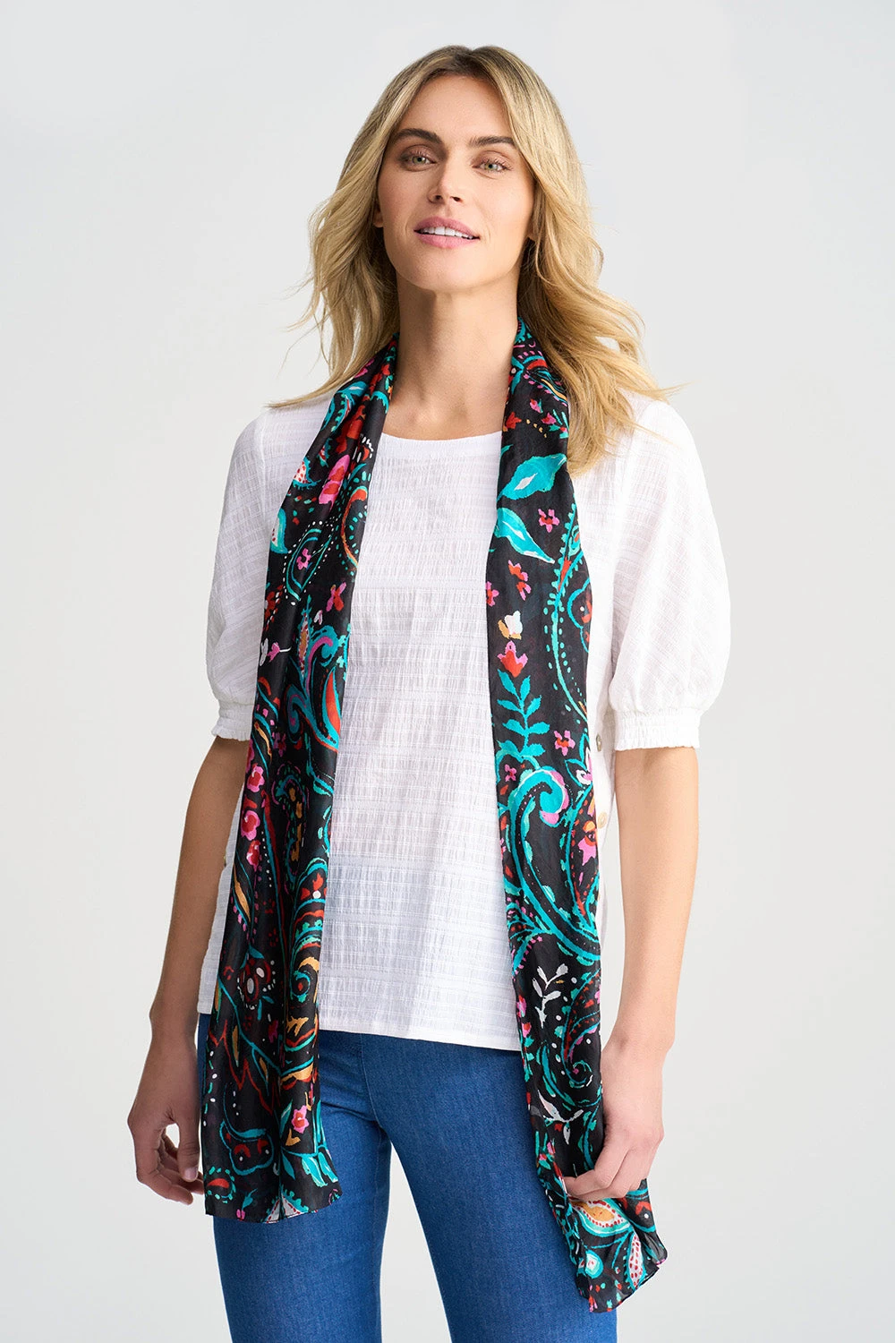 Don’t let winter’s grey weather bring you down, find your colourful style with our Floral Paisley Print Scarf. A modern and vibrant take on a classic paisley print, this scarf crafted from 100% silk twill, is a cacophony of colour that will instantly light up your outfit.
