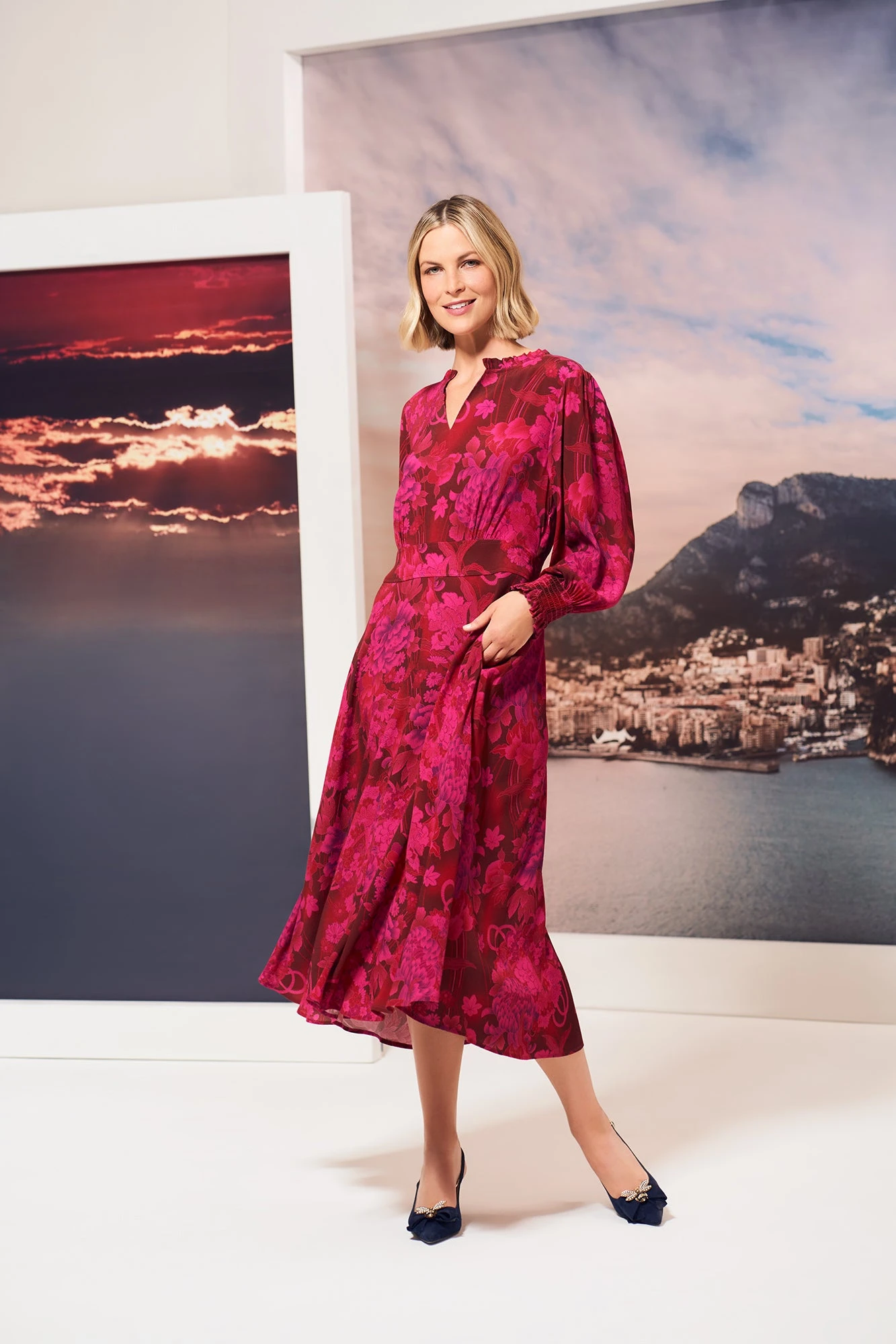 Say salut to our ever-so-sweet Frill Detail Midi Dress. Crafted from viscose crepe, this vibrant beauté showcases a stylish 3/4 blouson sleeve with shirring details. Pair it with our Abbey Suede Sling Back shoe for superbe style.