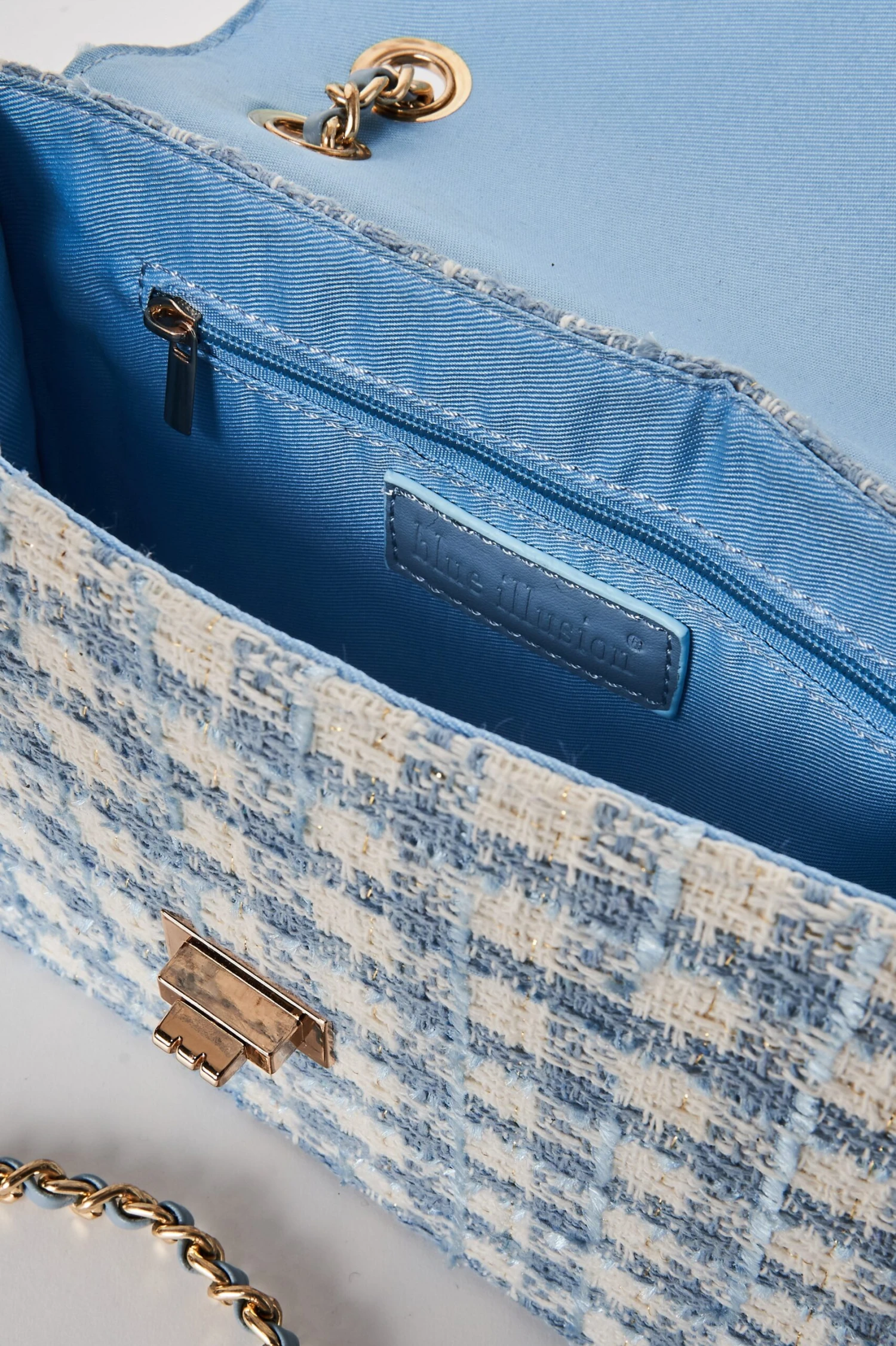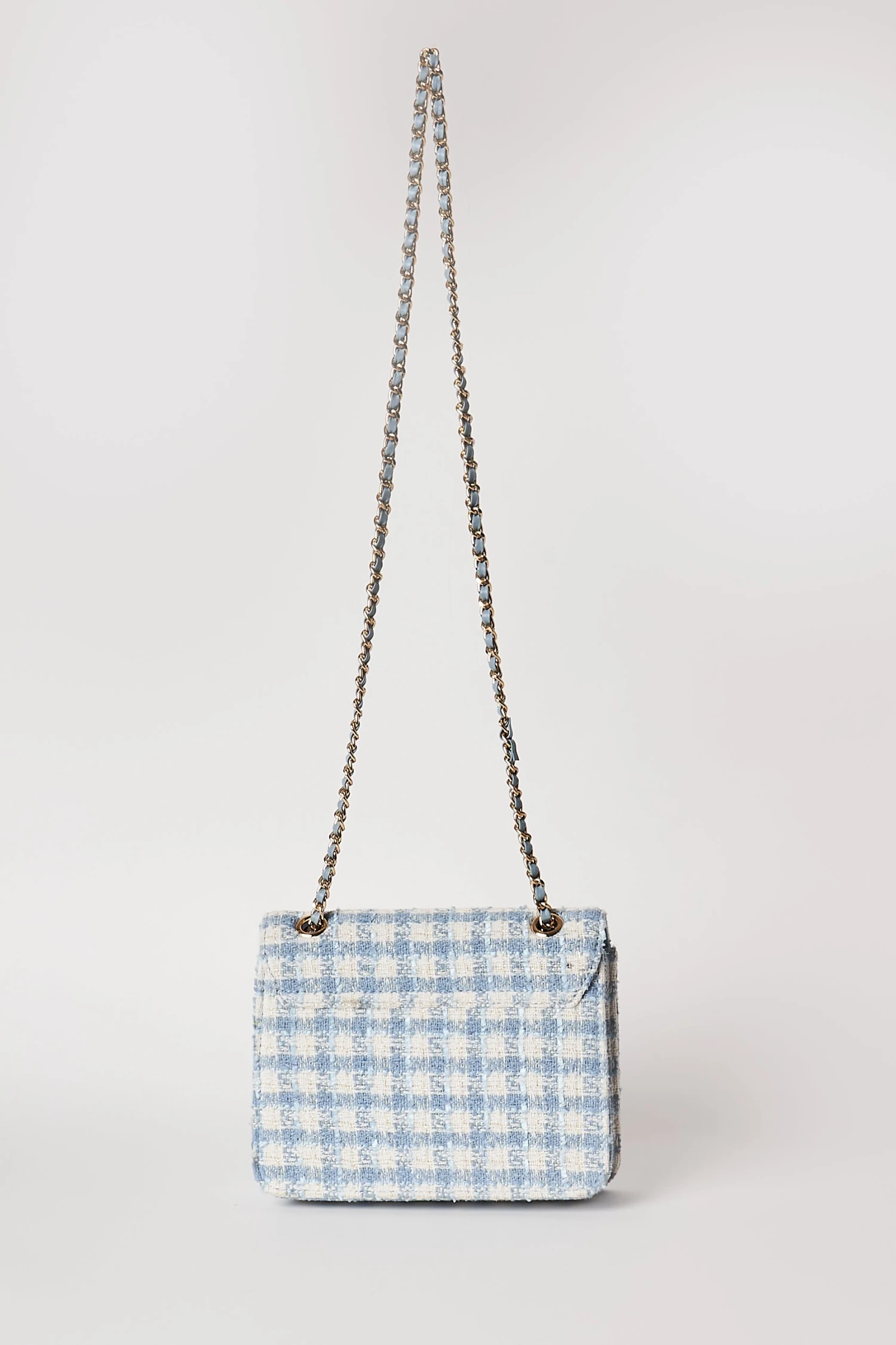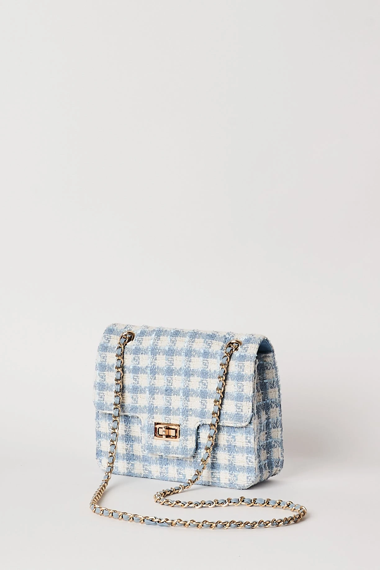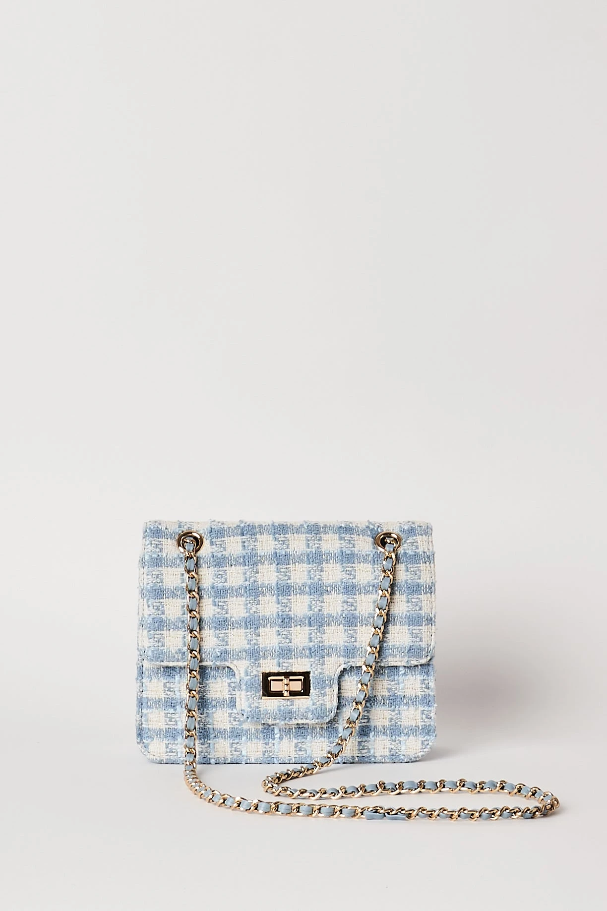 Elevate your outfit with this pretty blue and white bag by your side. Our Gabrielle Crossbody Bag is a charming statement bag featuring a sweet check design and gold chain shoulder strap with matching blue leather accent.