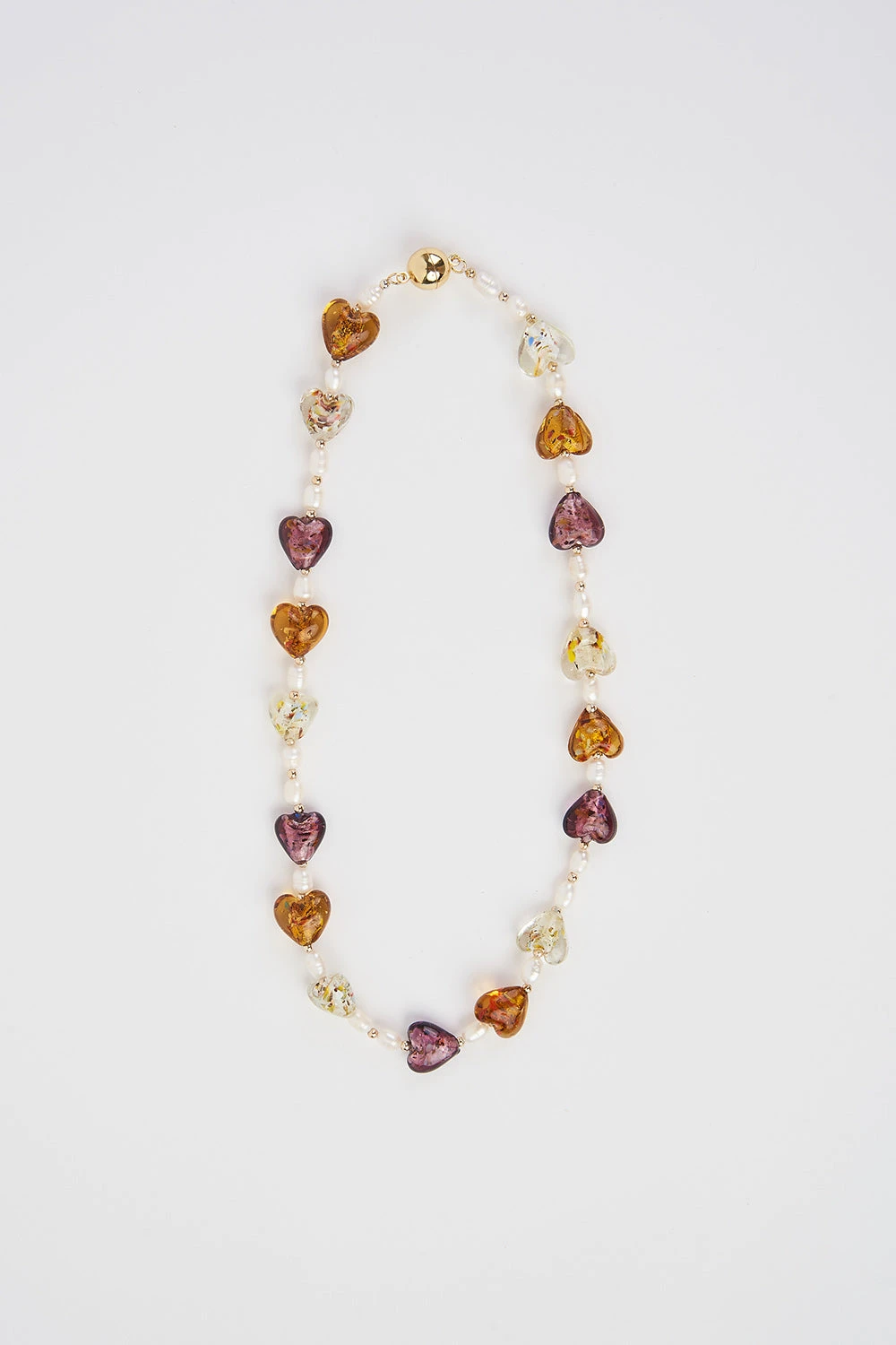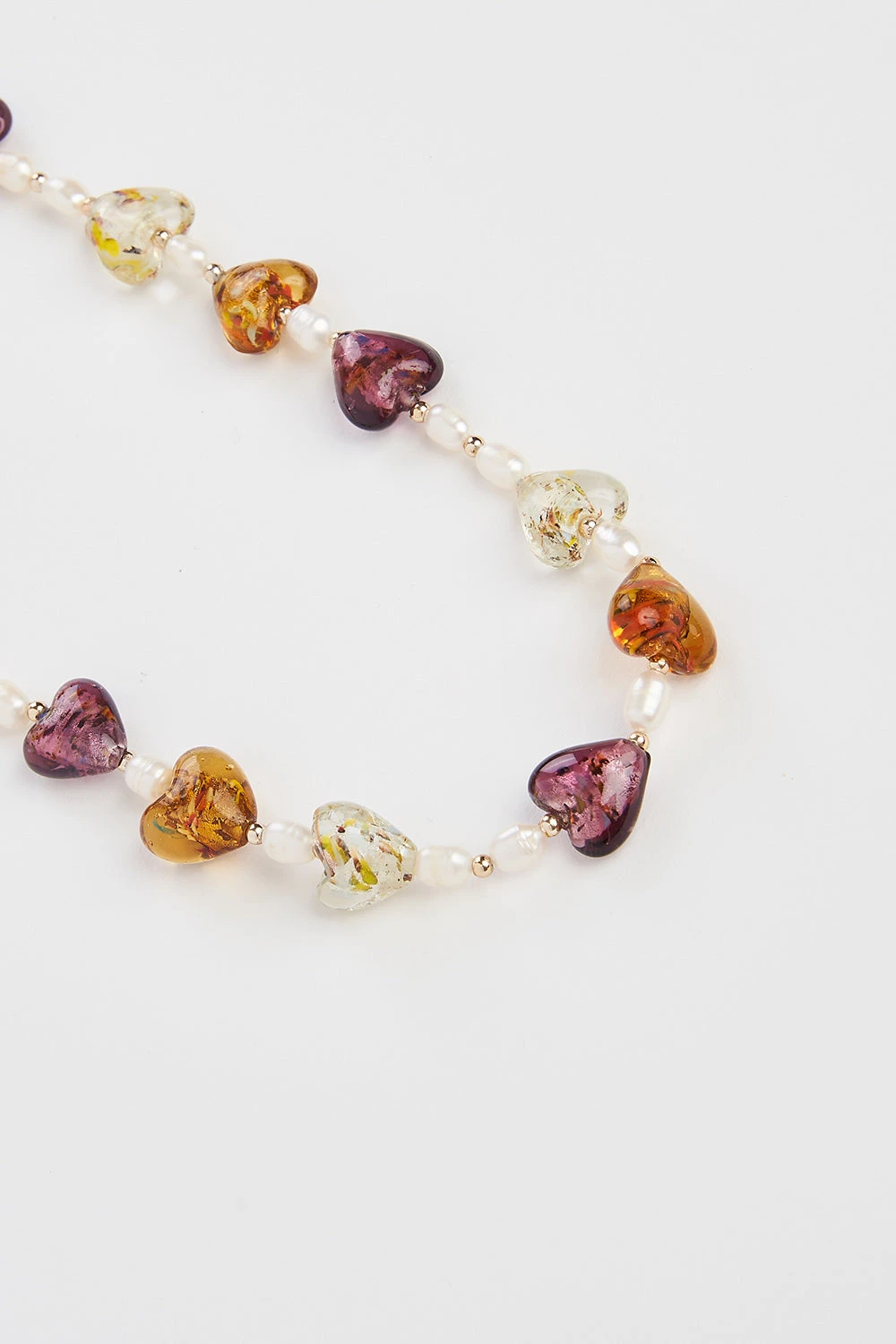 Romance is at the forefront of the design of our Glass Heart Necklace. Crafted using freshwater pearls and translucent heart-shaped beads with a stunning marbled effect, wear this short style necklace with our sweet, Glass Heart Bracelet for the matching set.