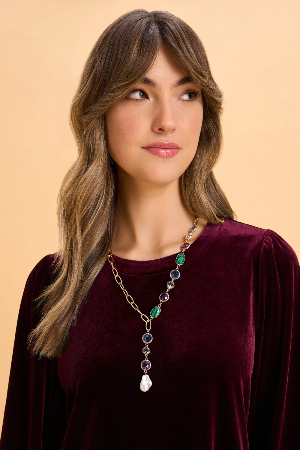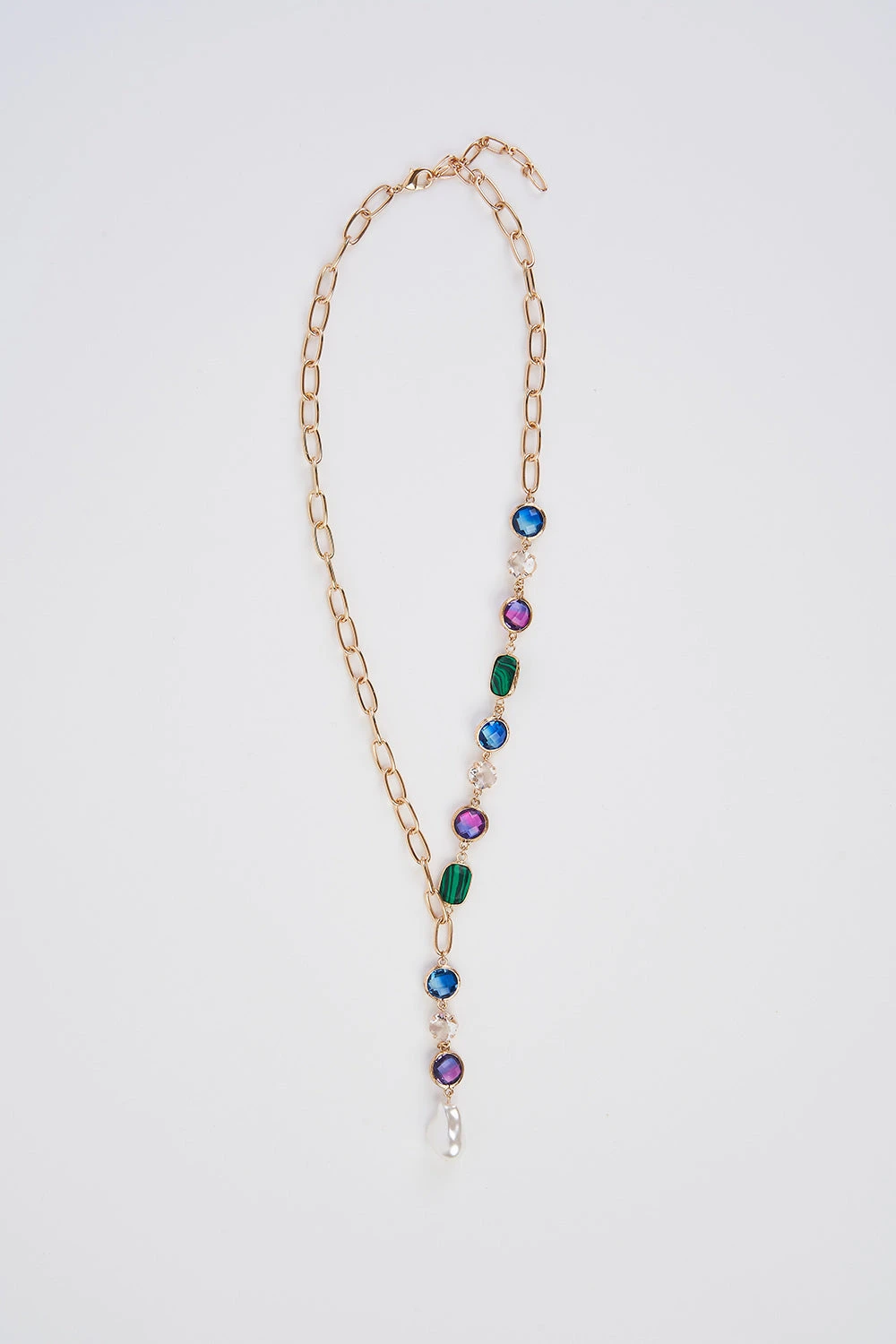 If your eyes light up at the sight of jewels, our Glass Stone & Pearl Necklace is for you. Featuring an organic freshwater pearl drop pendant on a gold trace chain, wear this multicoloured jewel piece over a monochromatic base for an effortless and sophisticated final touch.