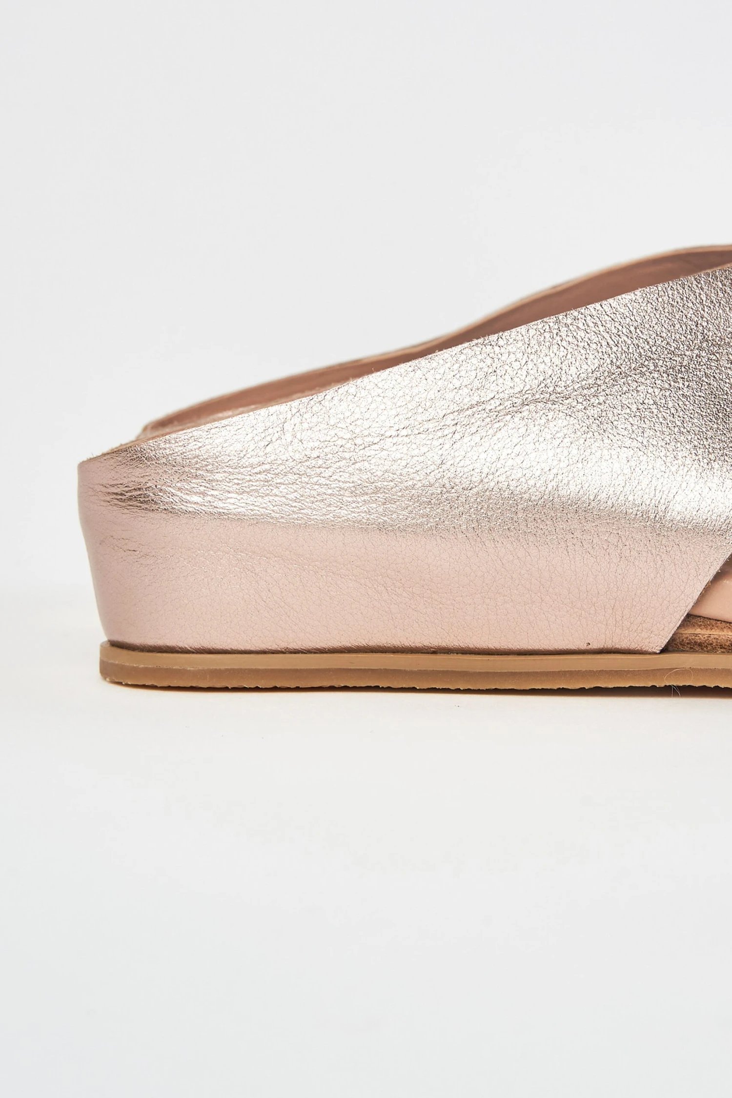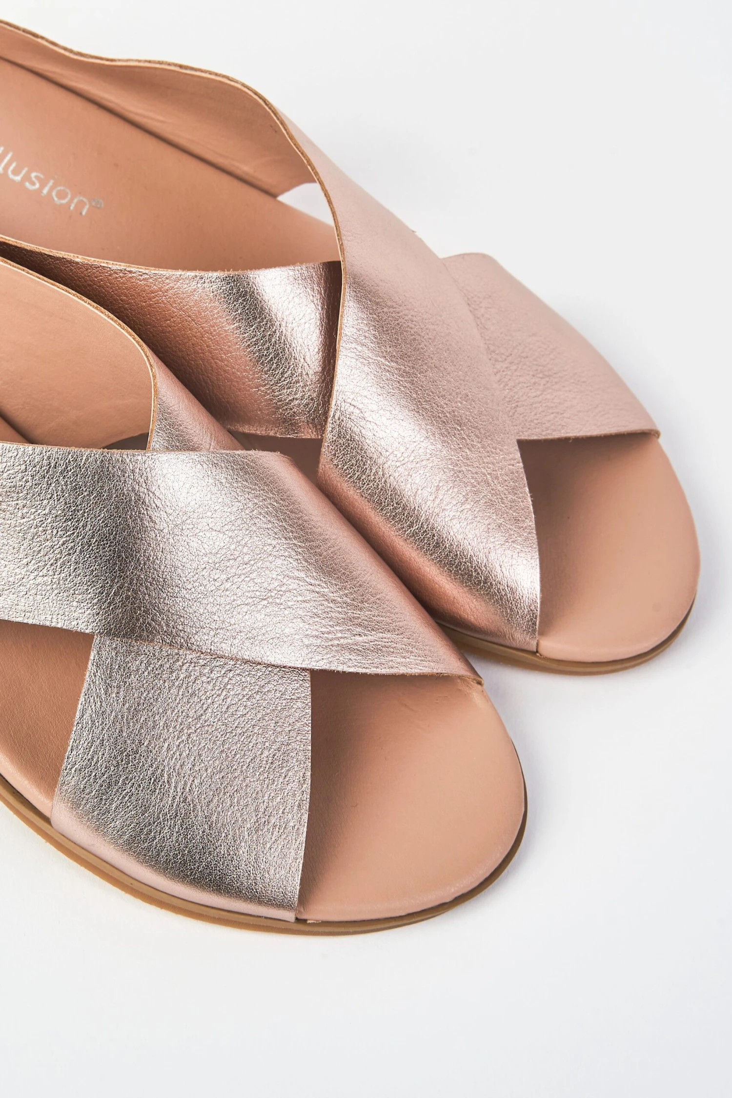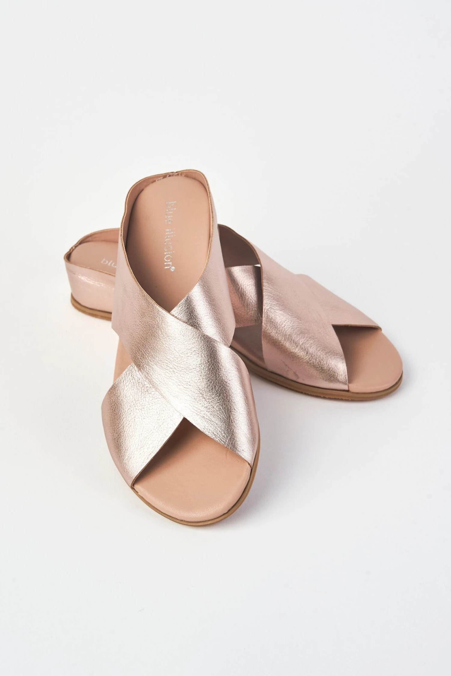 Our Harli Cross Strap is back in shimmering Rose Gold. Add a metallic flair to your look in this much-loved Blue Illusion style. Crafted from authentic leather, this summery sandal features a statement cross strap and comfortable cushioned sole. Wear this flat with our Printed French Linen Dress et voilà.