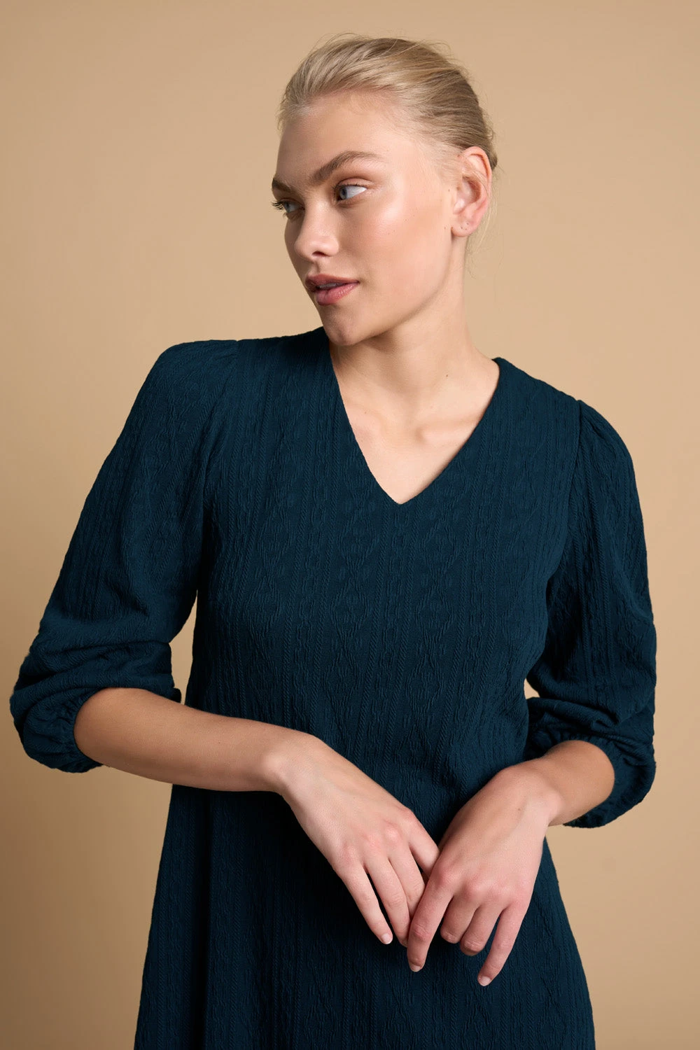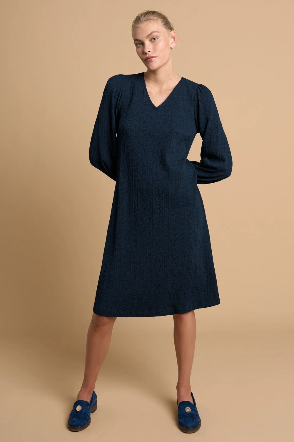 Experience Rue de Bretagne in chic style with our cosy and soft Jersey Swing Hem Dress in Ink. Sitting just below-the-knee, this dress has a flattering A-line silhouette and rounded V neck that is great for winter dressing. Wear it with our cool Iris Ink Loafer for a touch of Parisian spirit.