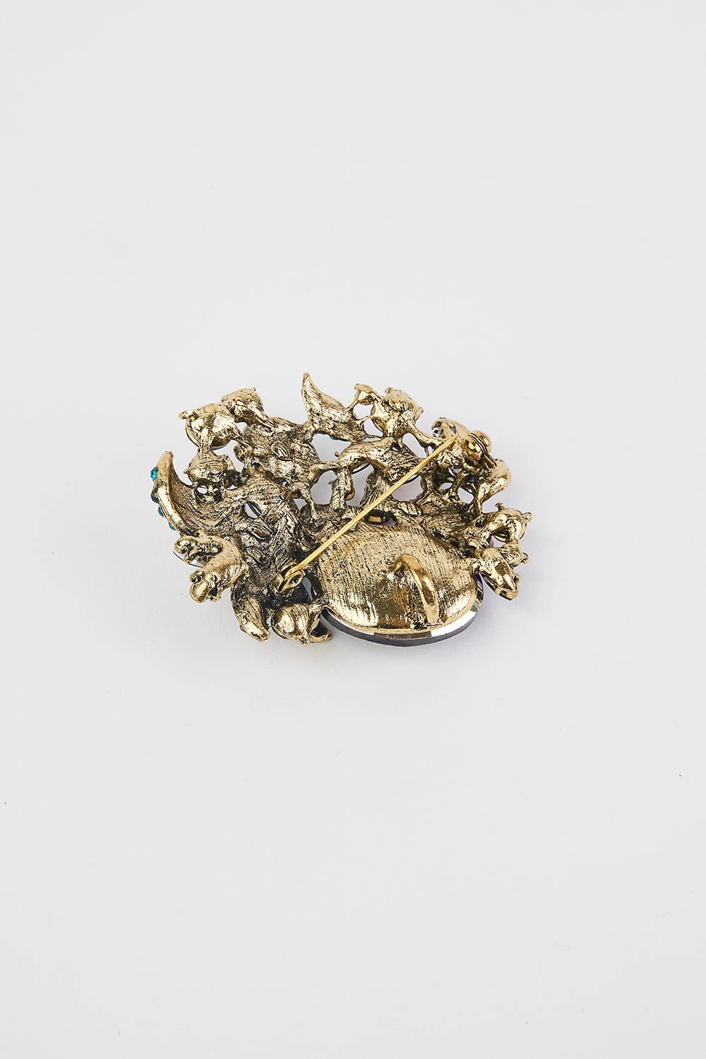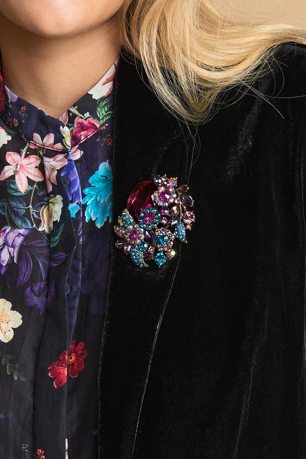 This sizeable Jewel Cluster Brooch will put a sparkle in your day! A collection of turquoise and purple-toned glass stones come together to create a breathtaking statement piece that will pop against your favourite French-inspired poncho, blazer or knit dress.