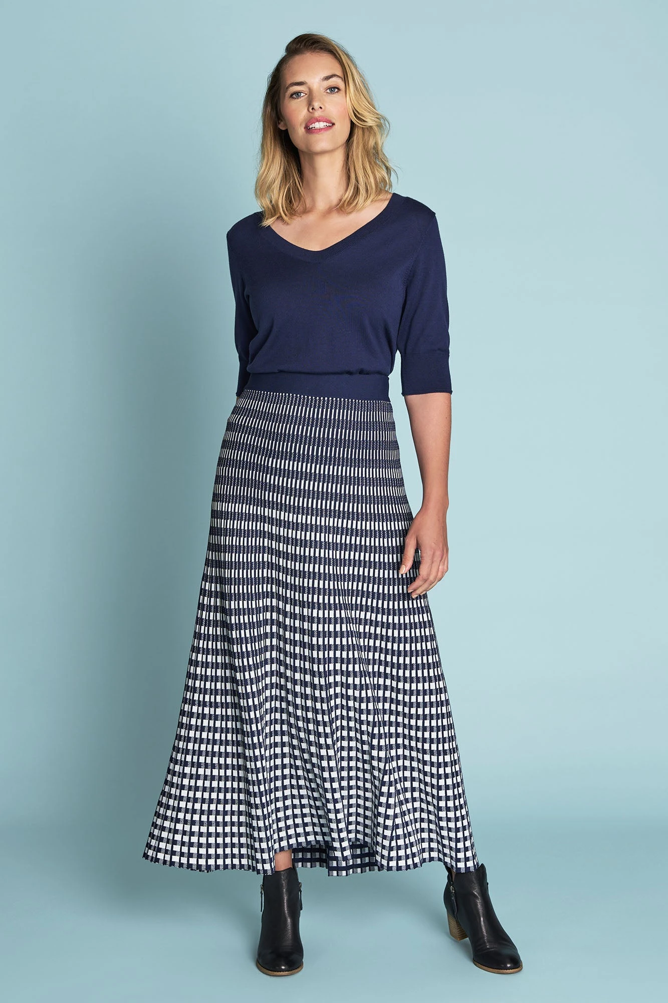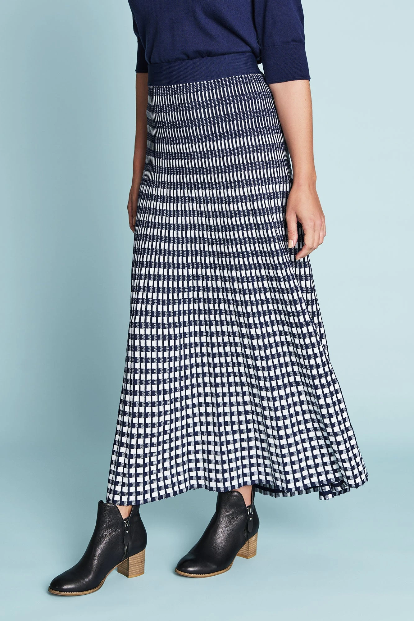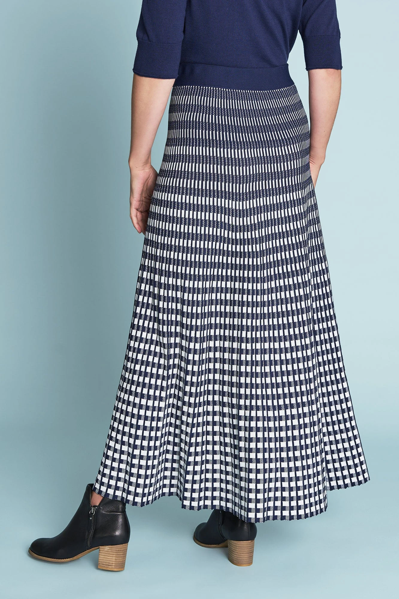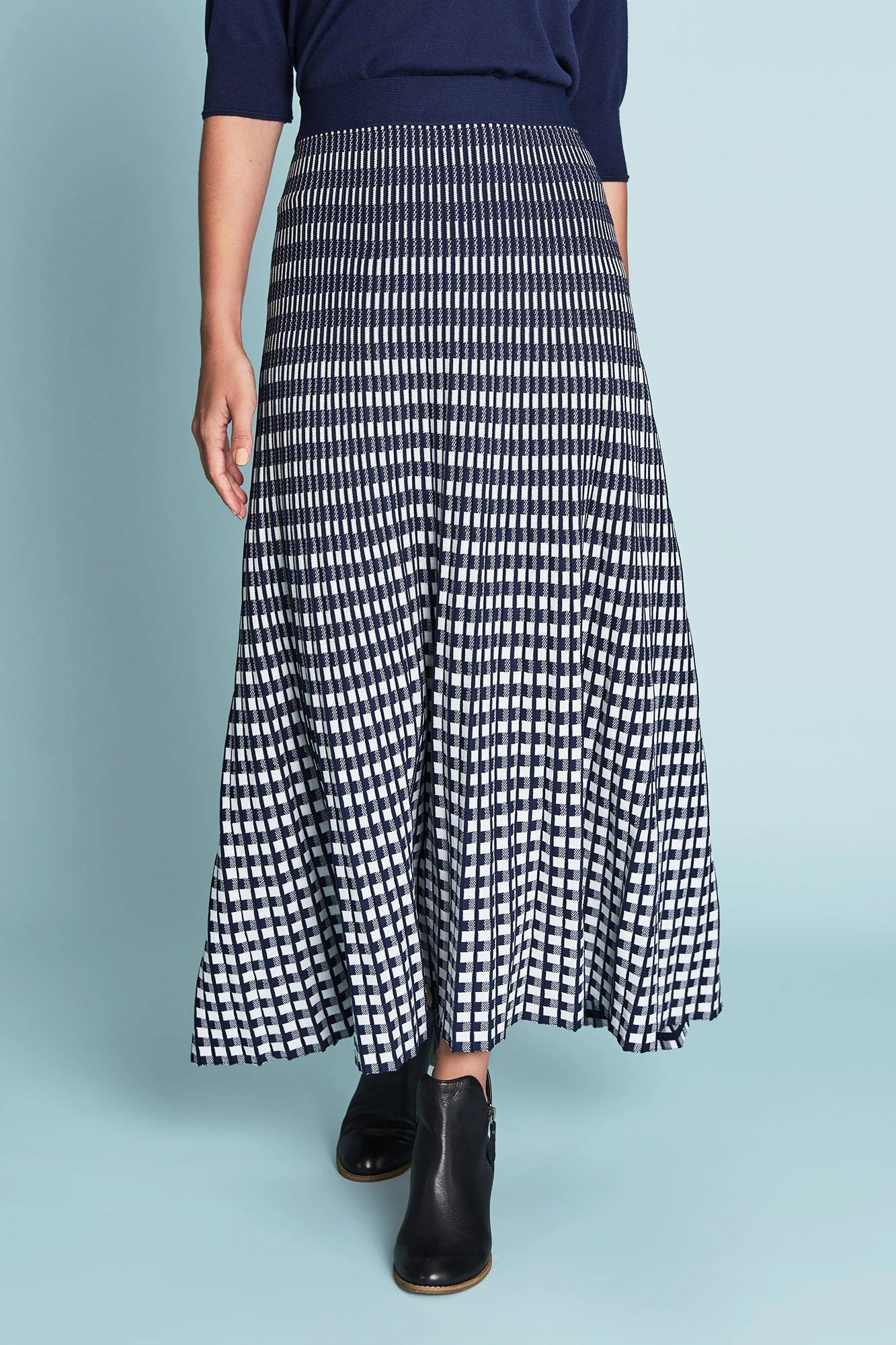 With a classic Check pattern, this Knit Midi Skirt in Navy and White has a flattering A-line silhouette. The ultimate in Parisienne style, this skirt is a great transeasonal piece. Pair it with our Half Sleeve Wool Knit for something français, or add a pearl-based accessory.