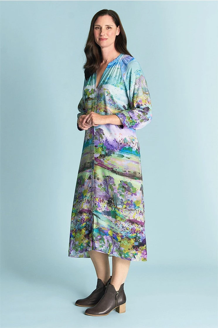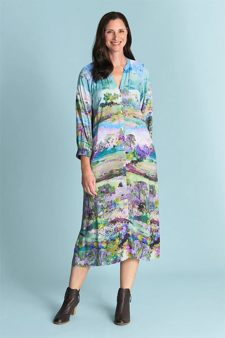 Like wearable art comes our Landscape Print Shirt Dress. Featuring the Painterly Landscape print of our Rue Chanoinesse collection, this midi-length dress is lightweight and features a ¾ sleeve and side pockets. This beauty is ready to be dressed up or down.