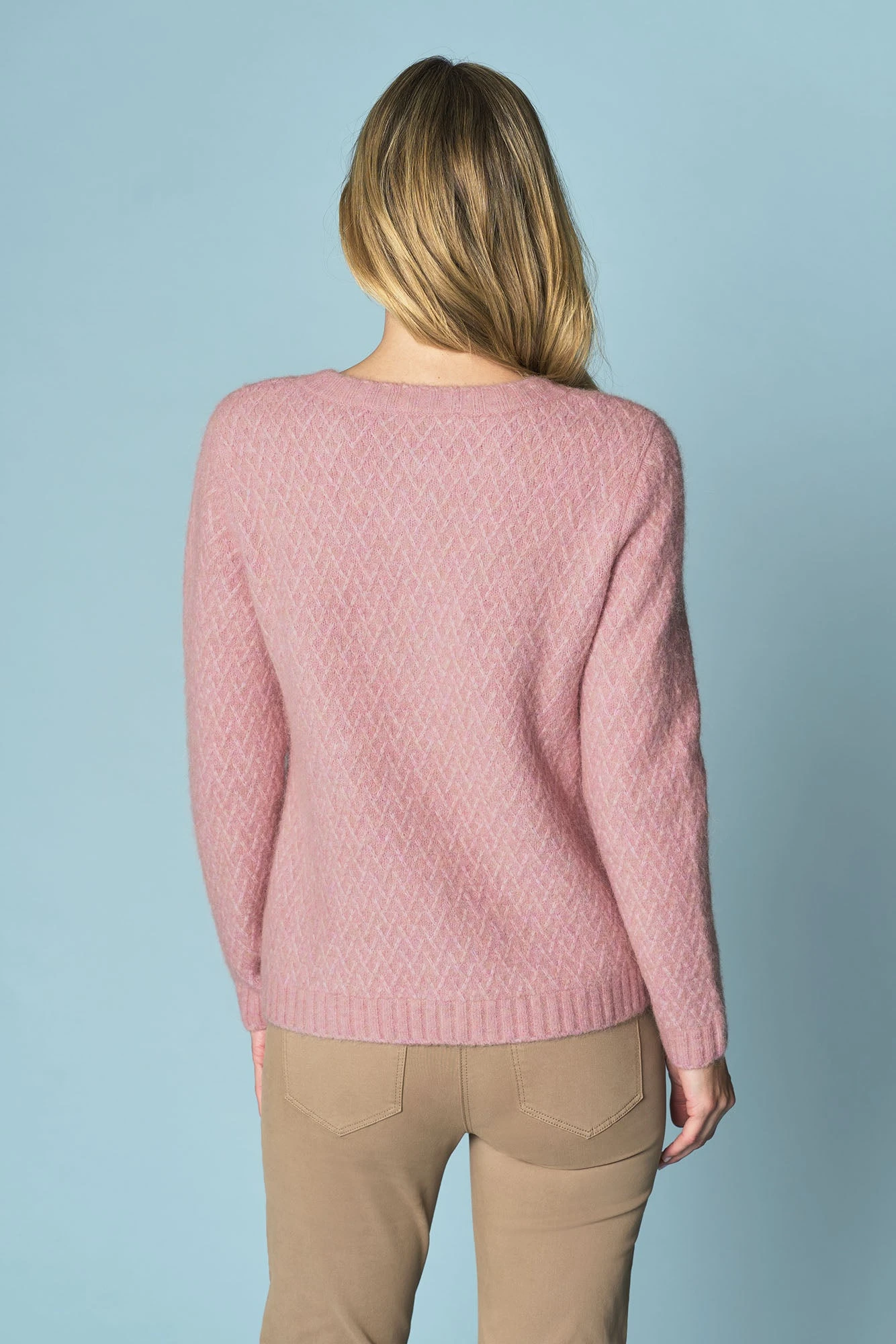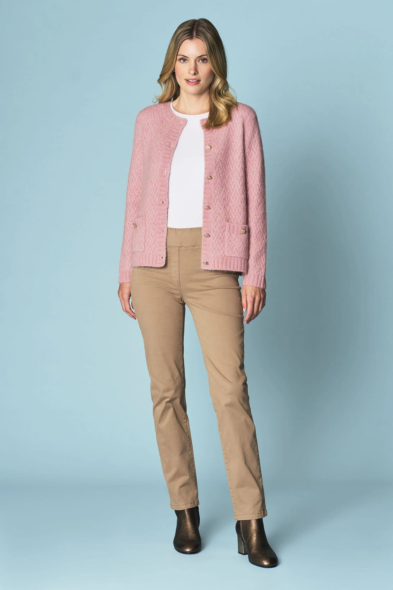 Comfortable, ultra-soft and showcasing a sweet design, our Lattice Jacquard Cardigan features a multidimensional coloured marle effect in Dusty Rose. With statement gold buttons, patch pockets and a lovely lattice stitch pattern in an overall neat fit, this cardigan is crafted from natural fibres of luxurious alpaca wool blend.