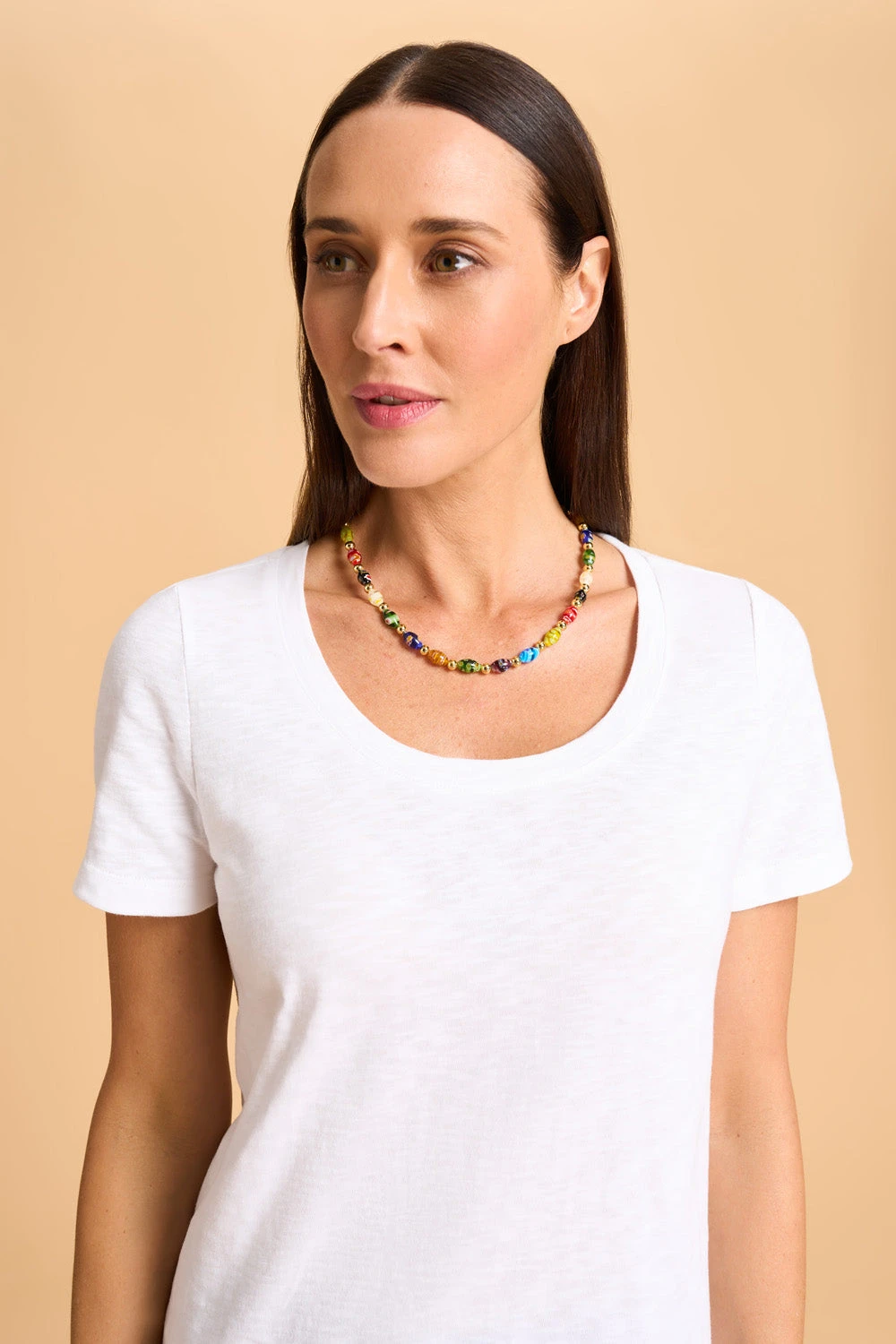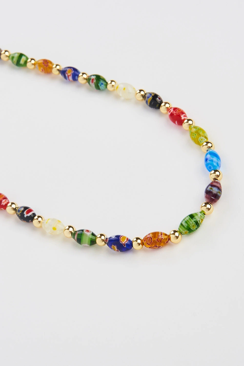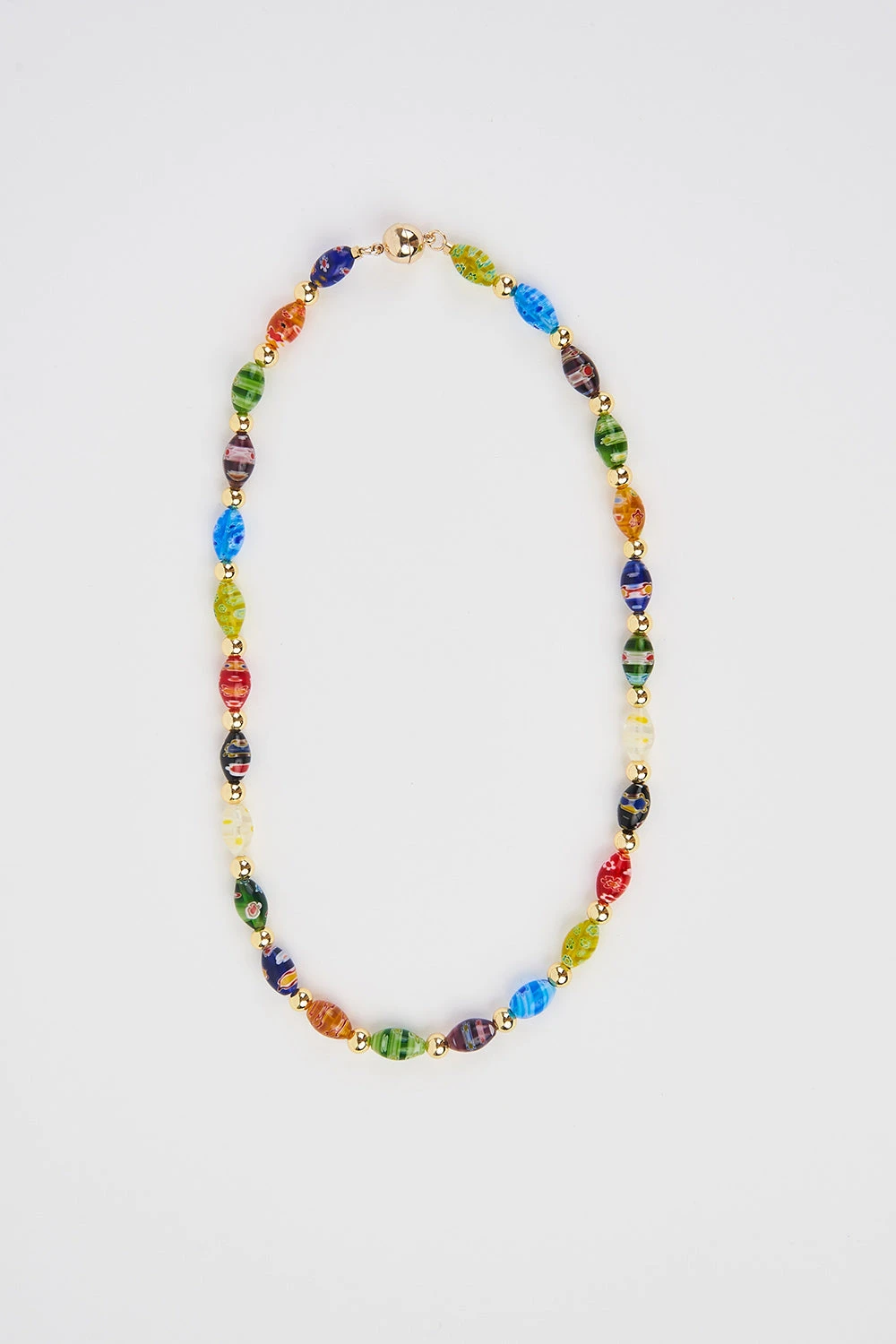 A magical creation of multicoloured glass beads, you will fall in love with our Les Ovales Necklace. As the name suggests, this necklace showcases oval shaped beads and will pop against monochromatic or block-coloured tops. Create a dynamic duo with our Les Ovales Bracelet.