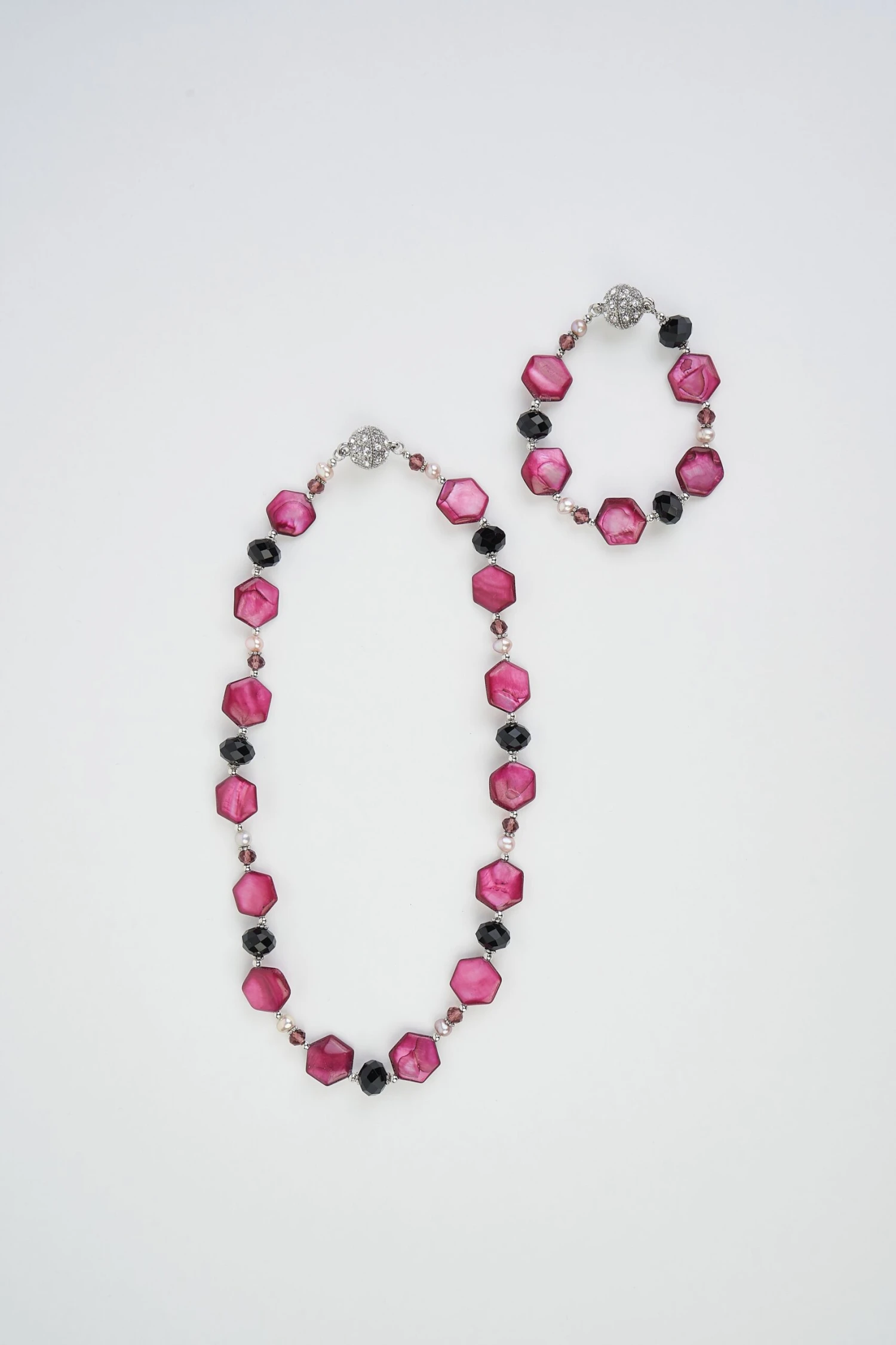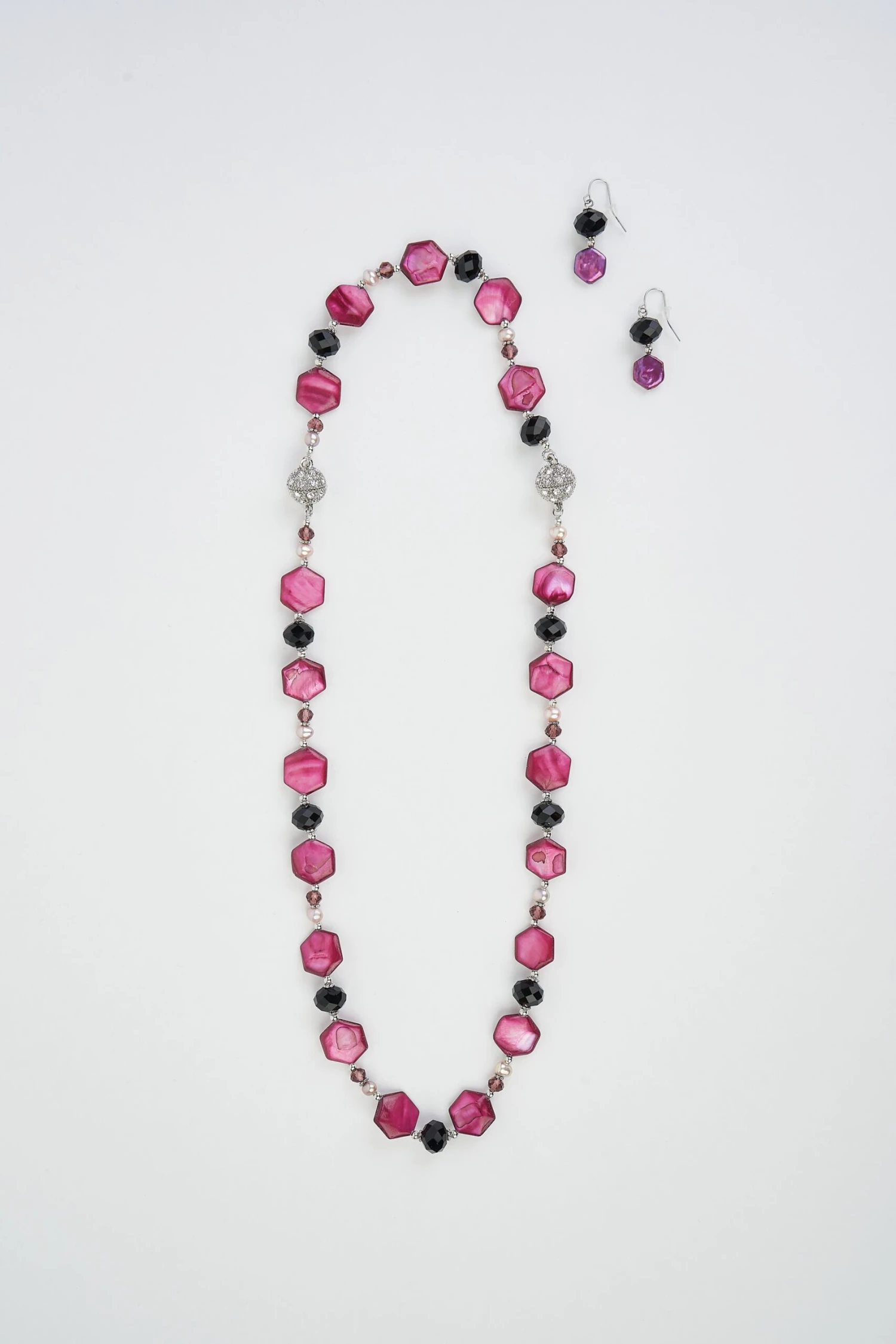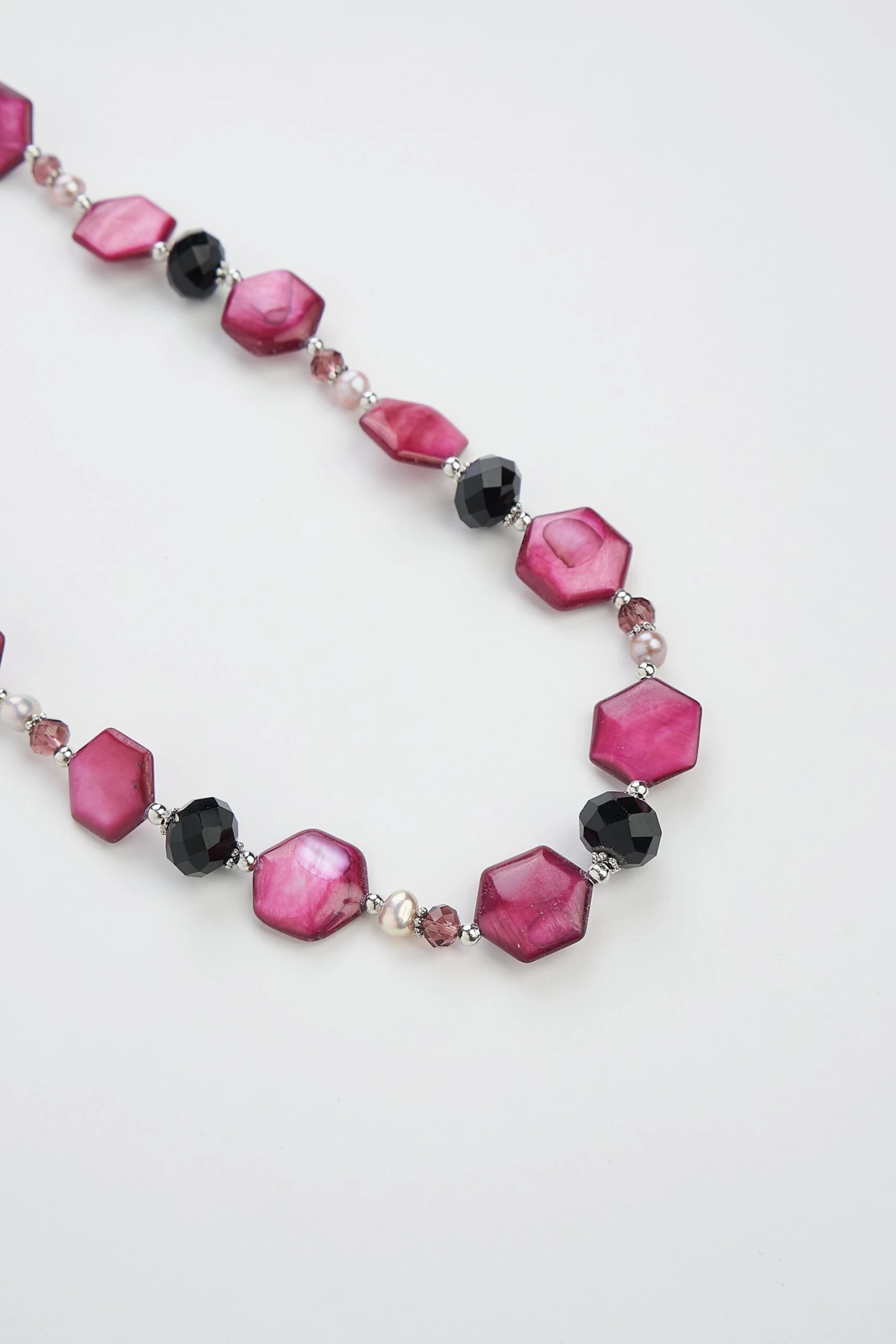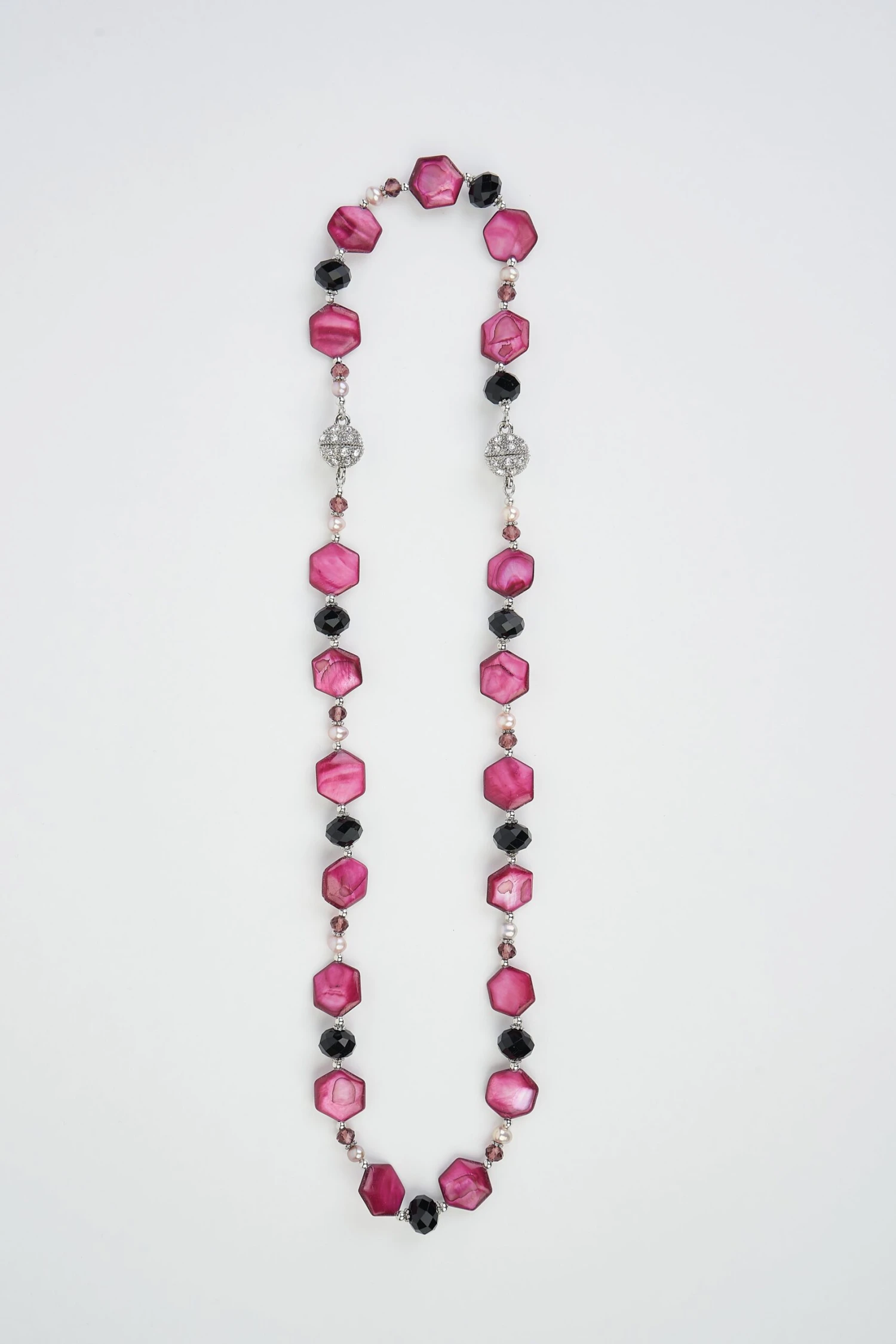 Shimmer in this beautiful Monaco Shell 2 in 1 Necklace. A beautiful accompaniment to our Monaco collection, wear these pieces together as an elongated necklace or separate the pieces for a matching bracelet and necklace set. Featuring black and bronze glass facet stones, hexagonal shell beads and champagne pearls, this necklace evokes the feel of the French Riviera and its beautiful coastline.