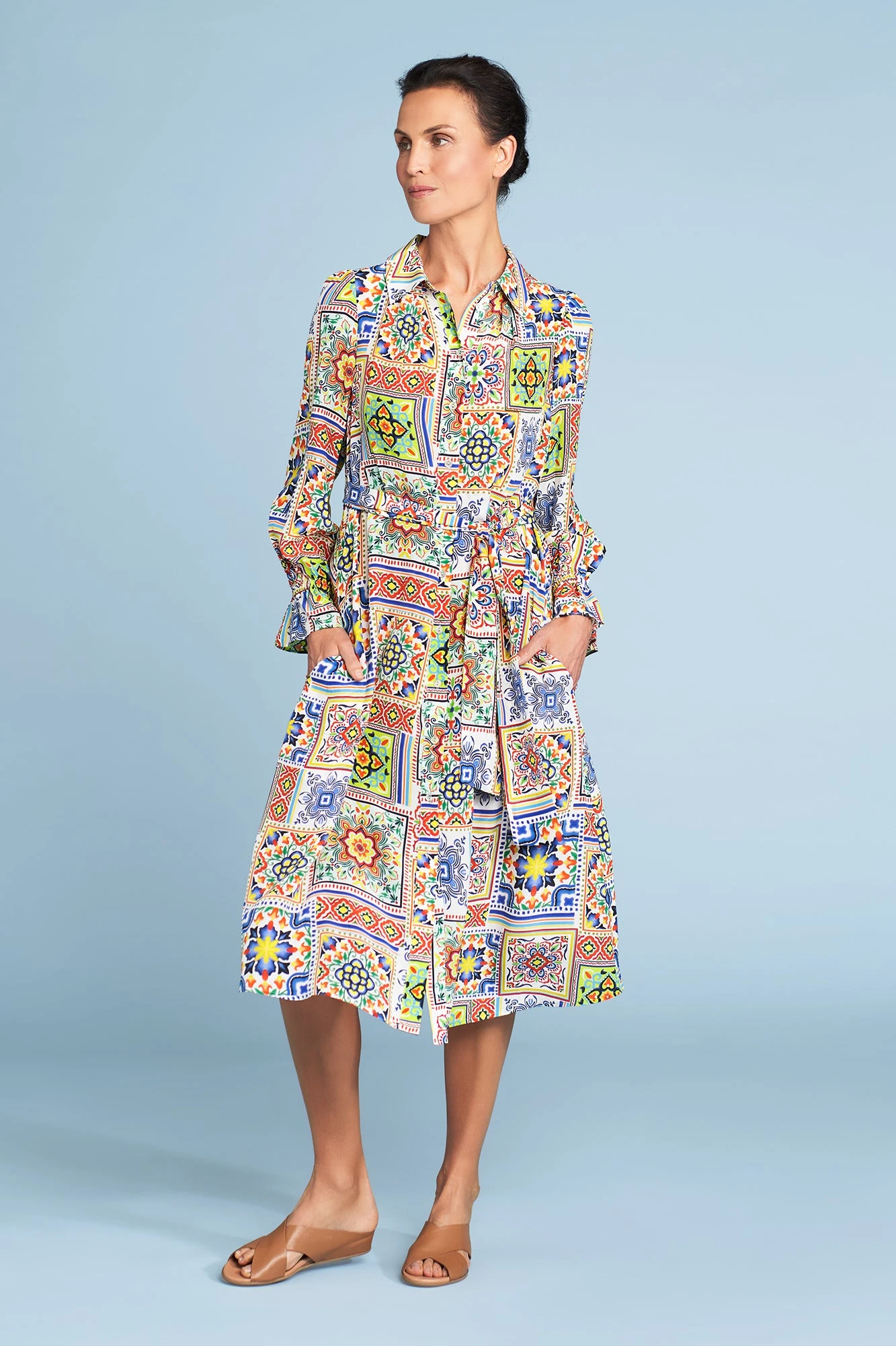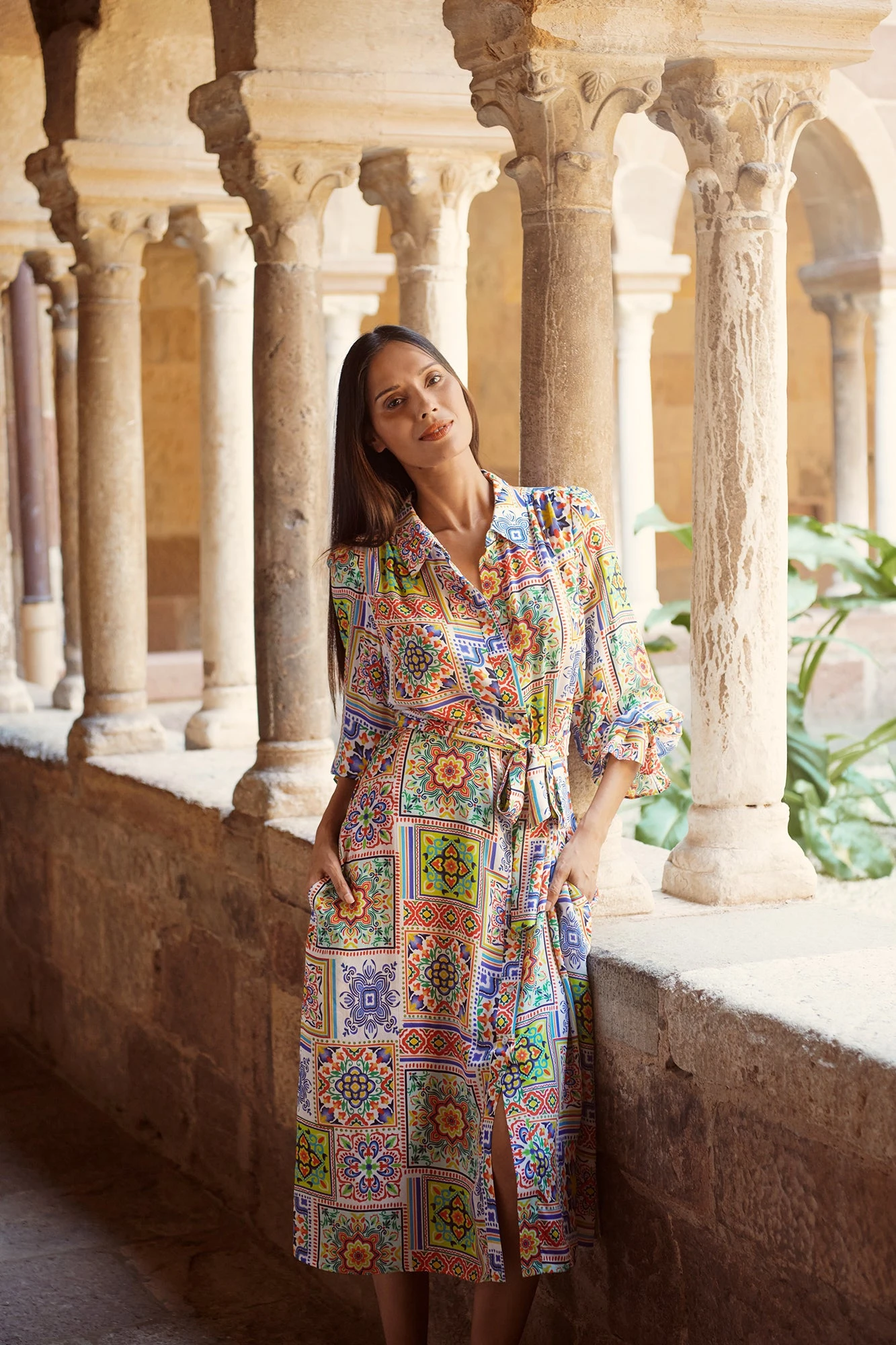 Turn heads in this 100% silk dress. This midi-length dress features the colourful Moroccan Tile print. It offers a complete button through placket and removable tie, making it versatile and ideal for any occasion. Fasten the tie around your waist for a flattering silhouette, wear the dress open with your favourite Bengajean® and top combination, or drape the tie around your neck or wear it as a matching headband!
