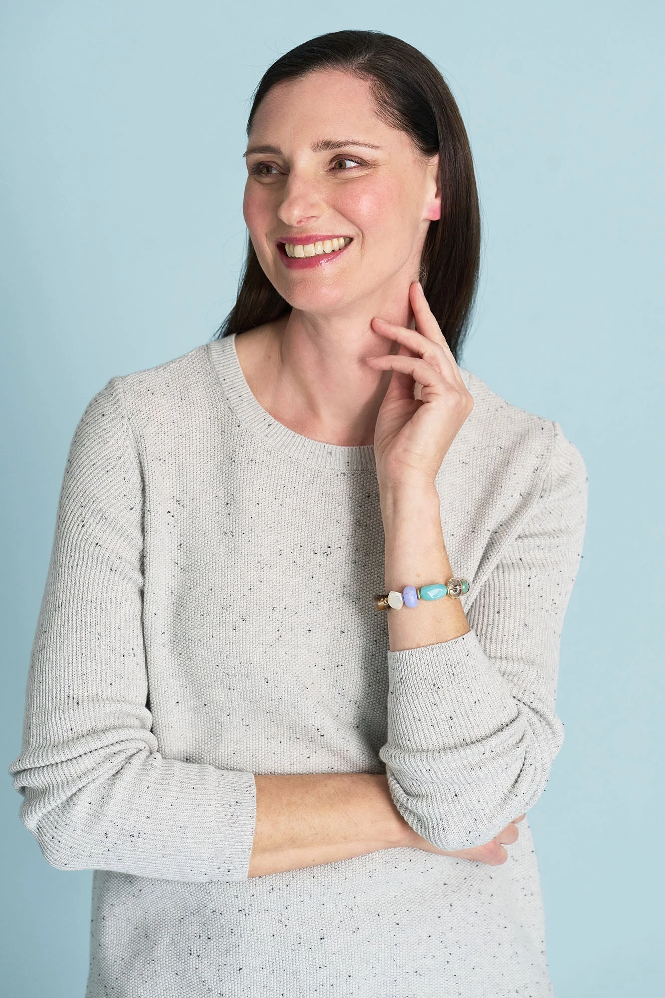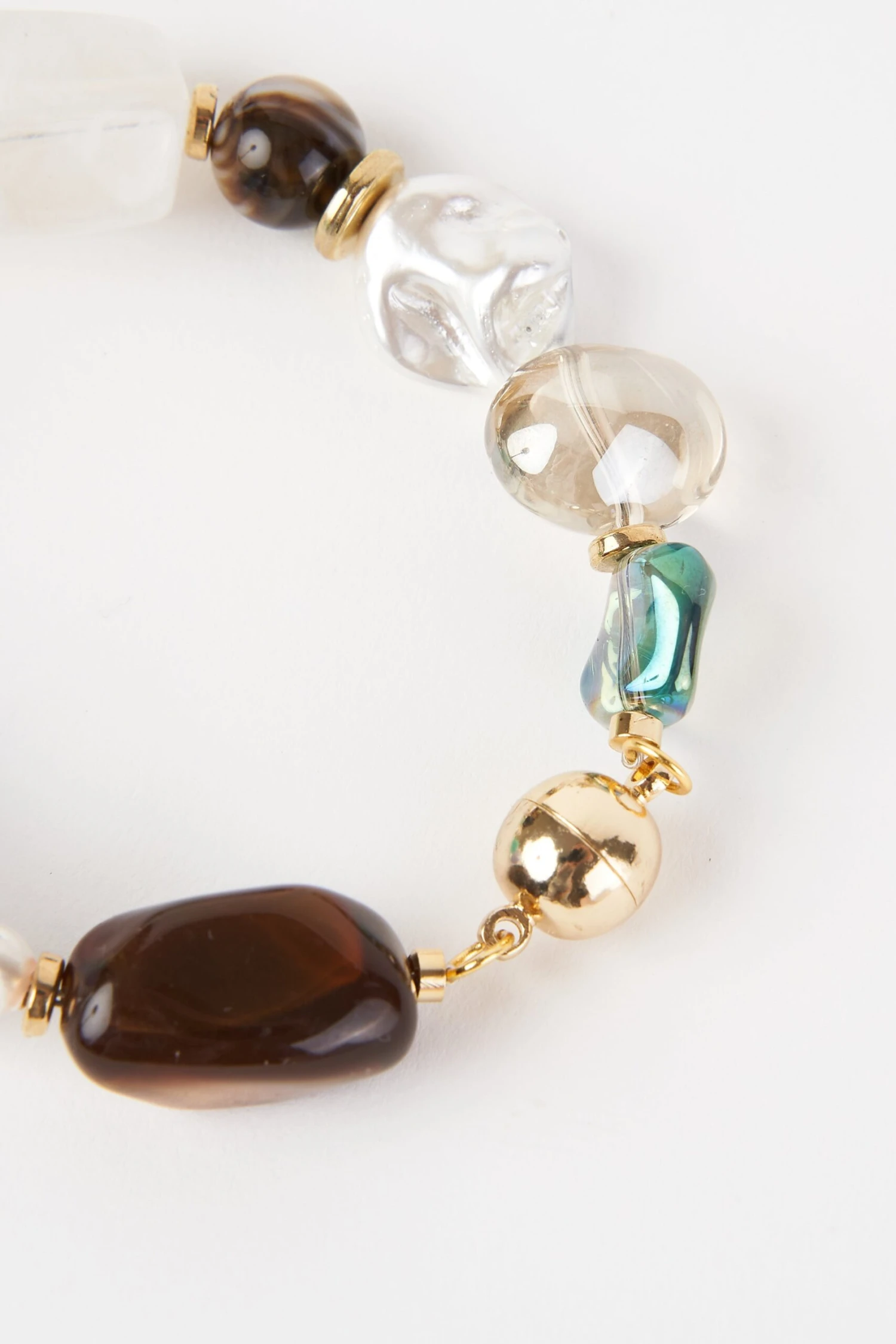 Give your outfit that extra lift with our Multi Bead Bracelet. Featuring abstract coated pearls and statement glass beads, this bracelet is perfect for making a neutral outfit shine. Match this bracelet with our Beaded Collar Necklace to complete the set.