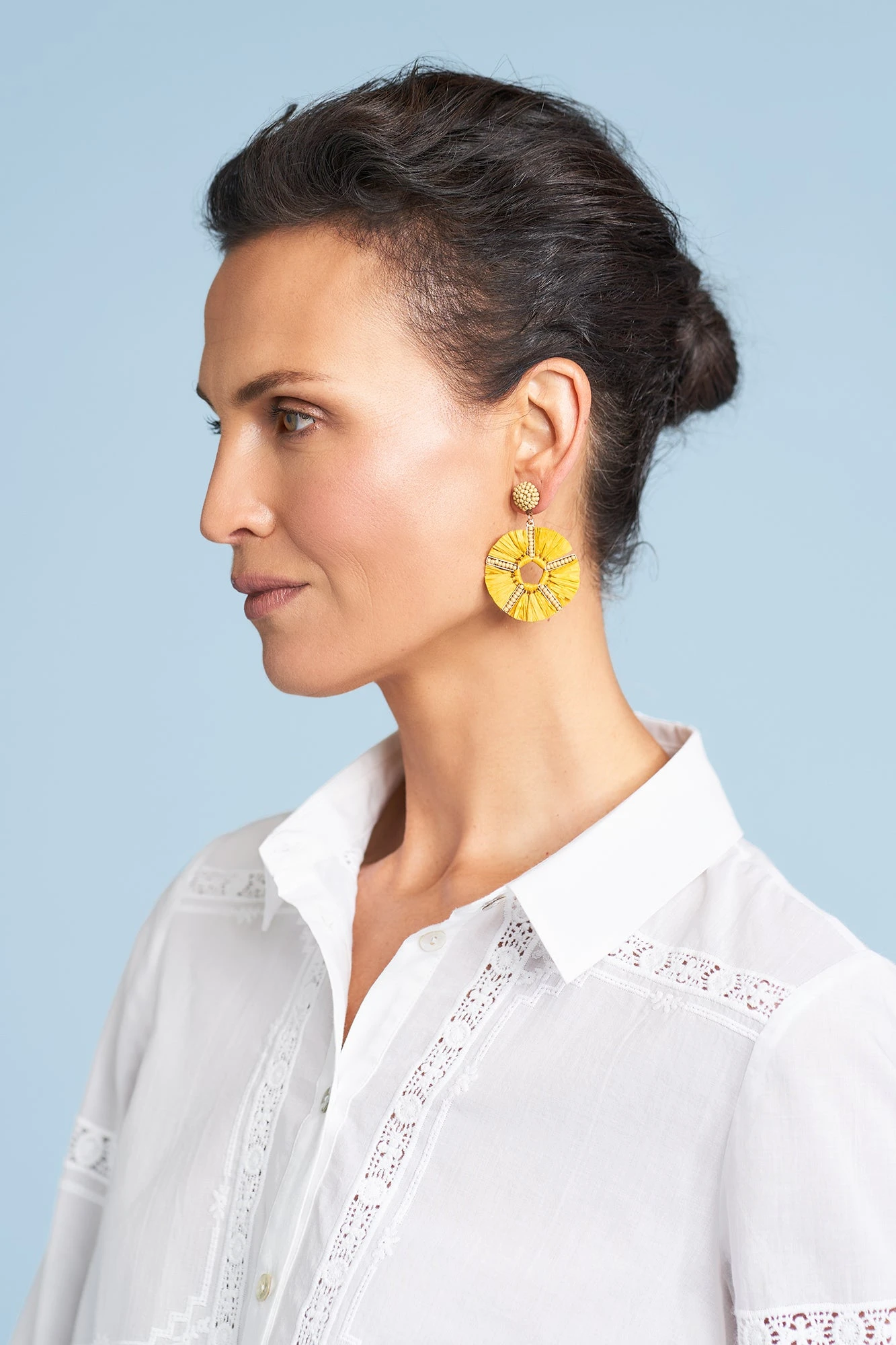 Bohemian inspiration comes to life in our circular shaped Mustard Fray Earrings. Crafted from paper making them incredibly lightweight, these earrings feature an intricate seed bead design and offer lovely movement for the wearer. A mesmerising accessory packed with personality.