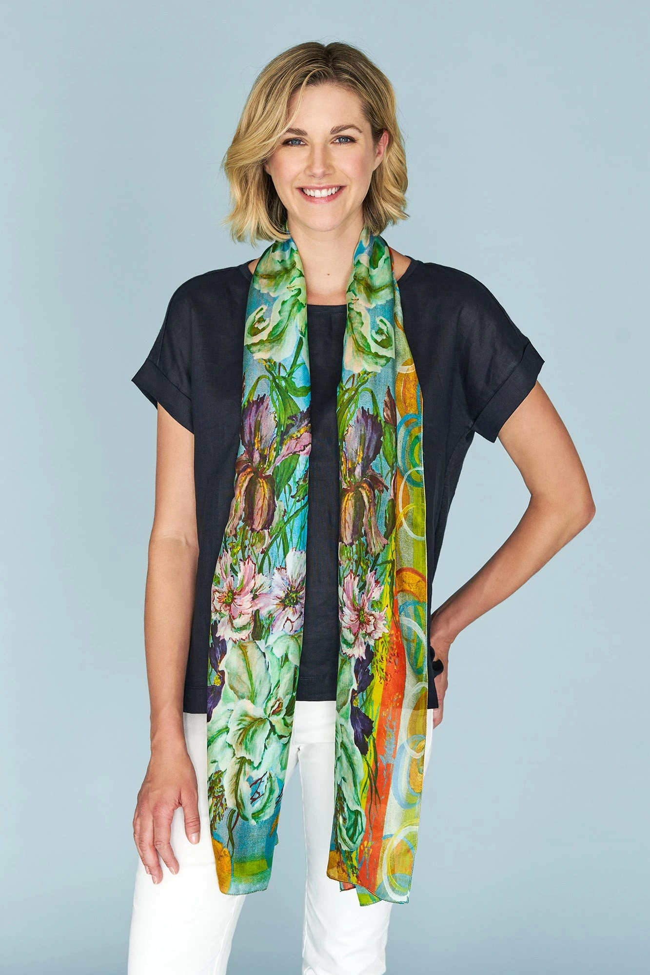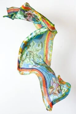 Make a splash with the multicoloured Orchid Blooms Scarf. Crafted from 100% silk habotai this scarf is luxuriously soft and lightweight and features a beautiful floral design with border print.