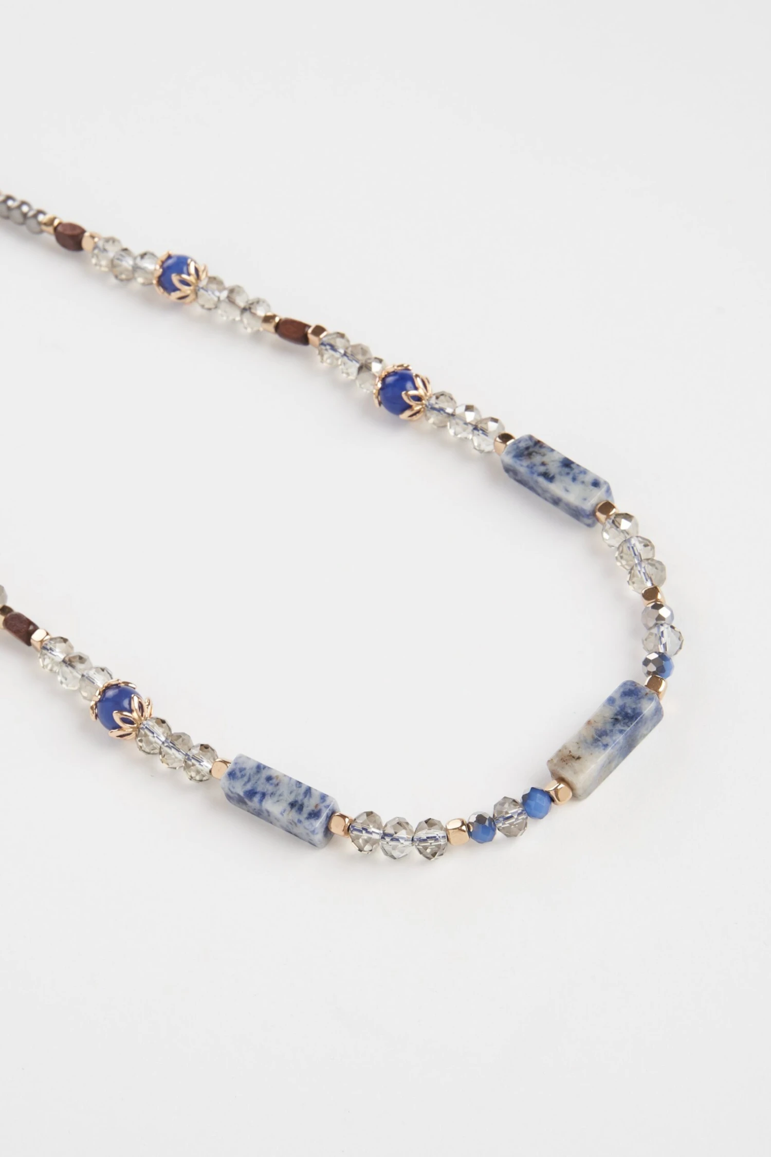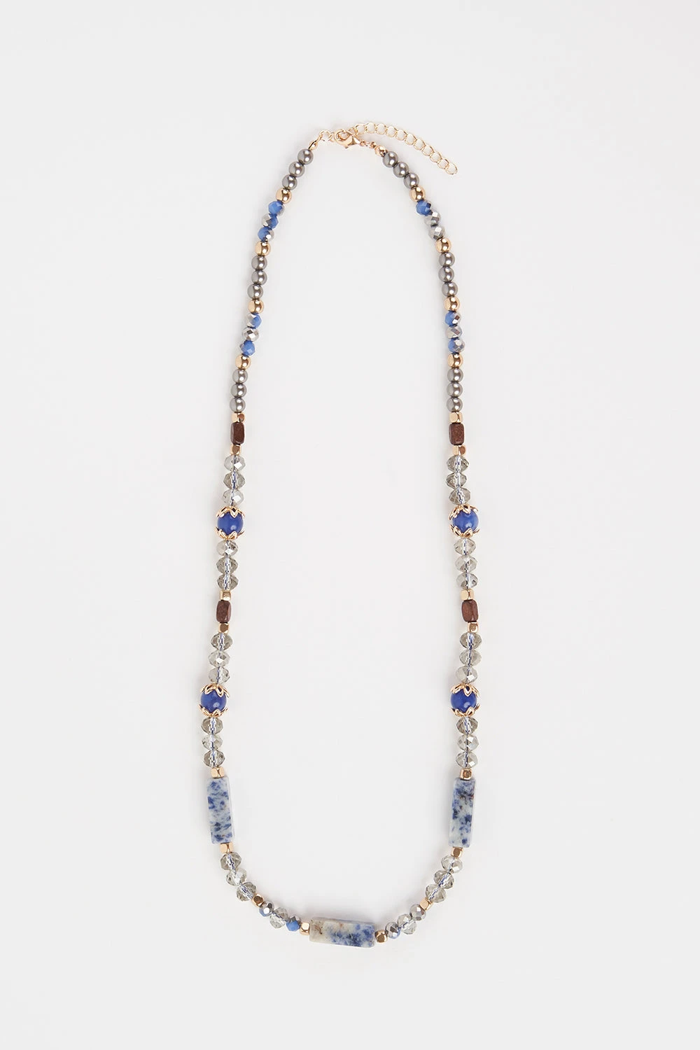 On a long sparkling strand, this necklace is made up of colourful beads in a range of sizes and materials including wood, glass and stone. Wear it over your favourite top or blouse, for a stylish layered look.