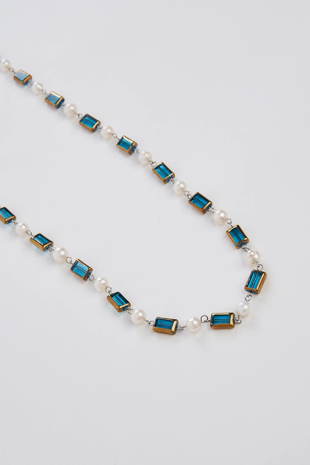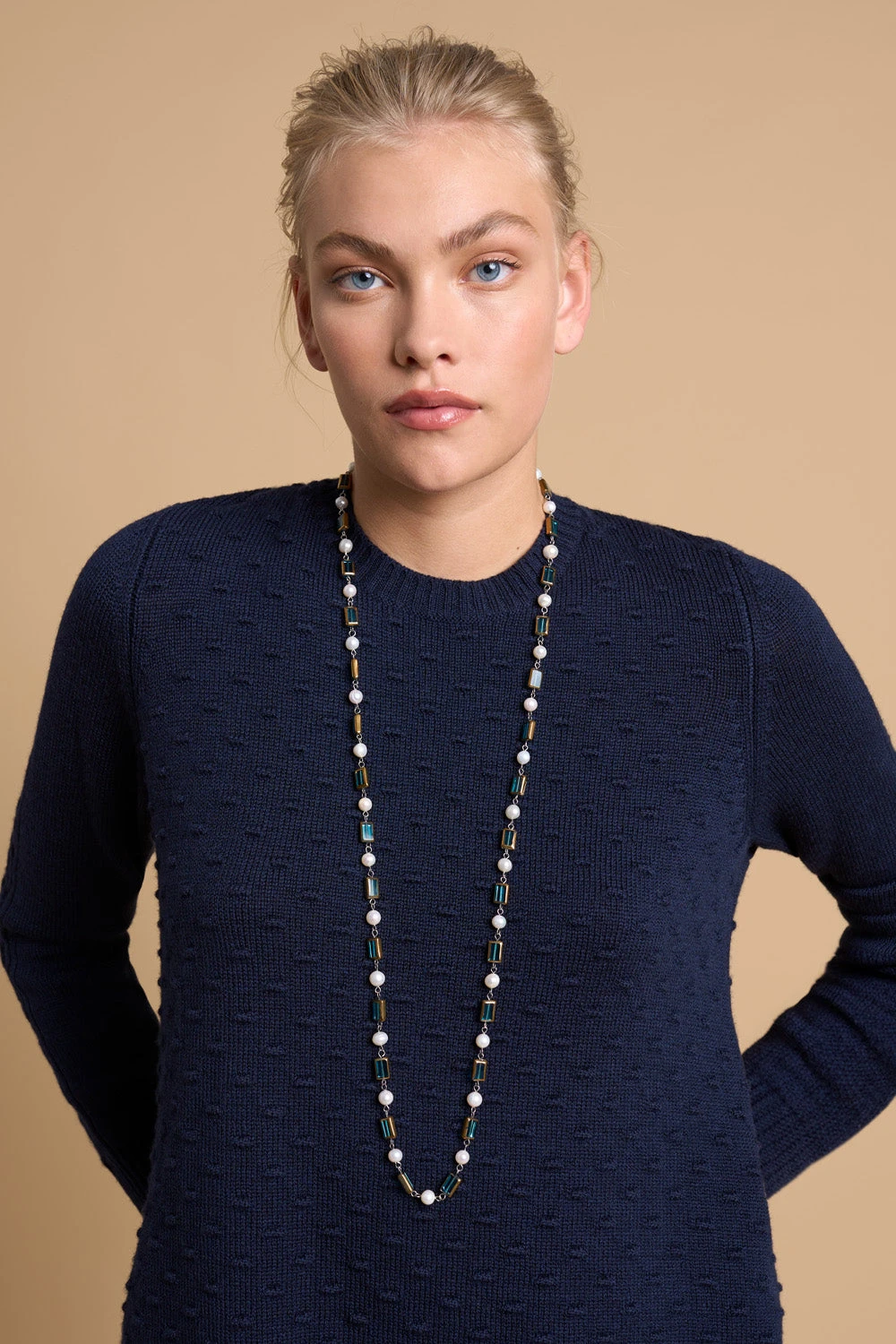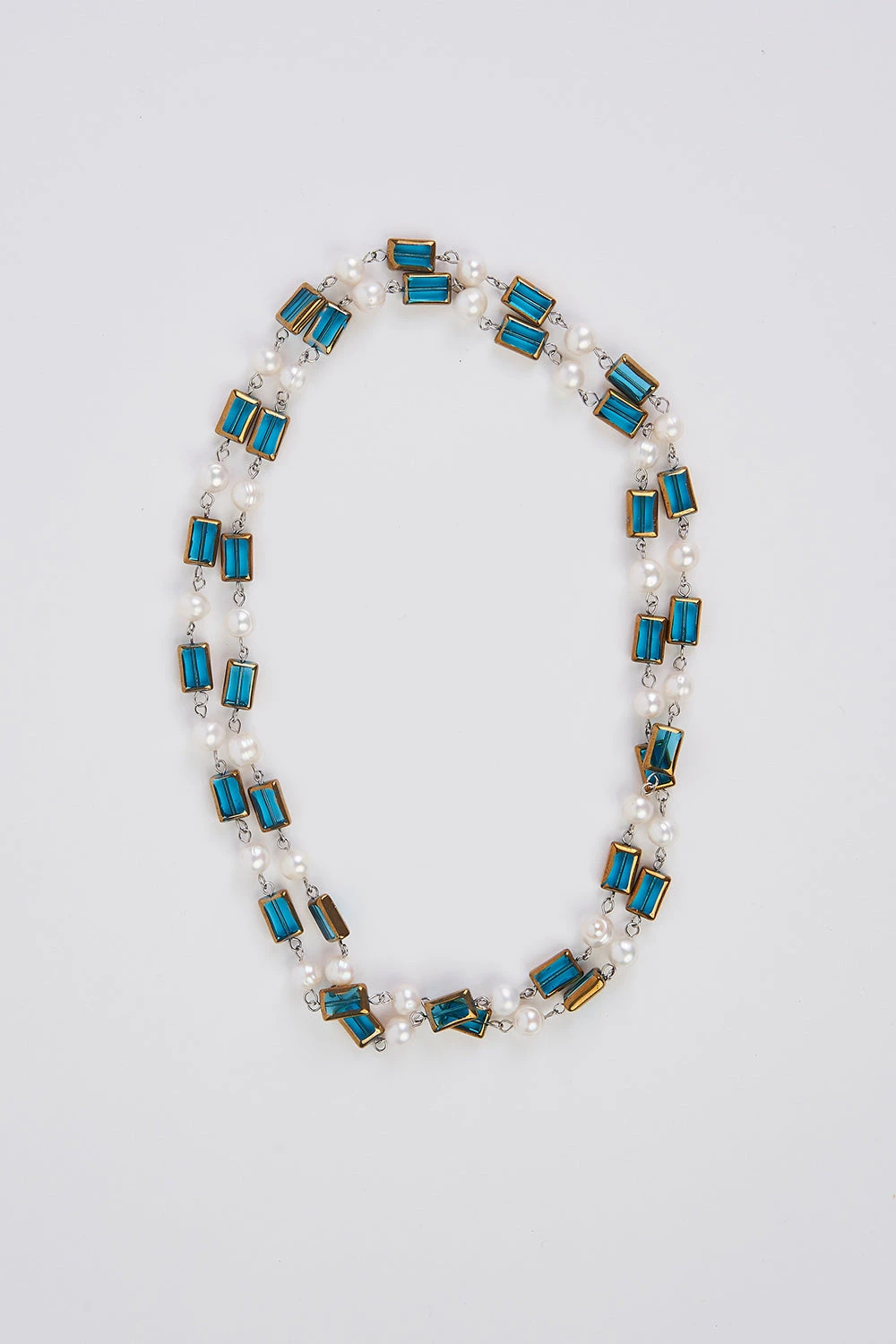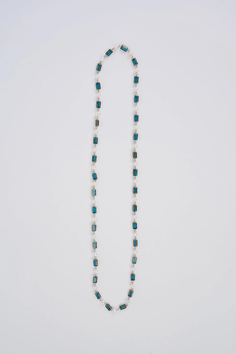 Alluring tones of turquoise shimmer in our Pearl and Stone Necklace. Showcasing freshwater pearls and Aquamarine glass beads encased in antique gold, this is a long line necklace that beautifully complements the jewel tones of our Rue de Bretagne collection.