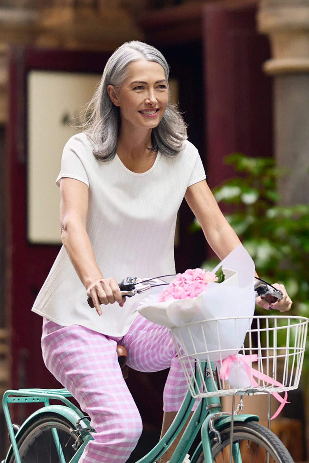 Feminine style is at the forefront of our Rue Crémieux collection with the gorgeous textured Peplum Knit Top in White. Featuring a short cap sleeve, round scoop neckline and subtle peplum hem, this top looks fabulous when paired with our 7/8th Linen Gingham Pant in Pink and White.