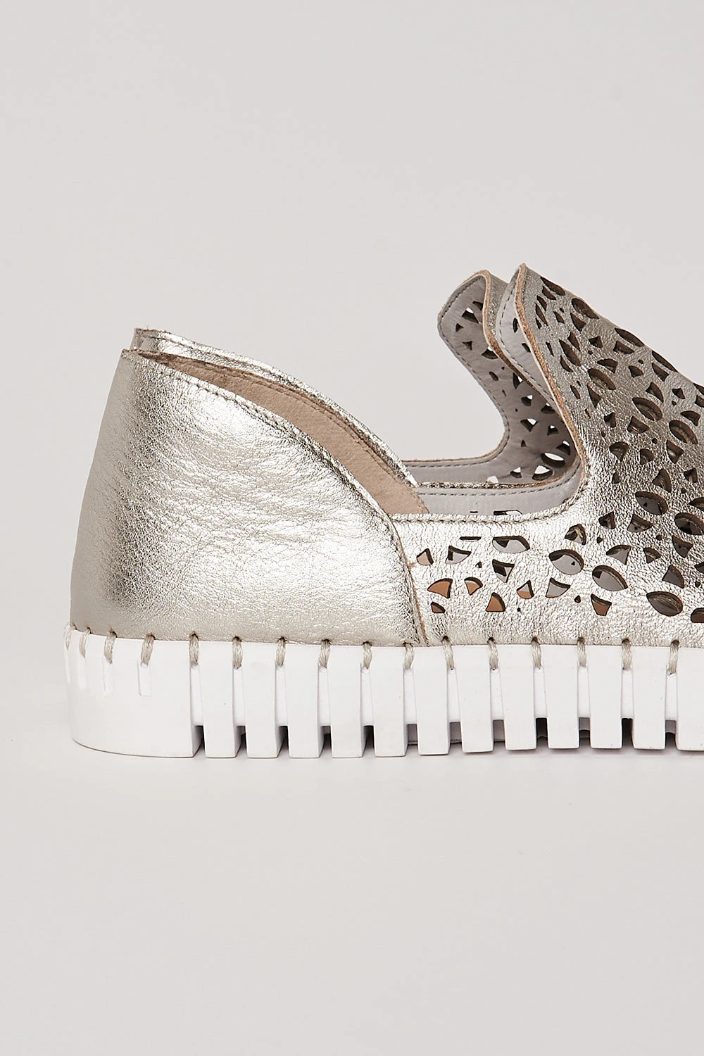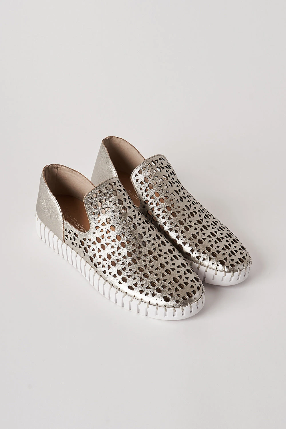 Stay ‘one step ahead’ of the trends with our Piera Cut Out Plimsol. With the comfortable platform you love and featuring metallic laser cut detail, this plimsol is breathable, soft, lightweight and bendable meaning it will easily take you from day to night.