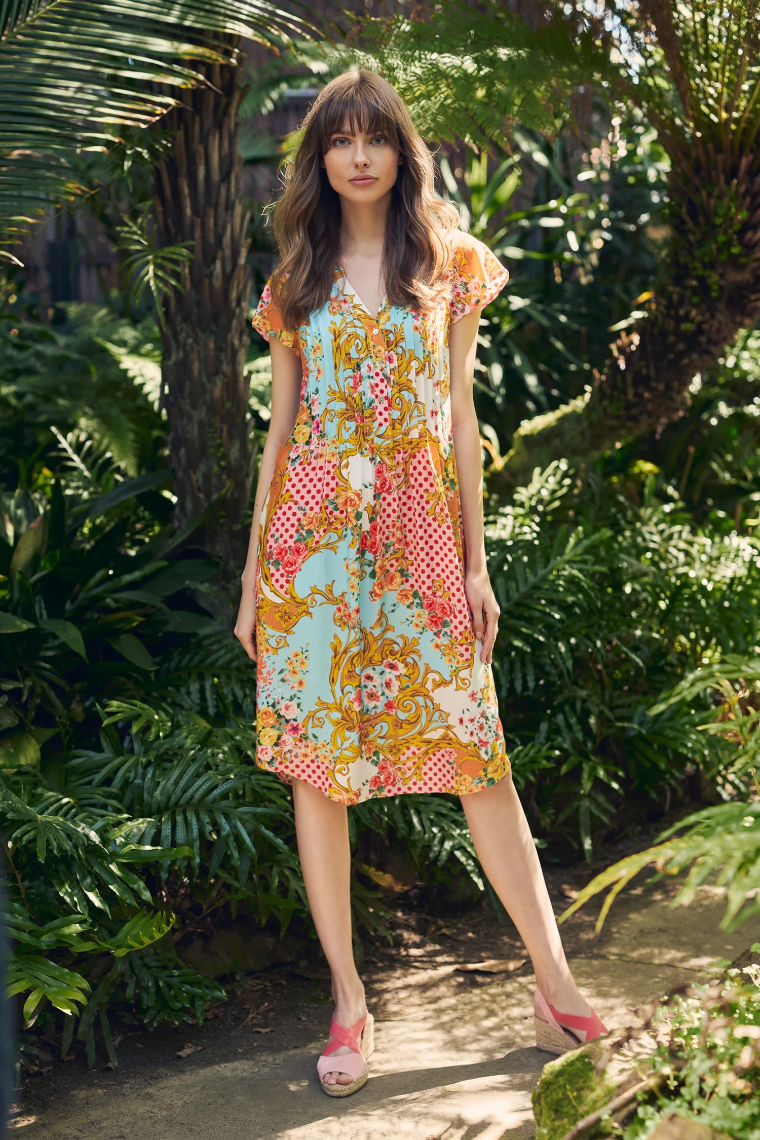 In celebration of our Camargue collection comes our soft-touch Pleat Front Midi Dress. In a new design, this ultra-comfortable, midi-length dress features delicate pleat detailing along the front and back bodice. Delight in the vibrant Camargue Bloom print with its paisley and polka dot patterns and wear this dress with our Santa Monica Peep Toe Espadrille for a complete summer look.