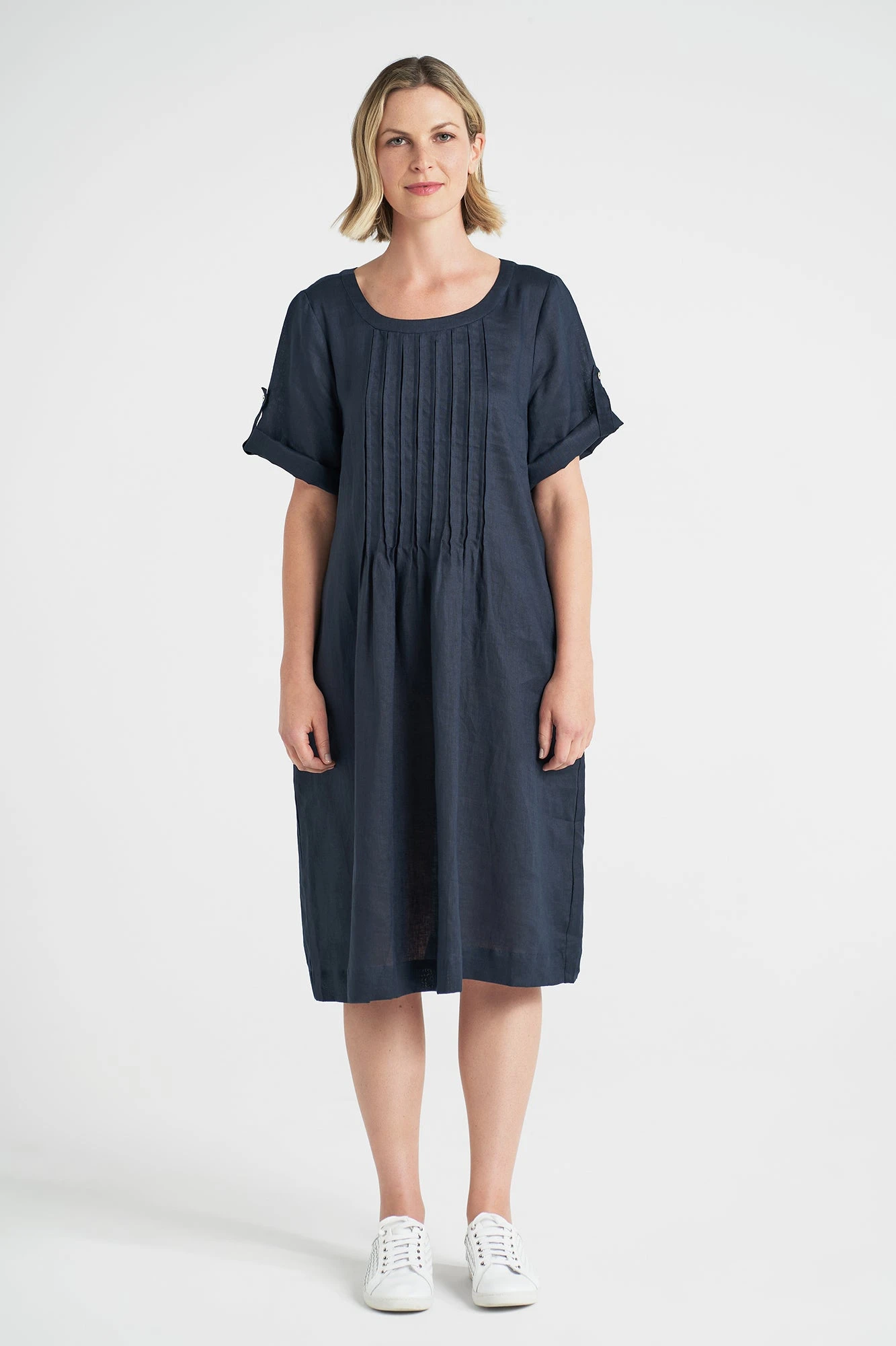 Crafted from 100% French linen, this casual dress will become an everyday favori. Durable yet soft with a beautiful drape effect, this dress offers a smart short sleeve with optional rolled sleeve tab, comfortable round neckline and elegant pleat detailing.